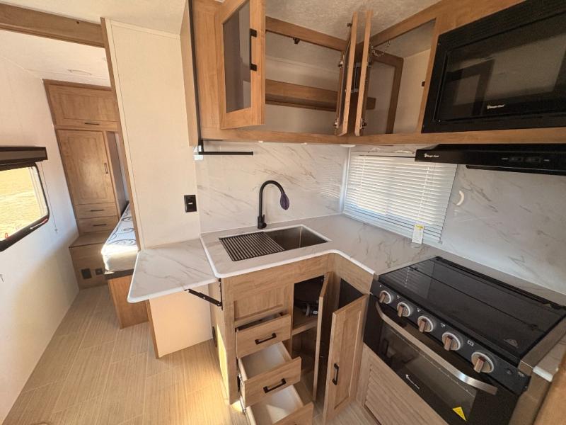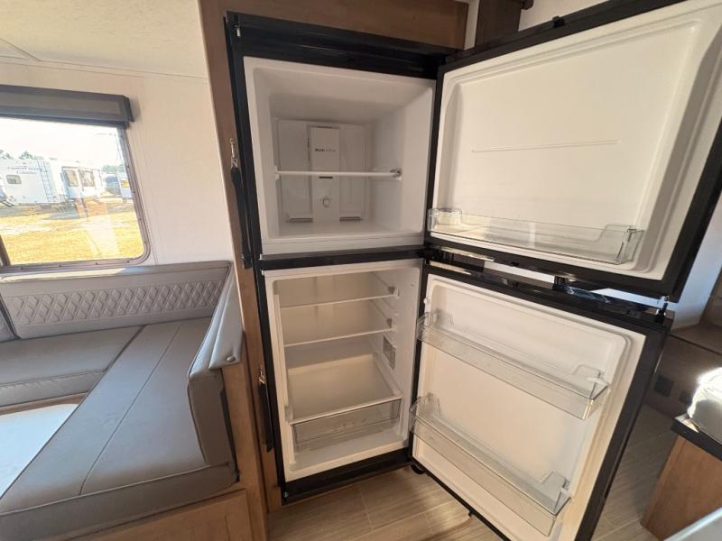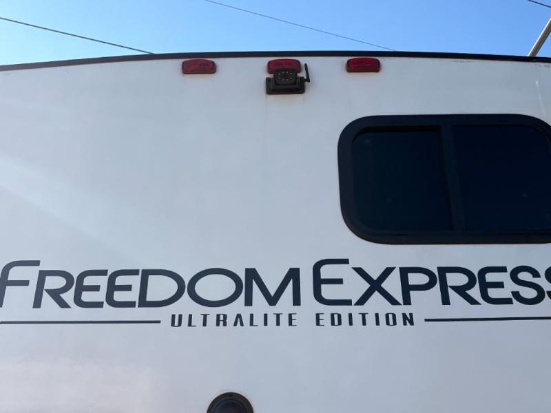 With any Freedom Express Ultra Lite travel trailer by Coachmen you will appreciate quality construction materials, such as vacuum bonded walls with Azdel composite, a 3/4 gel coated fiberglass cap with an automotive glass windshield, and a heated enclosed underbelly. Each model also features Tufflex PVC roofing, front rock guard, and E-Z Lube axles for smooth towing. Inside, you'll find kitchen backsplash, hidden hinge cabinetry, and wear-resistant vinyl flooring throughout. The power tongue jack included with the Ultra Lite Express Package will make set-up a breeze, and each model includes back-up camera prep and they are Freedom solar ready if you plan to go off-grid. Enjoy lightweight camping with a Freedom Express Ultra Lite travel trailer today!