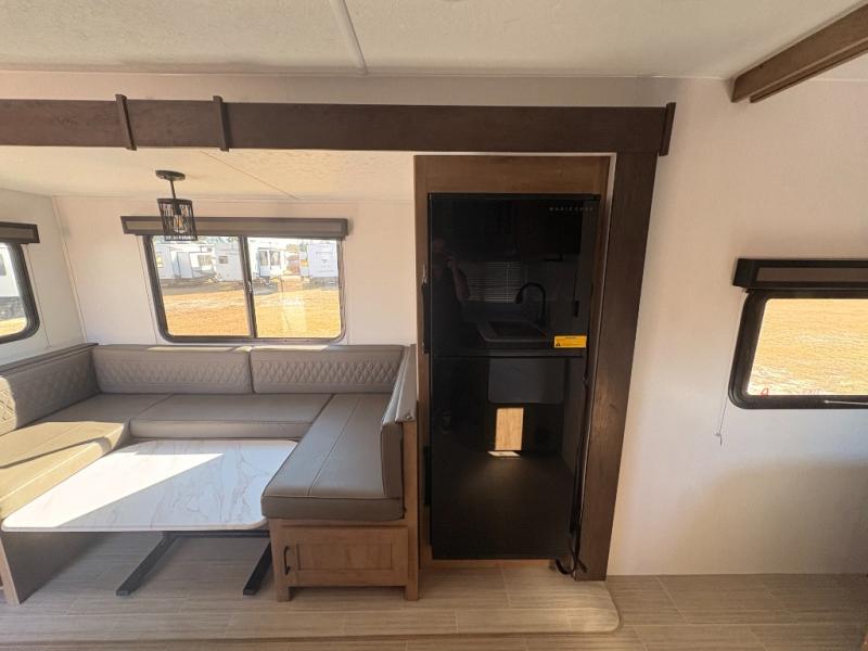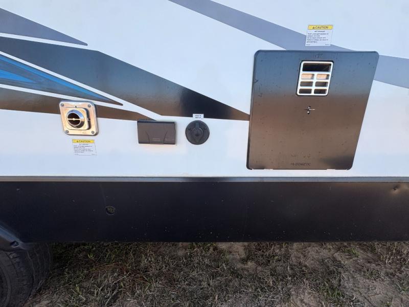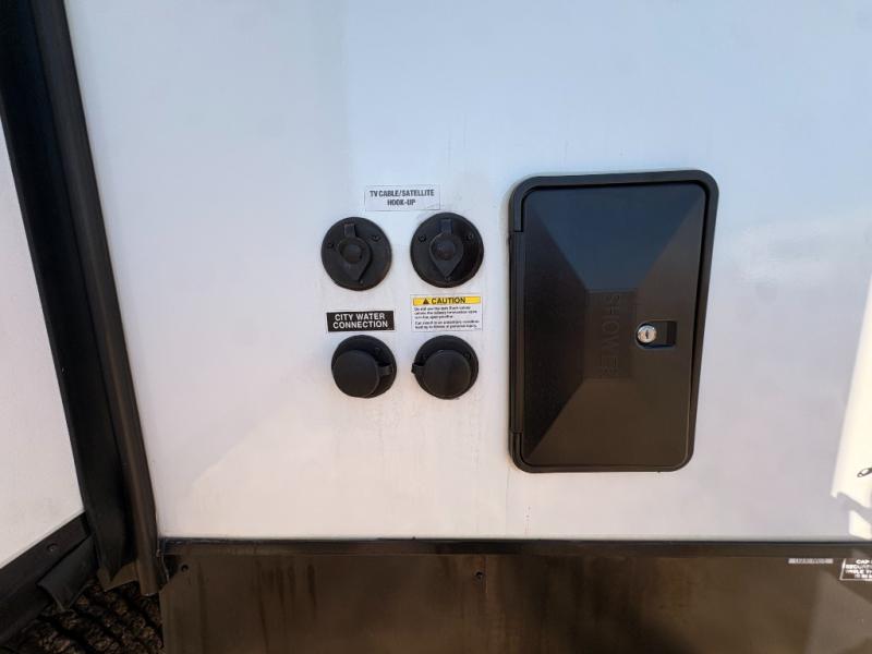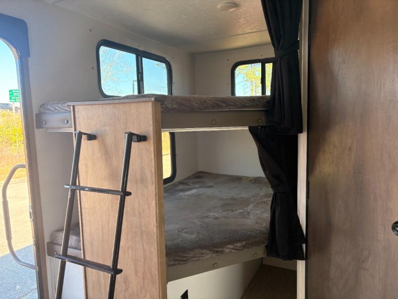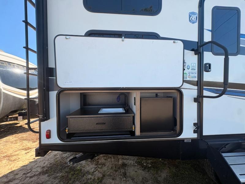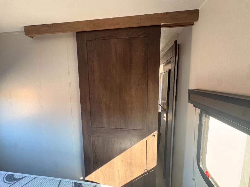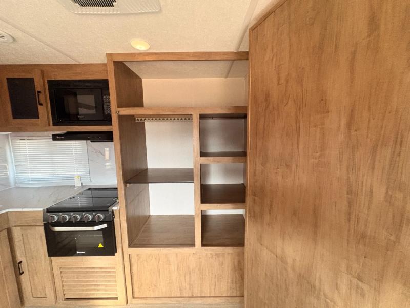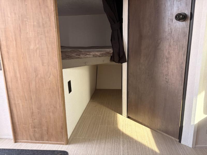 This is a great unit for a larger family to enjoy! With double-size bunks in the rear campside corner you can easily sleep seven or eight in this unit depending on size. A large slide offers ample space in the main living area and it features a u-dinette and refrigerator. Opposite the slide behind the Smart TV there is a huge hinged hidden storage pantry! You can easily cook both inside and out with all the appliances inside to create delicious home cooked meals, plus an outside camp kitchen and griddle so you can cook in the great outdoors on a beautiful day. A rear corner bath features a shower, toilet, and corner vanity with sink, plus medicine cabinet for your things. In front, a private master bedroom with queen bed including wardrobes and inset shelves along the side of the head of the bed, plus overhead storage as well.
