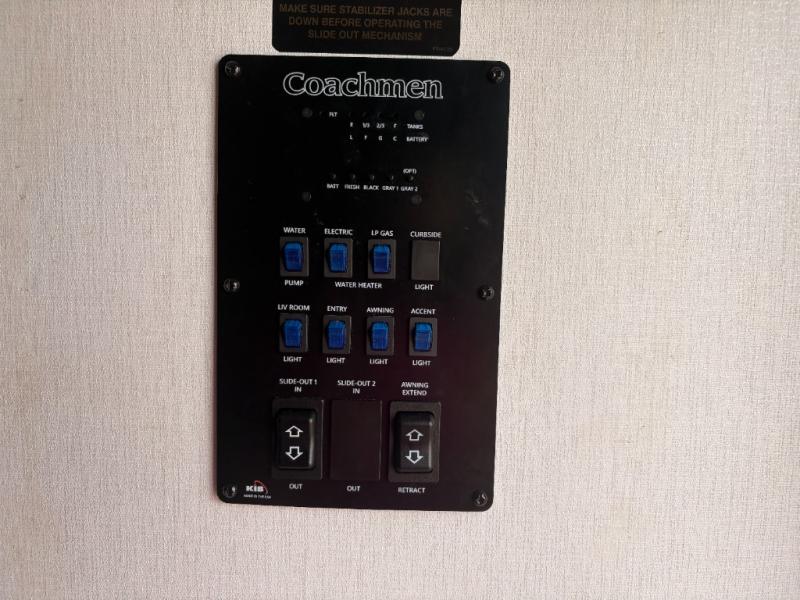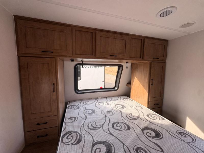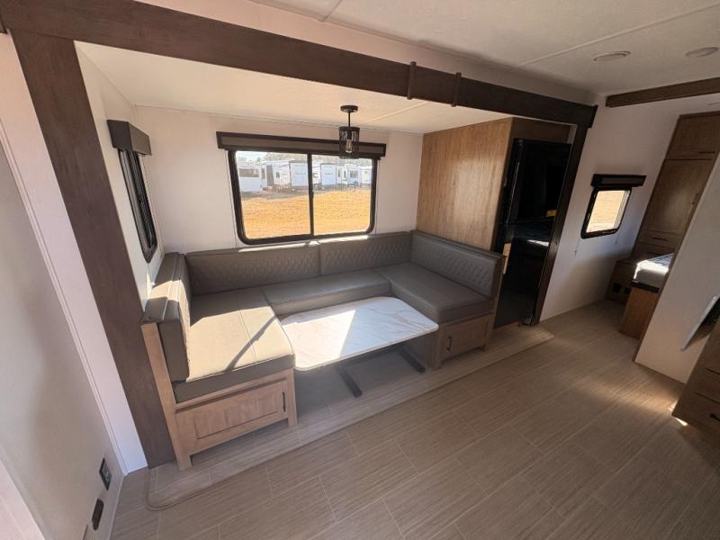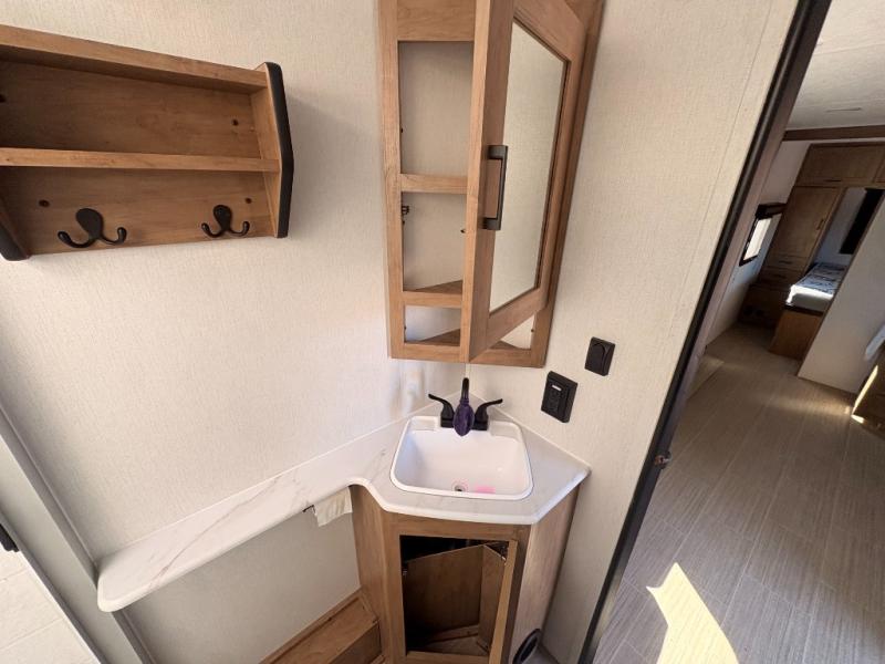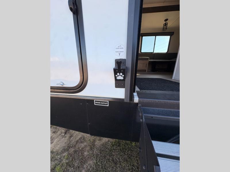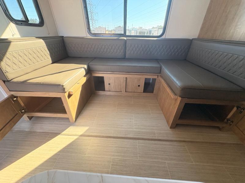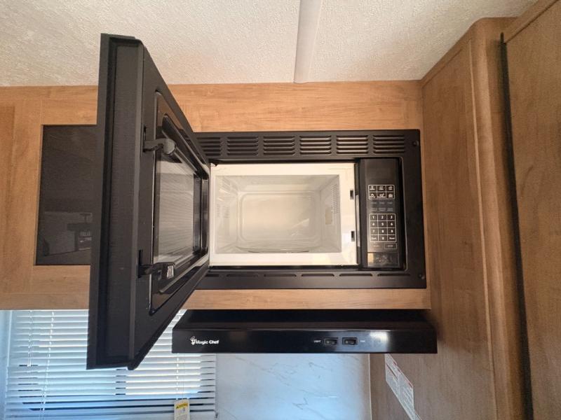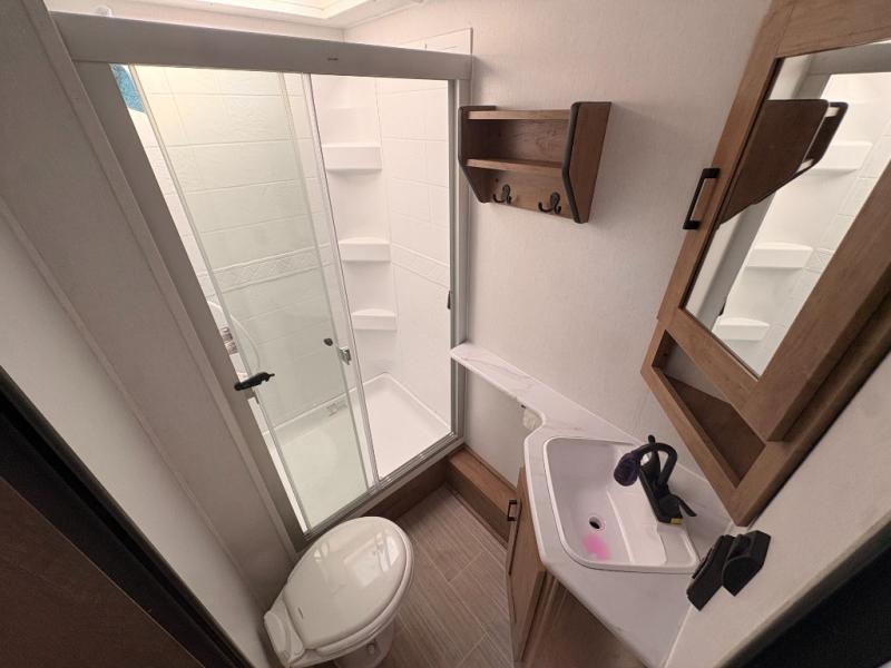 This is a great unit for a larger family to enjoy! With double-size bunks in the rear campside corner you can easily sleep seven or eight in this unit depending on size. A large slide offers ample space in the main living area and it features a u-dinette and refrigerator. Opposite the slide behind the Smart TV there is a huge hinged hidden storage pantry! You can easily cook both inside and out with all the appliances inside to create delicious home cooked meals, plus an outside camp kitchen and griddle so you can cook in the great outdoors on a beautiful day. A rear corner bath features a shower, toilet, and corner vanity with sink, plus medicine cabinet for your things. In front, a private master bedroom with queen bed including wardrobes and inset shelves along the side of the head of the bed, plus overhead storage as well.