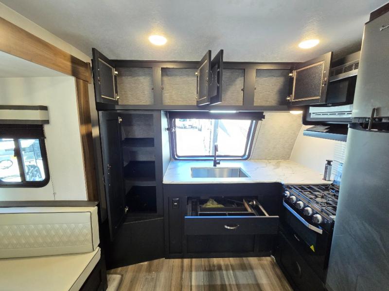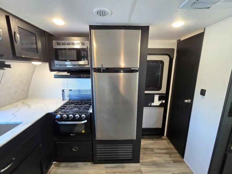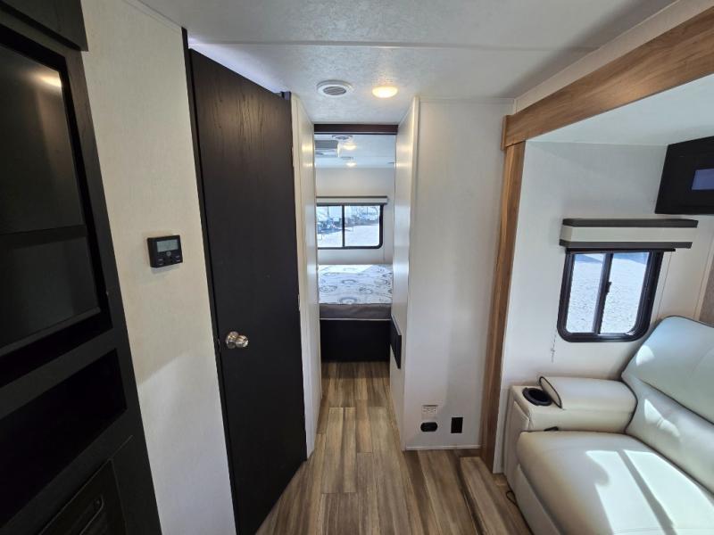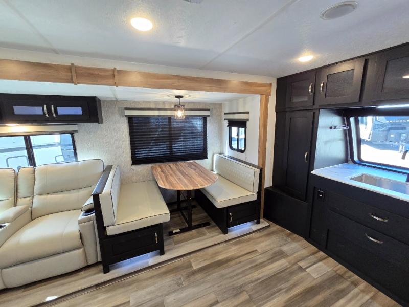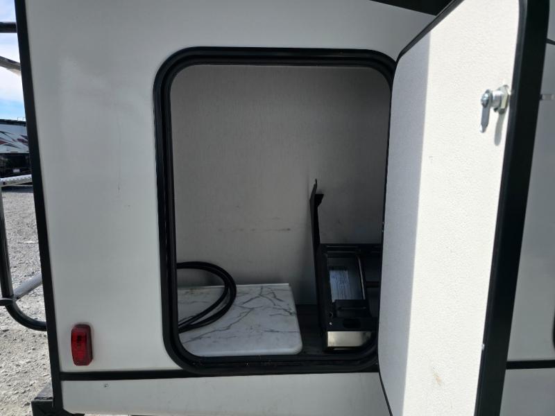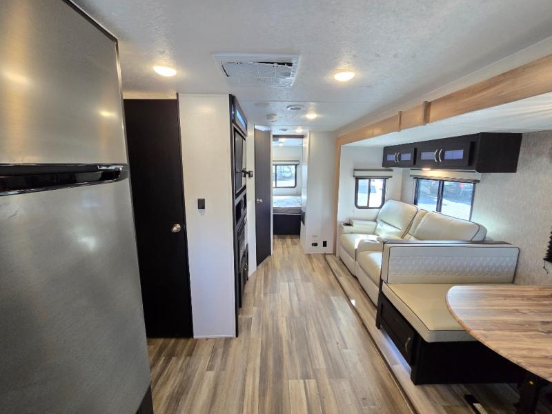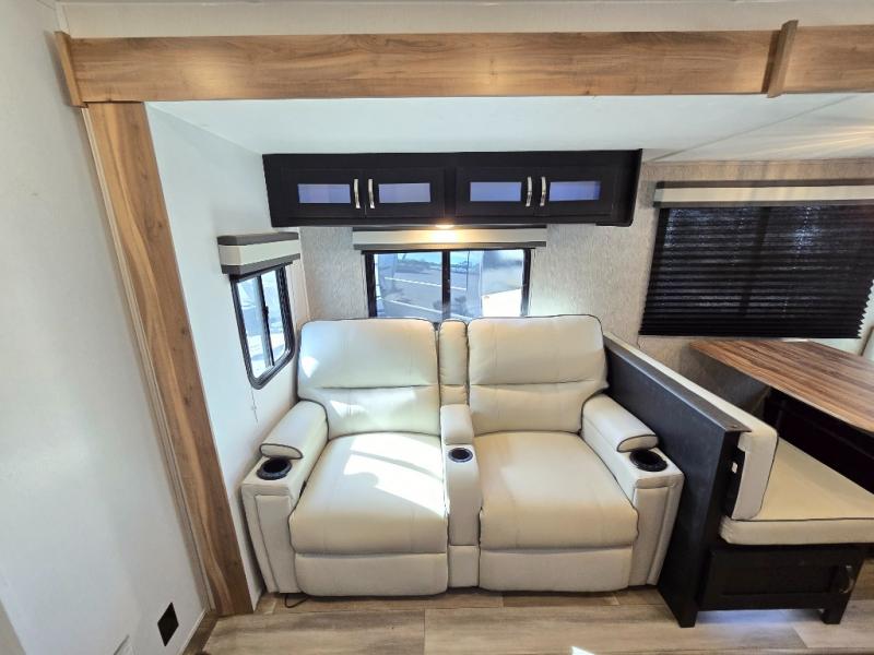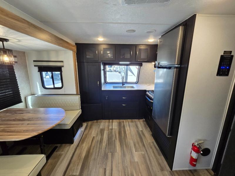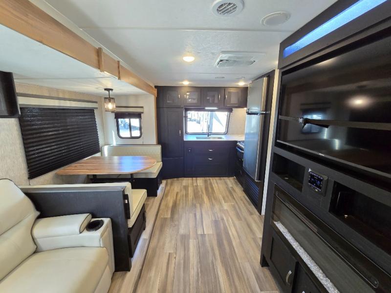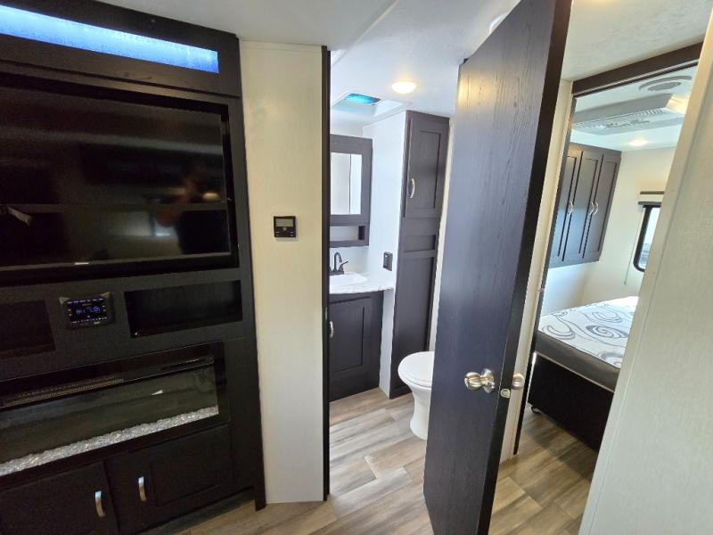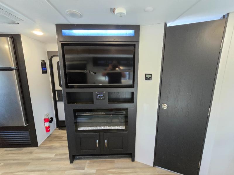 Comfort comes easy in this front kitchen travel trailer for four! You will love the rear master bedroom with its king bed slide out, spacious wardrobe, and a private entrance into the dual entry bath. There is a sofa that sits directly across from the fireplace and entertainment center, or you can choose the optional theater seat or optional hide-a-bed sofa in place of the standard sofa. The front kitchen features tons of counter space, an 8 cu. ft. double door refrigerator, plus a large pantry for dry good and snacks. There is also a pantry/closet just as you enter the trailer that will be perfect for shoes and jackets!