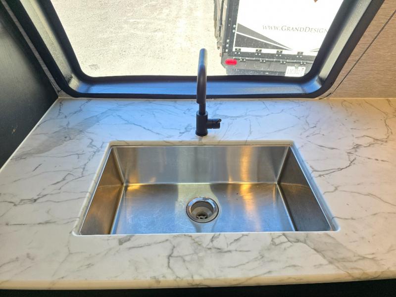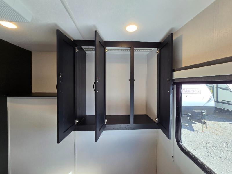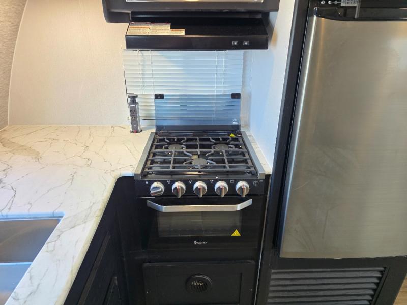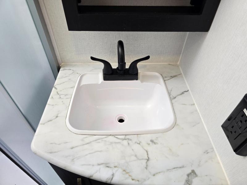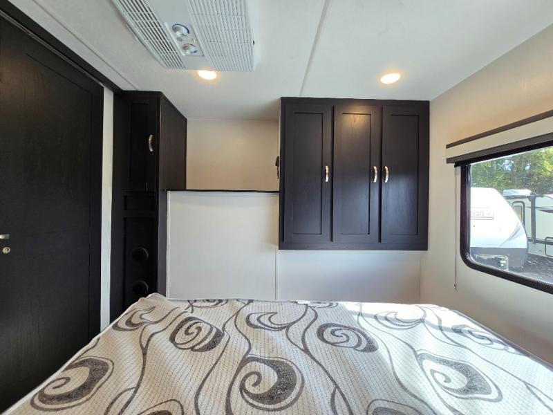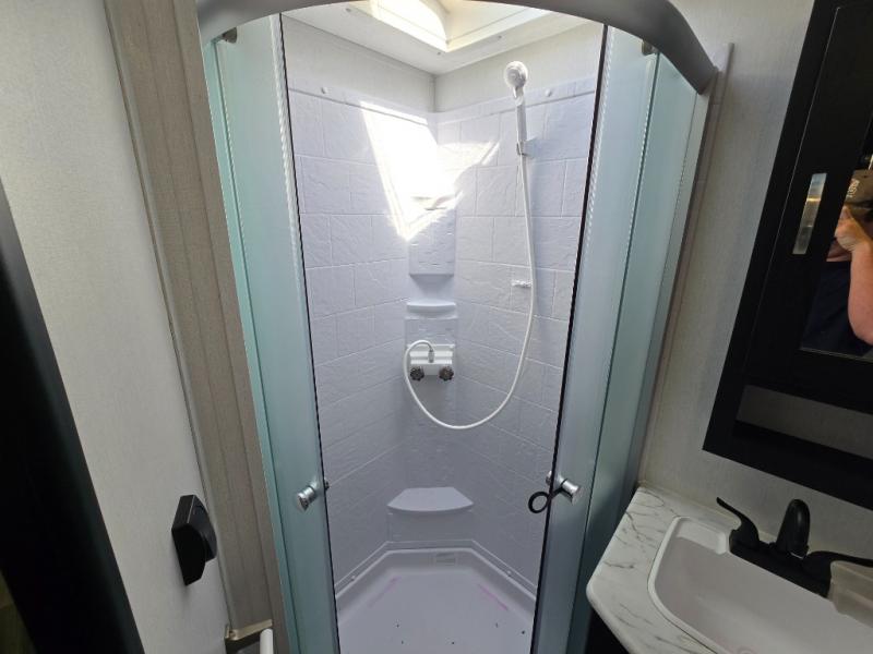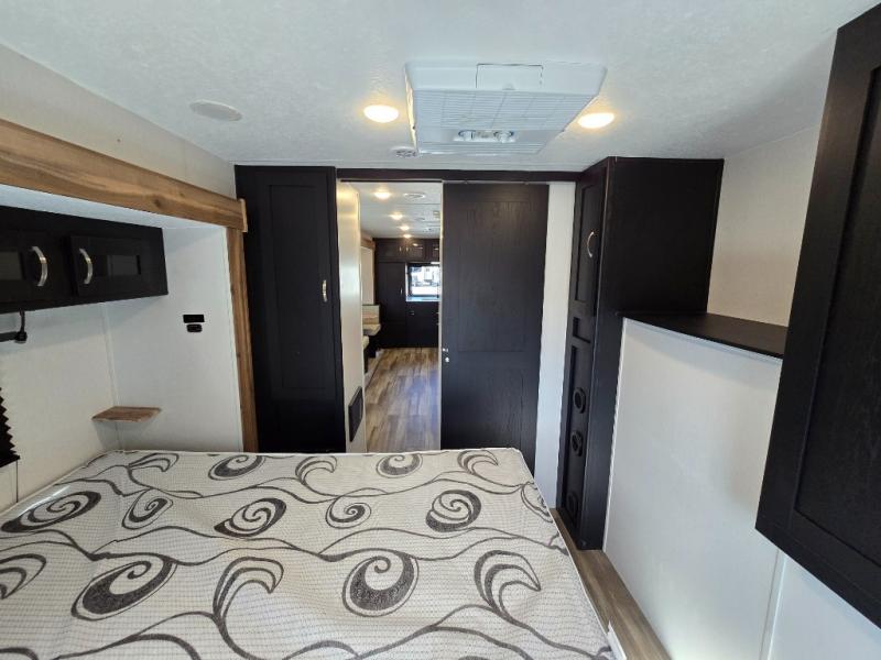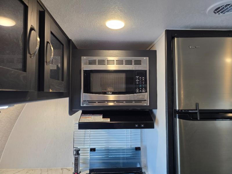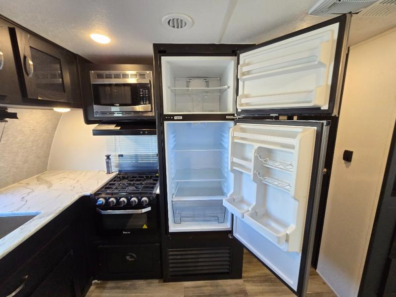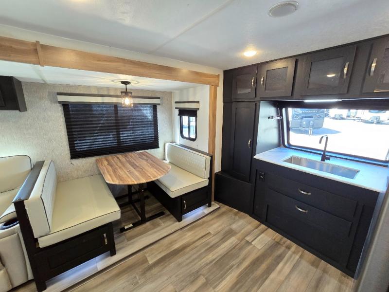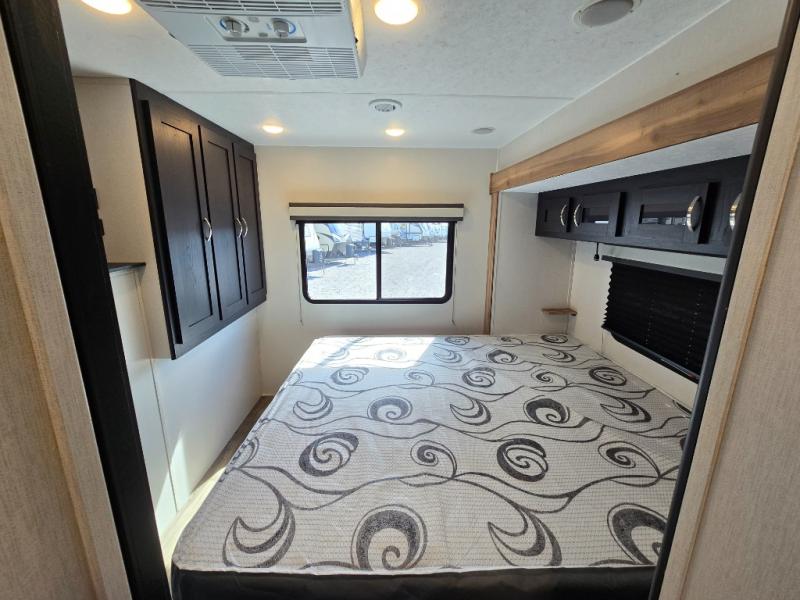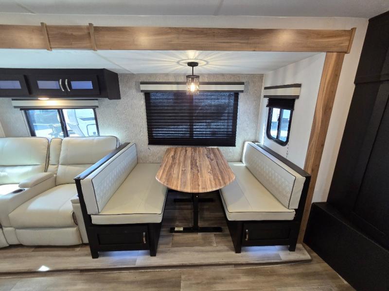 Comfort comes easy in this front kitchen travel trailer for four! You will love the rear master bedroom with its king bed slide out, spacious wardrobe, and a private entrance into the dual entry bath. There is a sofa that sits directly across from the fireplace and entertainment center, or you can choose the optional theater seat or optional hide-a-bed sofa in place of the standard sofa. The front kitchen features tons of counter space, an 8 cu. ft. double door refrigerator, plus a large pantry for dry good and snacks. There is also a pantry/closet just as you enter the trailer that will be perfect for shoes and jackets!