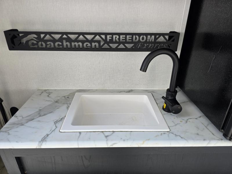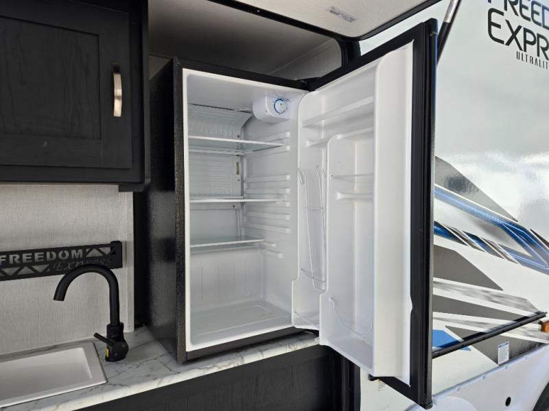 With any Freedom Express Ultra Lite travel trailer by Coachmen you will appreciate quality construction materials, such as vacuum bonded walls with Azdel composite, a 3/4 gel coated fiberglass cap with an automotive glass windshield, and a heated enclosed underbelly. Each model also features Tufflex PVC roofing, front rock guard, and E-Z Lube axles for smooth towing. Inside, you'll find kitchen backsplash, hidden hinge cabinetry, and wear-resistant vinyl flooring throughout. The power tongue jack included with the Ultra Lite Express Package will make set-up a breeze, and each model includes back-up camera prep and they are Freedom solar ready if you plan to go off-grid. Enjoy lightweight camping with a Freedom Express Ultra Lite travel trailer today!