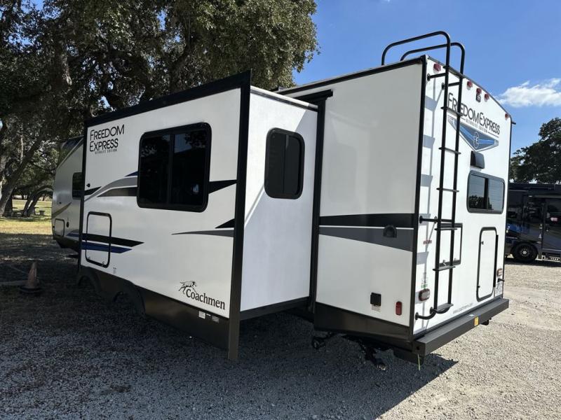 With any Freedom Express Ultra Lite travel trailer by Coachmen you will appreciate quality construction materials, such as vacuum bonded walls with Azdel composite, a 3/4 gel coated fiberglass cap with an automotive glass windshield, and a heated enclosed underbelly. Each model also features Tufflex PVC roofing, front rock guard, and E-Z Lube axles for smooth towing. Inside, you'll find kitchen backsplash, hidden hinge cabinetry, and wear-resistant vinyl flooring throughout. The power tongue jack included with the Ultra Lite Express Package will make set-up a breeze, and each model includes back-up camera prep and they are Freedom solar ready if you plan to go off-grid. Enjoy lightweight camping with a Freedom Express Ultra Lite travel trailer today!