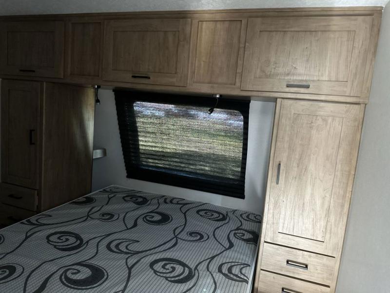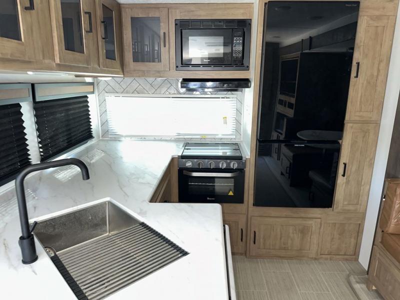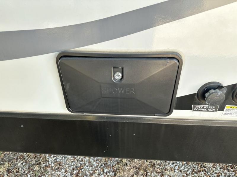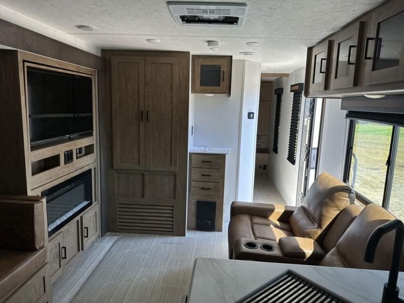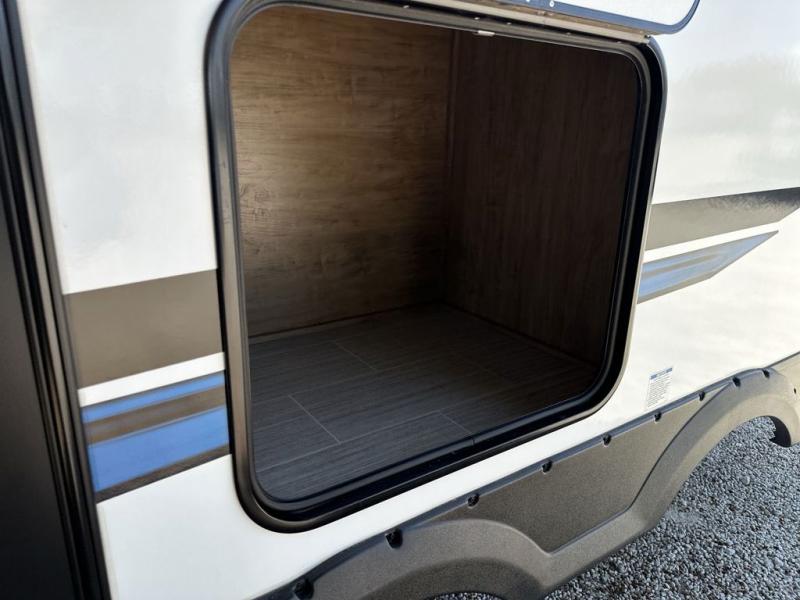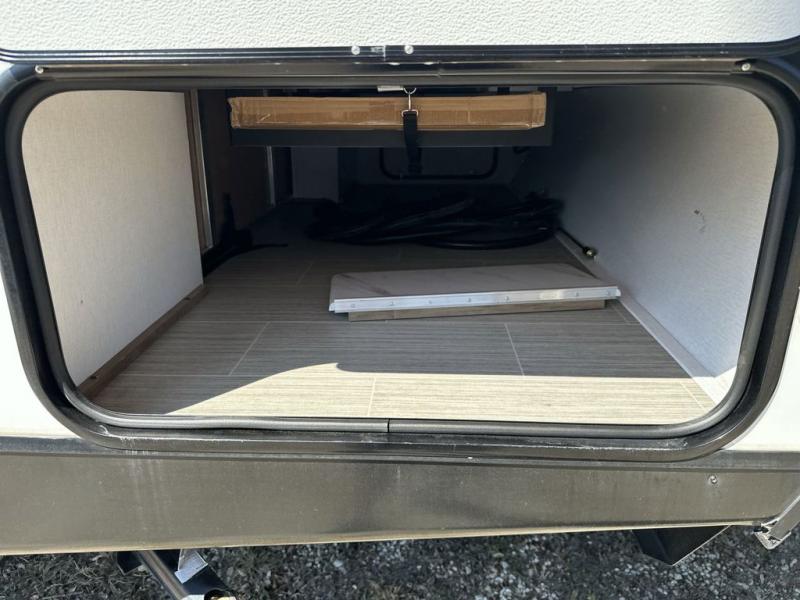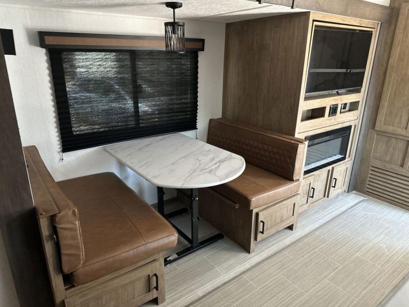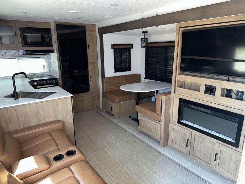 Are you looking for a travel trailer that will feel more like home? Look no further than this model that features a private bedroom up front, a full bath, plus a spacious rear kitchen. You will love to relax on the theatre sofa/hide-a-bed sofa across from the Smart TV and fireplace, and there is a booth dinette for dining. This model also includes a hidden pantry behind the TV for smart storage solutions. If the weather is nice you may just want to sit outdoors under the 18' power awning with LED lights. The chef of your group can prepare a meal on the pull-out camp kitchen, and the kids can grab their scooters from the pass-through storage.