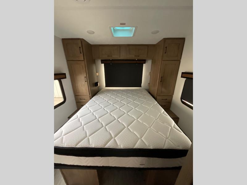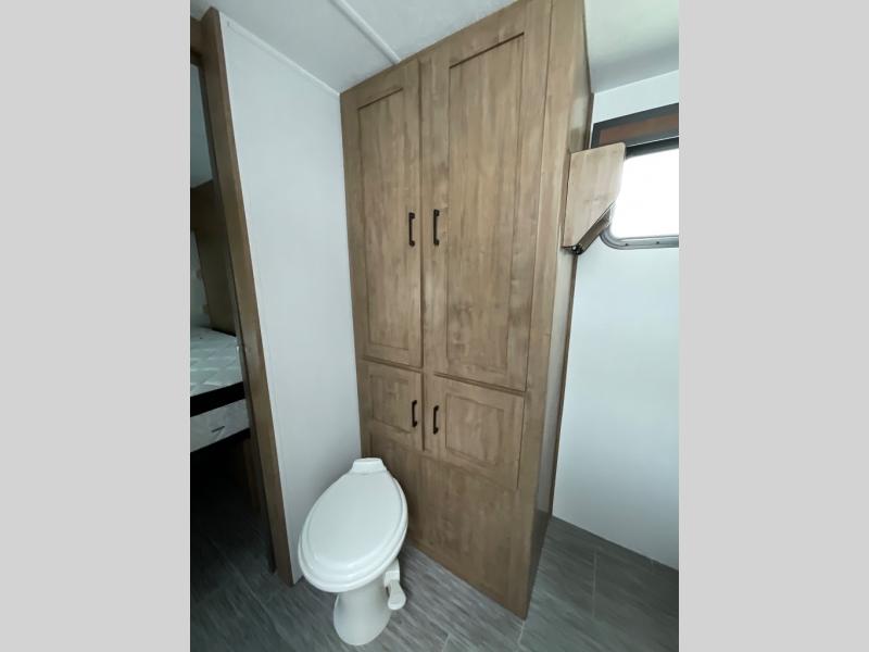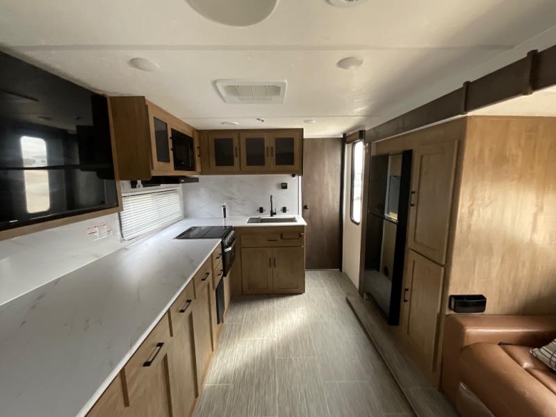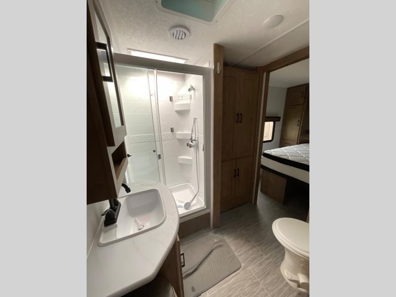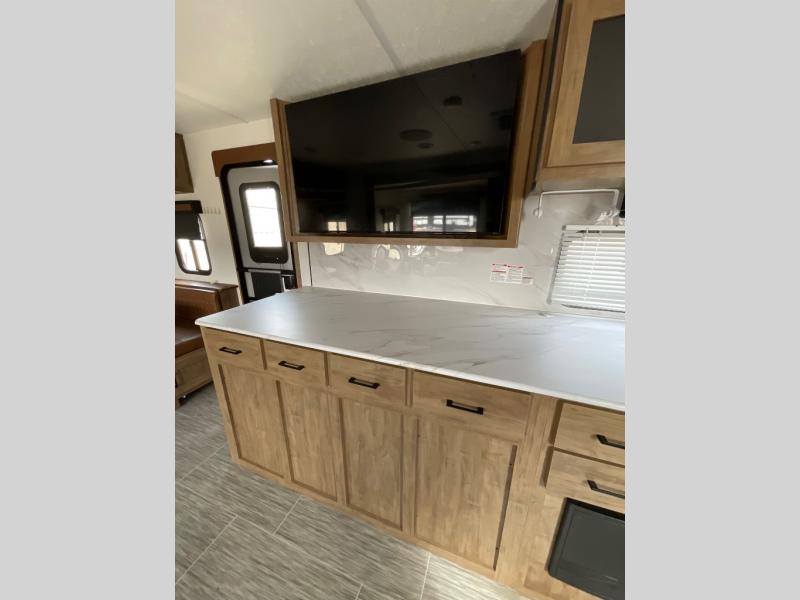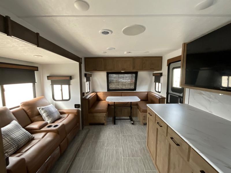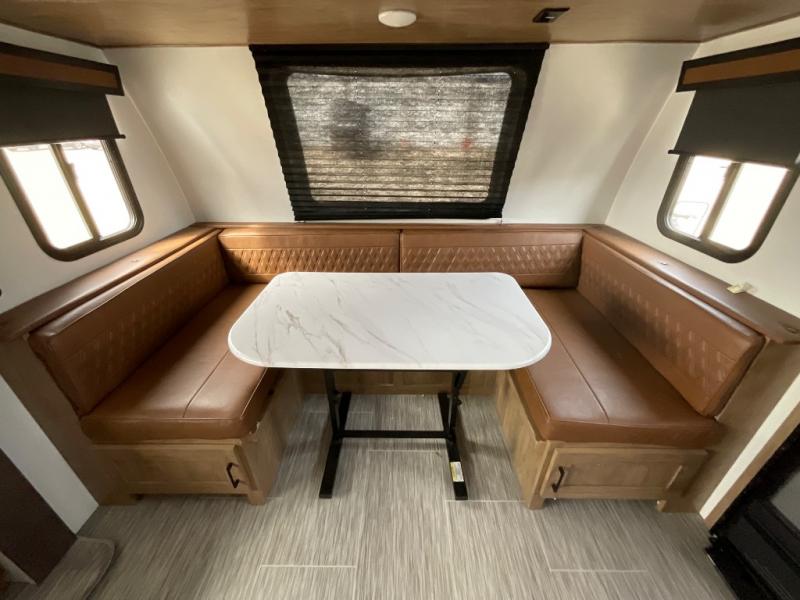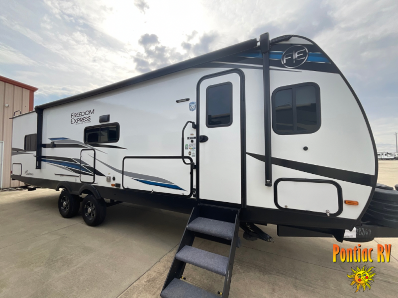 Looking for plenty of storage space in a towable? This Freedom Express Ultra Lite offers you a plenty of it, both inside and out. You will appreciate the spacious combined kitchen and living area featuring a large slide opposite the entry door. Here is where you will enjoy theater seating and your refrigerator and storage. The very front houses a huge 8' U-dinette for meals and game time, and can also serve as extra sleeping space once converted. Opposite the slide above the huge counter with plenty of storage beneath, a flat screen Smart TV. Beyond the kitchen area a spacious walk-through bath that offers space just like at home. There is even a wardrobe that has been prepped for a washer and dryer if you choose to add. A sliding door leads into the rear private master bedroom featuring a queen bed with dual bedside wardrobes and inset bedside shelves, vaulted underbed storage for your things.