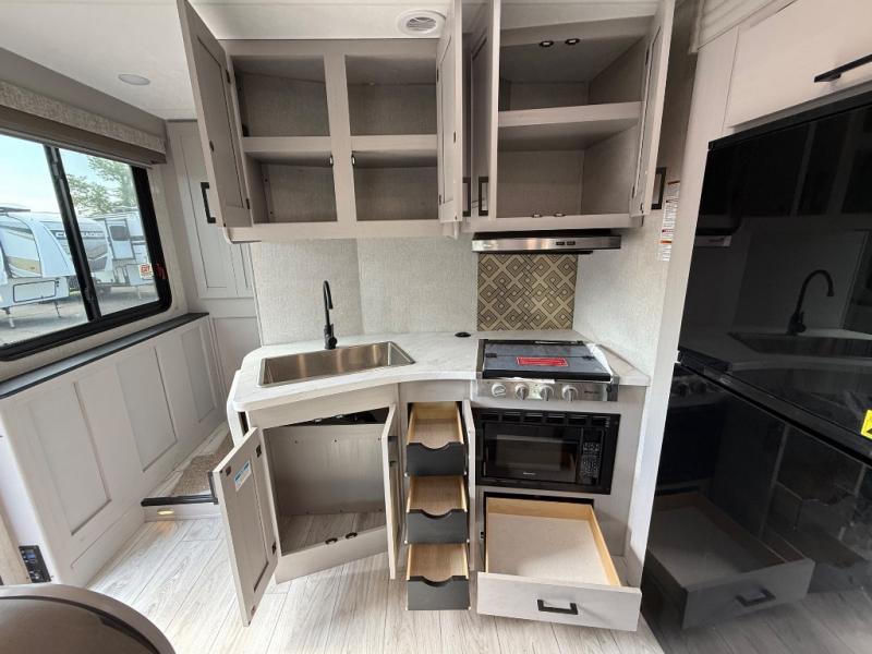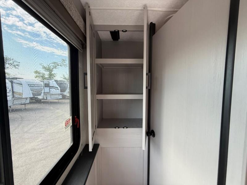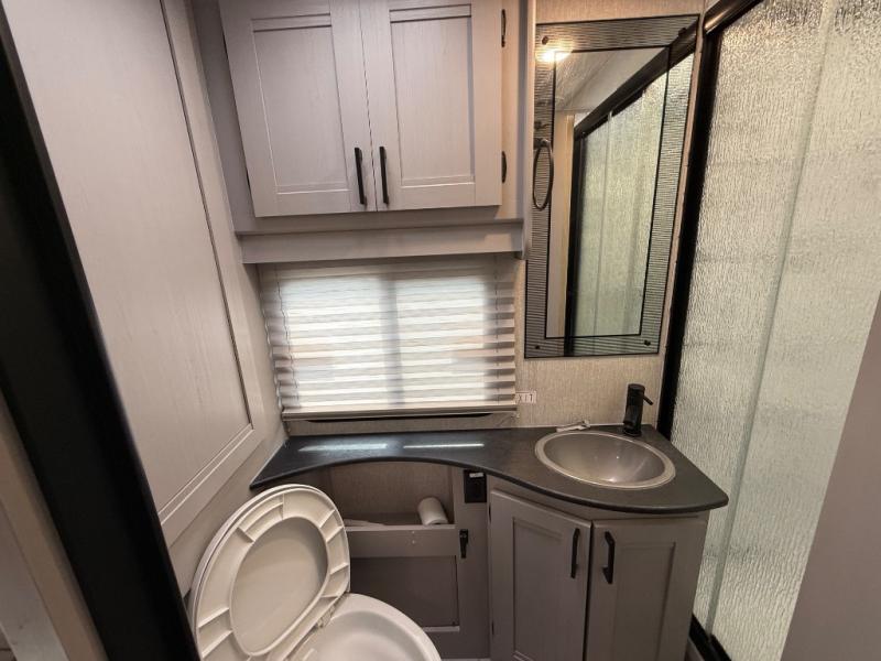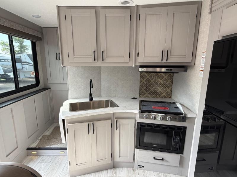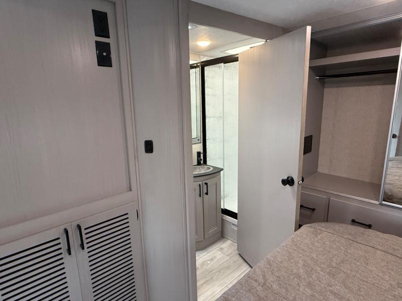 Enjoy many fun trips in this spacious motorhome! Step up to the rear private bedroom with a 72” x 80 king bed, and stow all your clothes in the wardrobe. Adjacent to the bedroom is a rear corner bath with a linen closet which even has room for an optional washer and dryer. The center kitchen has an angled countertop with an extension to allow for maximum cooking space, and a 12V refrigerator stows all your snacks. You’ll enjoy those meals on the J-Lounge or relax on the facing sofa. Overhead you’ll find plentiful cabinets for storage plus a TV. Outside under the power awning is an exterior entertainment center. This model also includes the CRV Supersprings Ride with heavy duty stabilizer bars, chassis electronic stability control, SumoSprings front shock absorbers, and more!