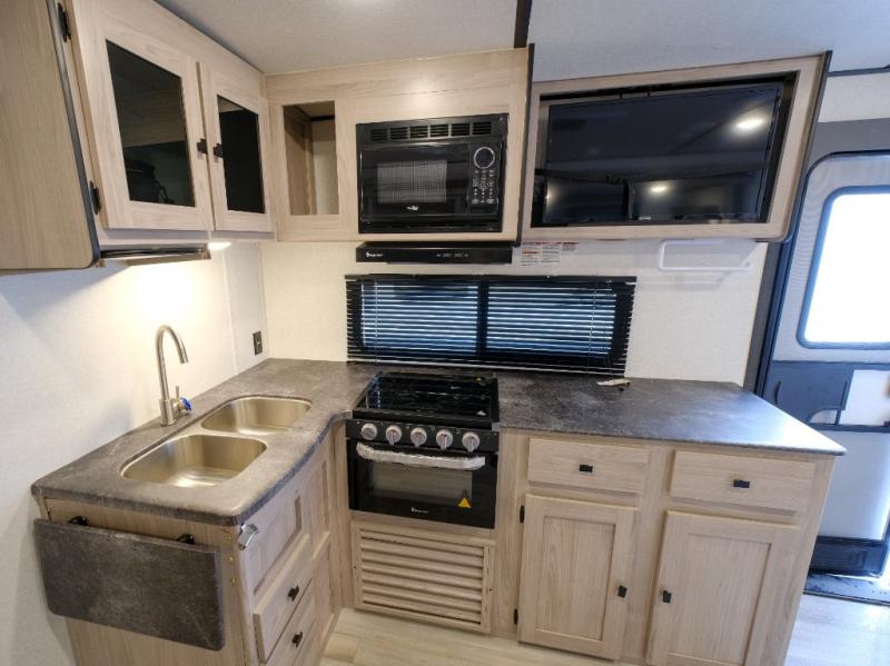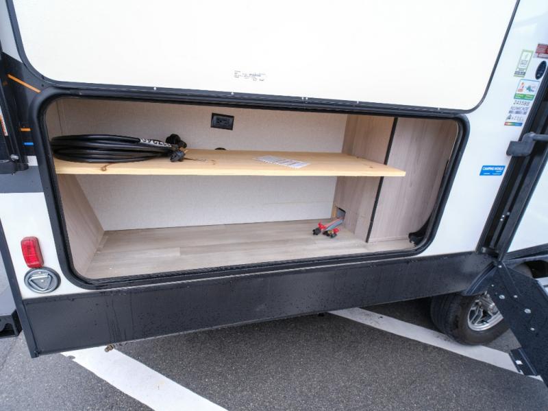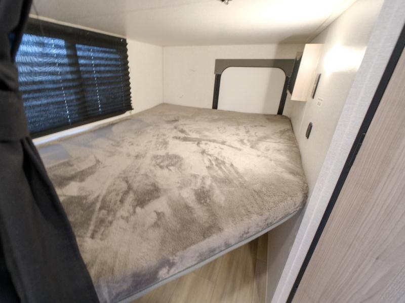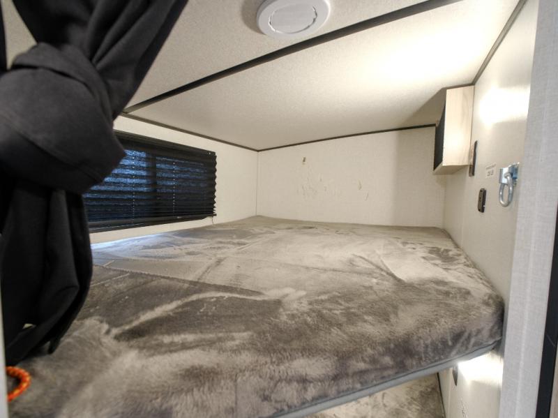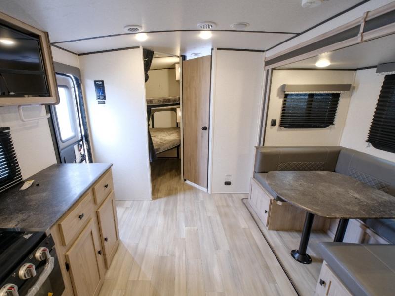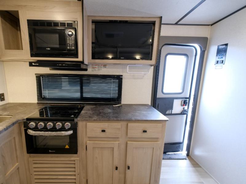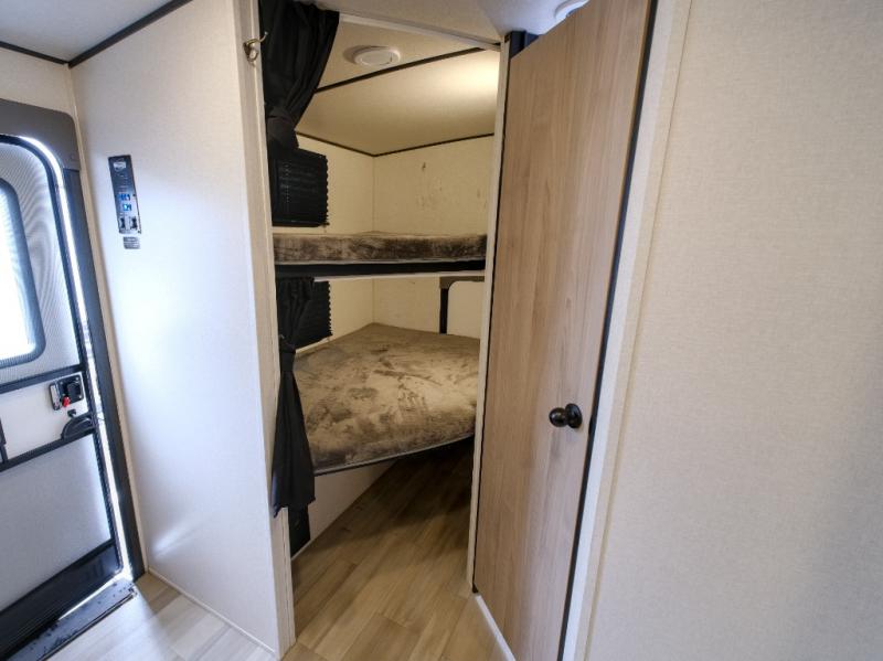 Bring the whole gang along for fun camping trips in this spacious trailer! There are double-size bunks in the back for little ones or your guests, and the full bath is right next to the bunks for easy nighttime use. You'll enjoy the front private bedroom with a queen bed all to yourselves, plus there is under bed storage and dual wardrobes to keep your clothes tidy. Everyone will love to meet in the main living area that includes a large slide out for more space, a U-shaped dinette, plus an entertainment center with an LED TV. A three burner cooktop and microwave oven come standard in the kitchen so you can make meals each day, plus there is an outside kitchen when the weather is in your favor!