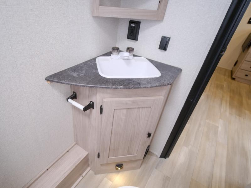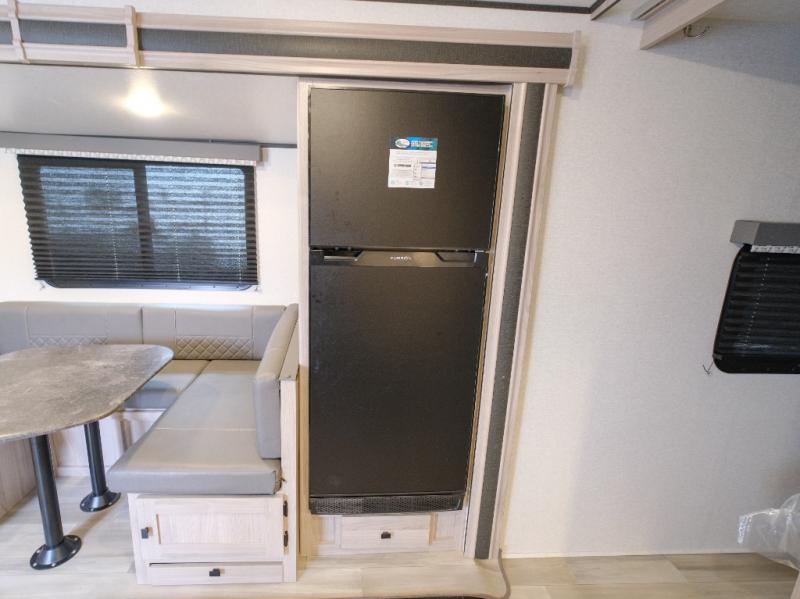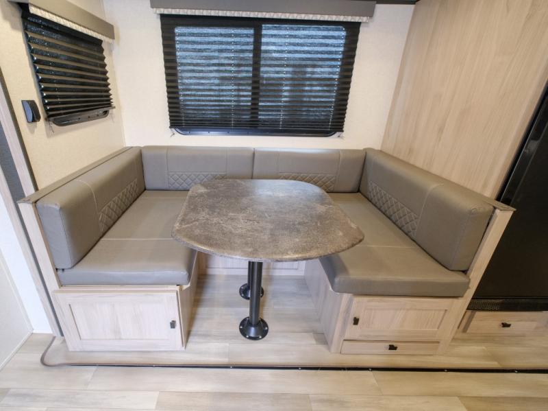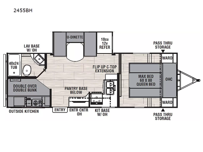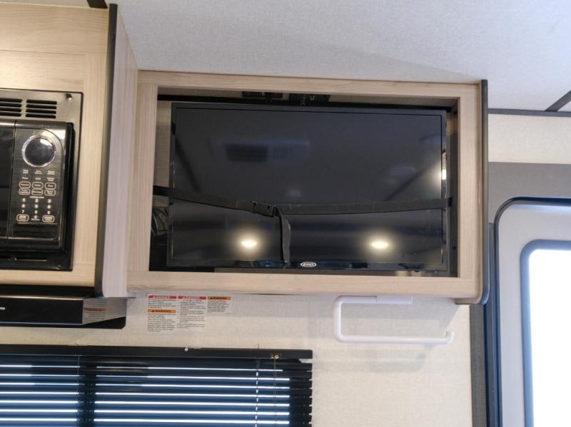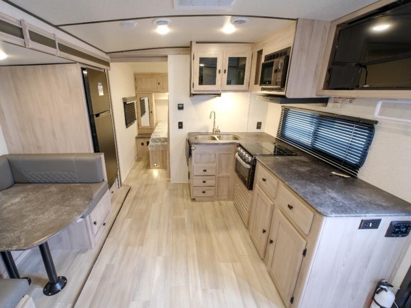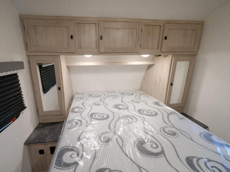 Bring the whole gang along for fun camping trips in this spacious trailer! There are double-size bunks in the back for little ones or your guests, and the full bath is right next to the bunks for easy nighttime use. You'll enjoy the front private bedroom with a queen bed all to yourselves, plus there is under bed storage and dual wardrobes to keep your clothes tidy. Everyone will love to meet in the main living area that includes a large slide out for more space, a U-shaped dinette, plus an entertainment center with an LED TV. A three burner cooktop and microwave oven come standard in the kitchen so you can make meals each day, plus there is an outside kitchen when the weather is in your favor!