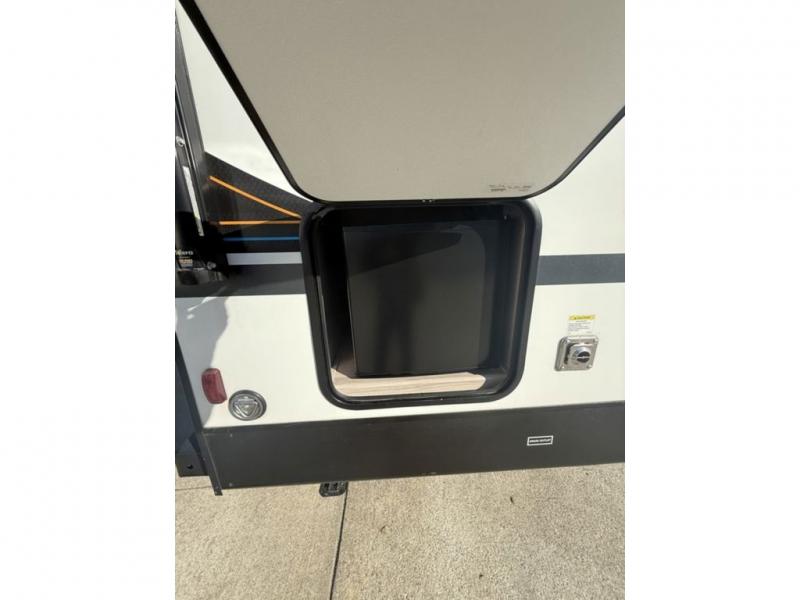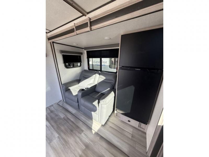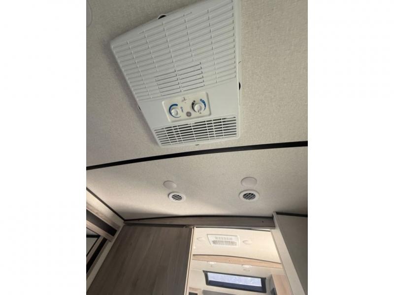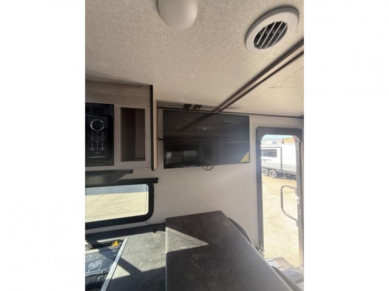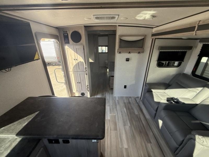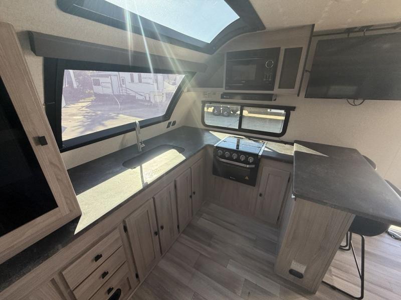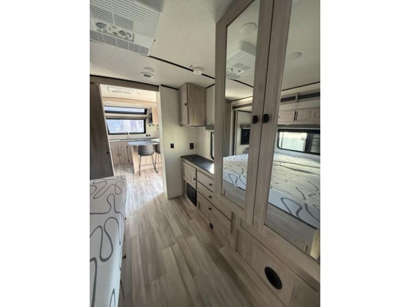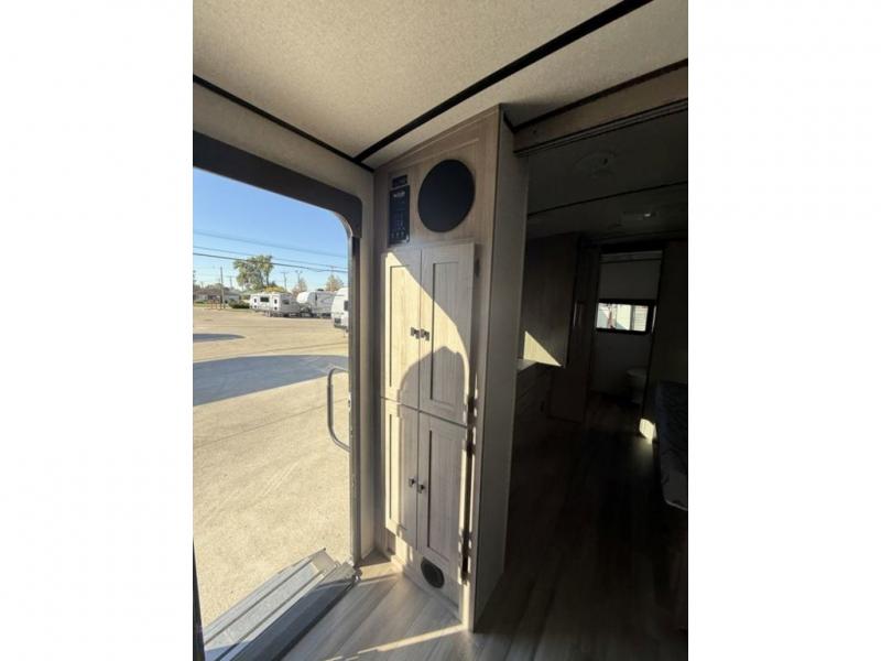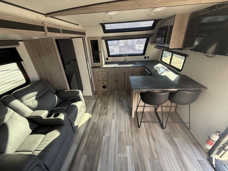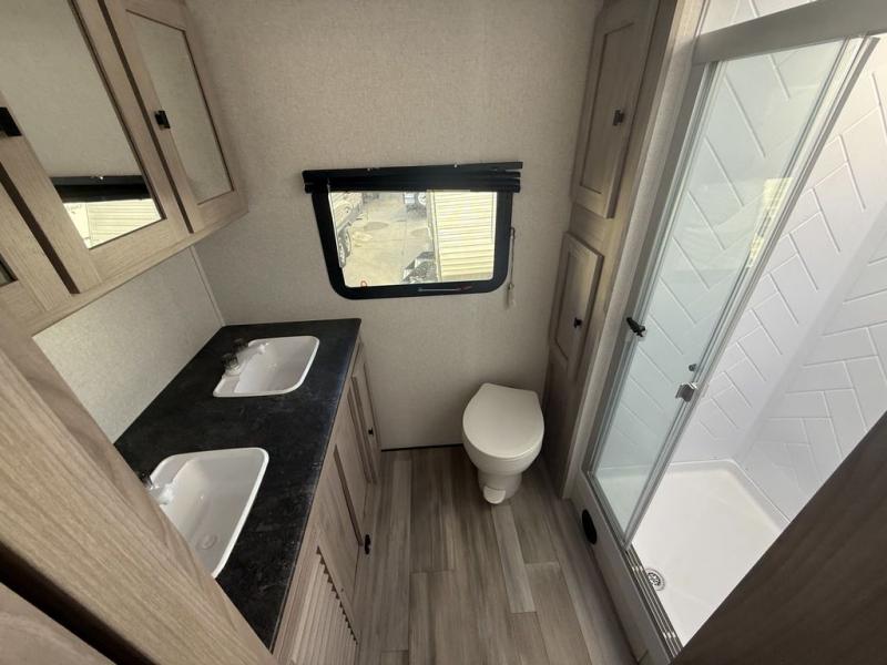 A rear bath with dual sink vanity, a king bed slide with drawers beneath for plenty of storage, and a front kitchen with breakfast bar and pantry as you enter all make this a great unit. There is so much to love about this dual slide travel trailer for two! You will enjoy plenty of space with a large slide in the bedroom and combined living area and kitchen. Theater seats are perfect for winding down your day inside, and a slide out king bed is a great way to enjoy a great night's rest. The bedroom is private and features a dresser and wardrobe as well as nightstands and bed overhead cabinets besides the under bed drawers so you can bring plenty of clothing and more. In the very rear of the unit, a spacious bath with large shower including a skylight, a linen cabinet and dual sink vanity so both can get ready at once. In the front kitchen you will find all the amenities to enjoy creating meals and snacks as you travel. There are two pantries with one just inside the door to your left, and one along the front wall near the refrigerator and theater seating slide.