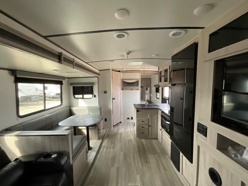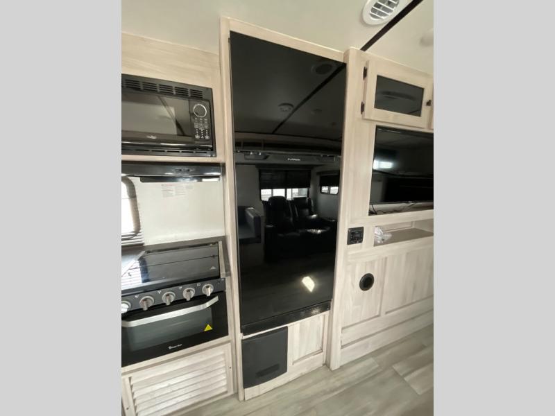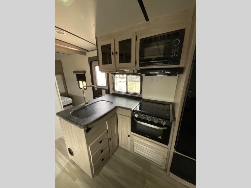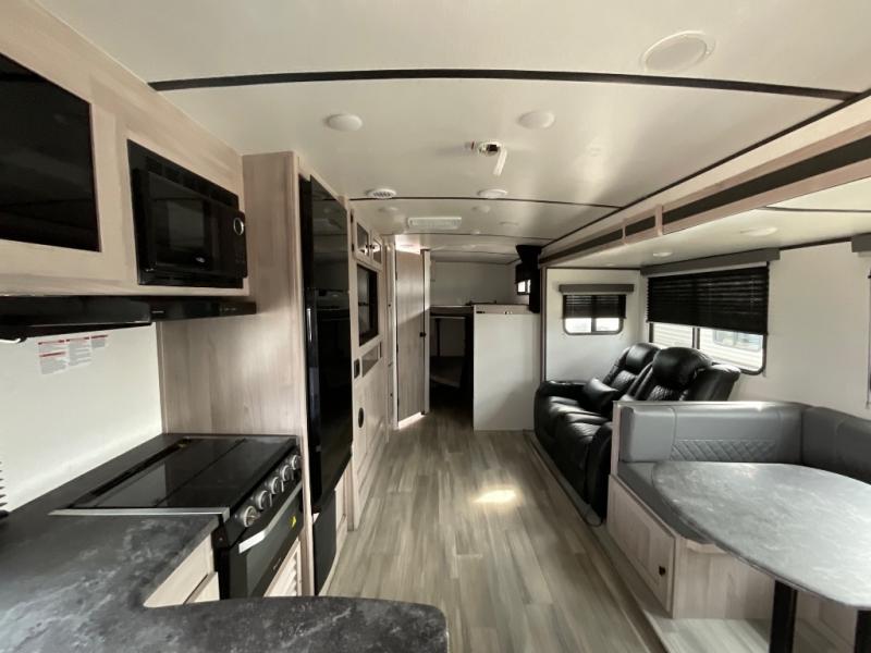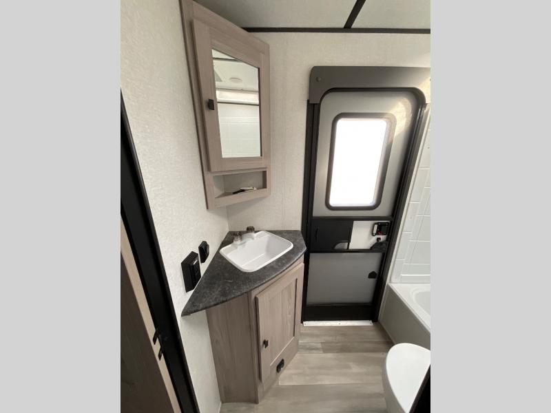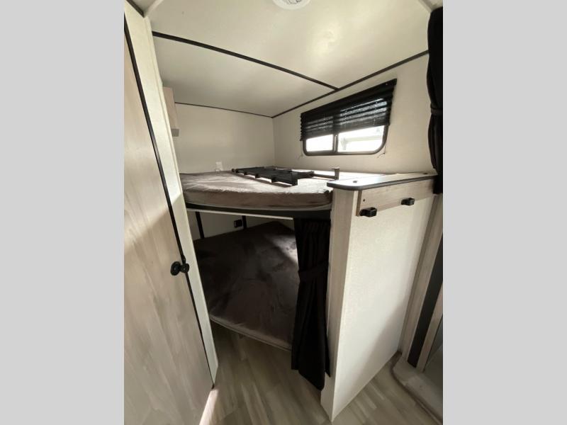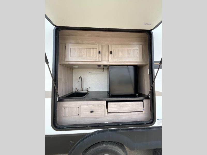 This is a popular bunk trailer for a larger family thanks to having the convenience of dual entry doors allowing access to the main living and kitchen area and near the front bedroom, and into the full bathroom for a quick in and out when playing outside. The bathroom also includes a hamper for convenience. The Stor-More cargo door allows you to place items from the exterior to the interior under the lower flip bunk for safe travels to your destinations and back home. The kids will surely love the convenience centers when playing or sleeping in a bunk. There is a sofa and U-shaped slide including a pet center for relaxing and feeding your pet. The kitchen includes full amenities plus a pantry to store lots of goodies for everyone. Along the exterior, the outside camp kitchen will come in handy when you have everyone at the campsite for dinner and the power awning offers some protection from the elements.