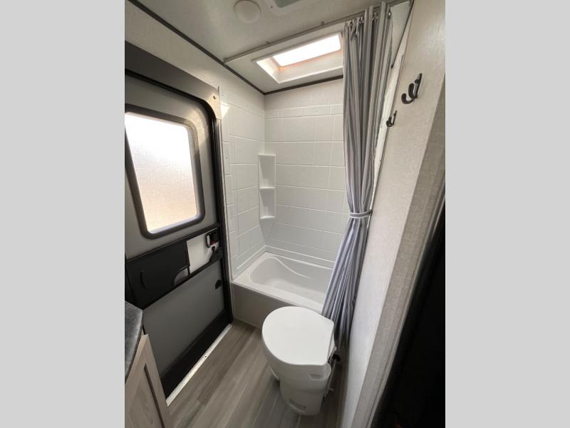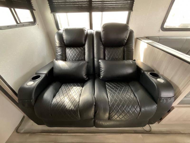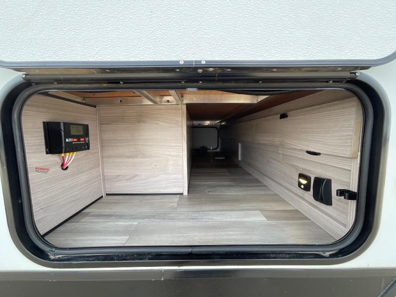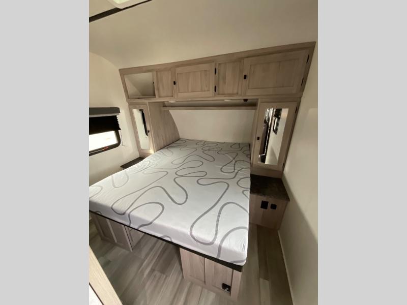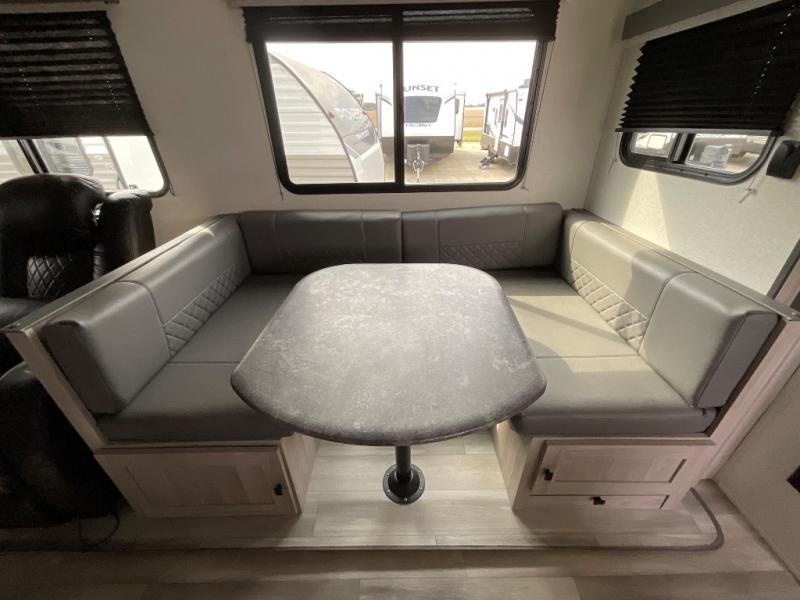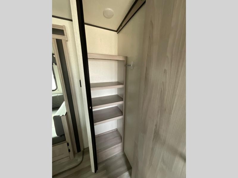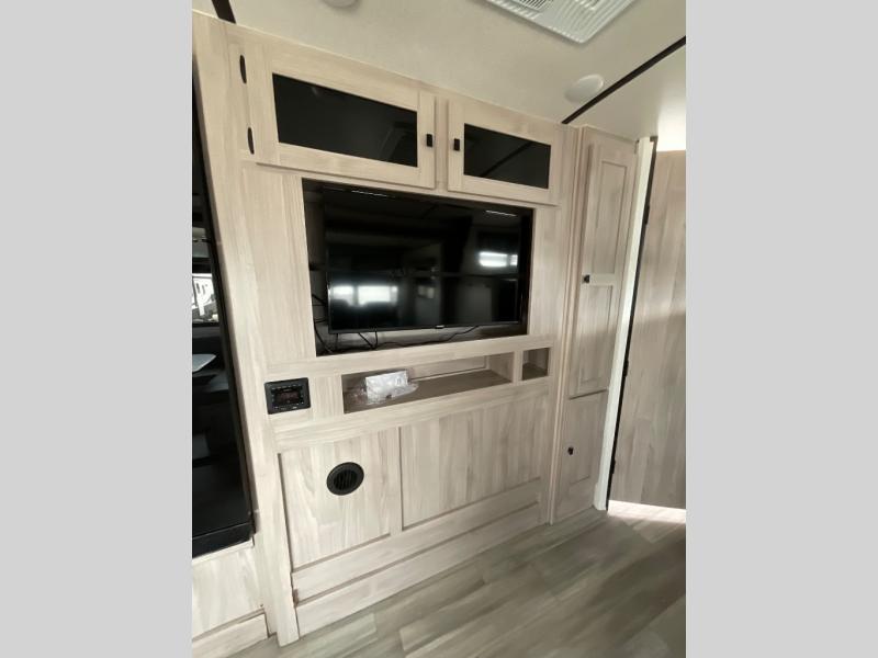 This is a popular bunk trailer for a larger family thanks to having the convenience of dual entry doors allowing access to the main living and kitchen area and near the front bedroom, and into the full bathroom for a quick in and out when playing outside. The bathroom also includes a hamper for convenience. The Stor-More cargo door allows you to place items from the exterior to the interior under the lower flip bunk for safe travels to your destinations and back home. The kids will surely love the convenience centers when playing or sleeping in a bunk. There is a sofa and U-shaped slide including a pet center for relaxing and feeding your pet. The kitchen includes full amenities plus a pantry to store lots of goodies for everyone. Along the exterior, the outside camp kitchen will come in handy when you have everyone at the campsite for dinner and the power awning offers some protection from the elements.