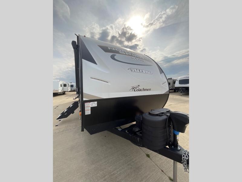 With any Northern Spirit Ultra Lite travel trailer by Coachmen, the "Twice Cool" dual ducted air conditioning system, the motion activated floor lights in the bedroom and bathroom, the lighted USB ports, the digital level, and the motion activated pass-through storage light plus fishing pole storage, will make your camping experience simplified. The heated and enclosed underbelly provides protection on the road and allows you to camp during any season, the 200W solar panel with 30 amp controller provides off-grid camping, and the power tongue jack makes setup easier. Each is built with a 3/4 painted fiberglass front cap with LED strip lights, a laminated, aluminum framed floor, rear wall, and sidewalls, plus 5" trusses with an interior vault. Make your decision today, and camp with everything in its place!