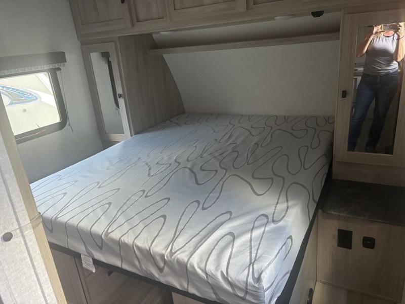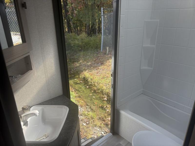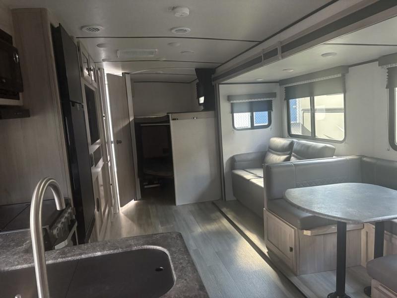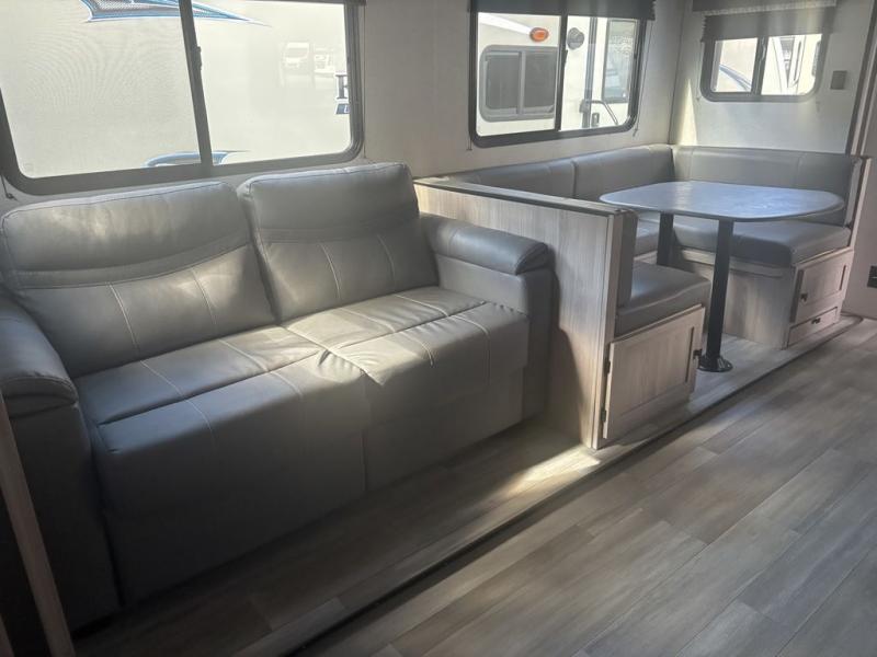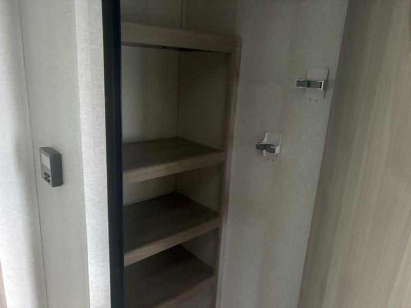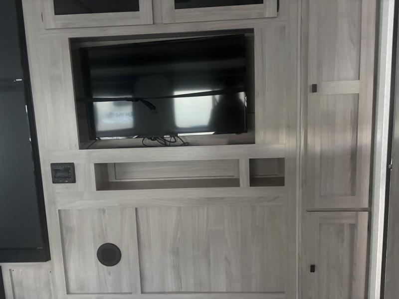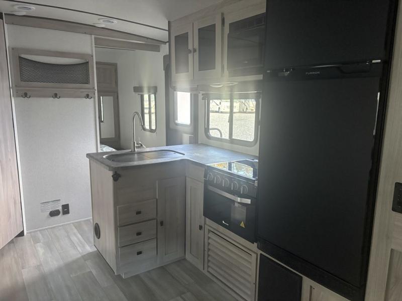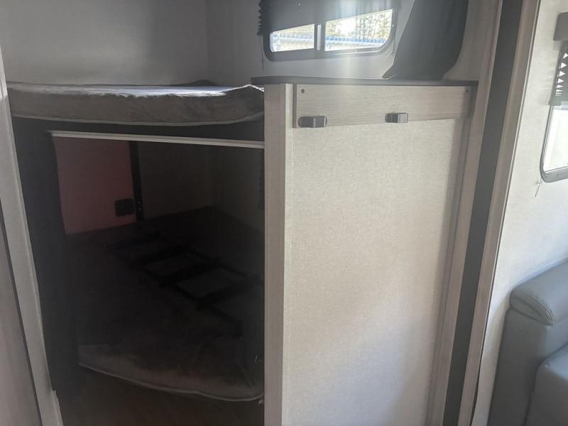 This is a popular bunk trailer for a larger family thanks to having the convenience of dual entry doors allowing access to the main living and kitchen area and near the front bedroom, and into the full bathroom for a quick in and out when playing outside. The bathroom also includes a hamper for convenience. The Stor-More cargo door allows you to place items from the exterior to the interior under the lower flip bunk for safe travels to your destinations and back home. The kids will surely love the convenience centers when playing or sleeping in a bunk. There is a sofa and U-shaped slide including a pet center for relaxing and feeding your pet. The kitchen includes full amenities plus a pantry to store lots of goodies for everyone. Along the exterior, the outside camp kitchen will come in handy when you have everyone at the campsite for dinner and the power awning offers some protection from the elements.