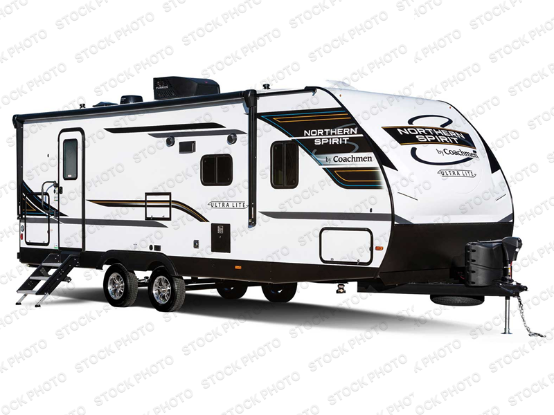 With any Northern Spirit Ultra Lite travel trailer by Coachmen, the "Twice Cool" dual ducted air conditioning system, the motion activated floor lights in the bedroom and bathroom, the lighted USB ports, the digital level, and the motion activated pass-through storage light plus fishing pole storage, will make your camping experience simplified. The heated and enclosed underbelly provides protection on the road and allows you to camp during any season, the 200W solar panel with 30 amp controller provides off-grid camping, and the power tongue jack makes setup easier. Each is built with a 3/4 painted fiberglass front cap with LED strip lights, a laminated, aluminum framed floor, rear wall, and sidewalls, plus 5" trusses with an interior vault. Make your decision today, and camp with everything in its place!