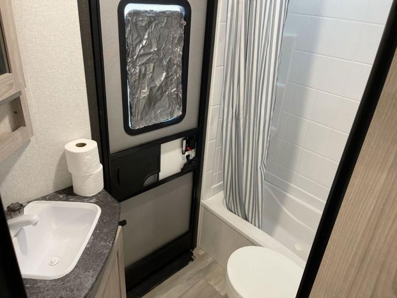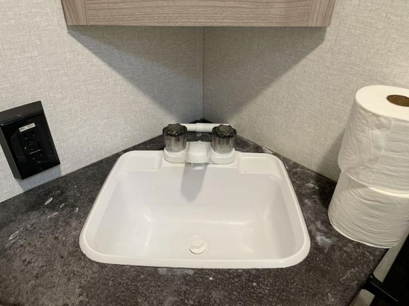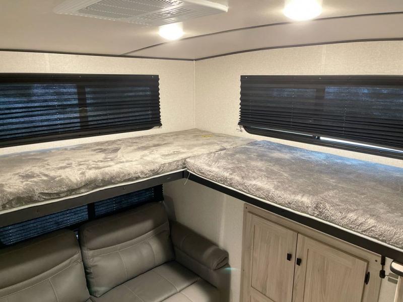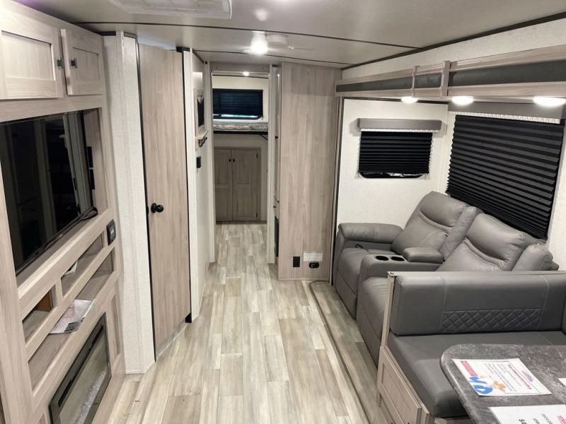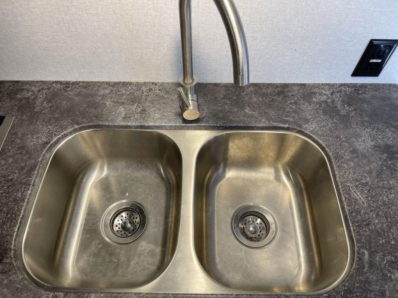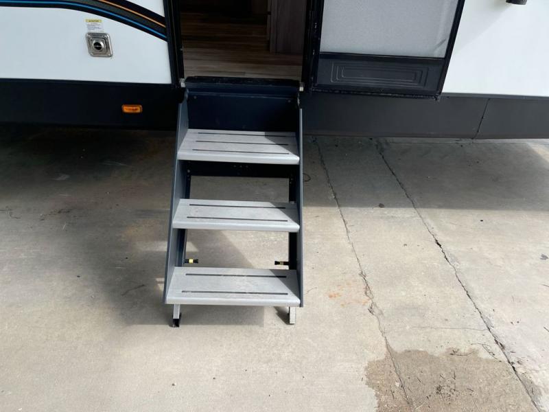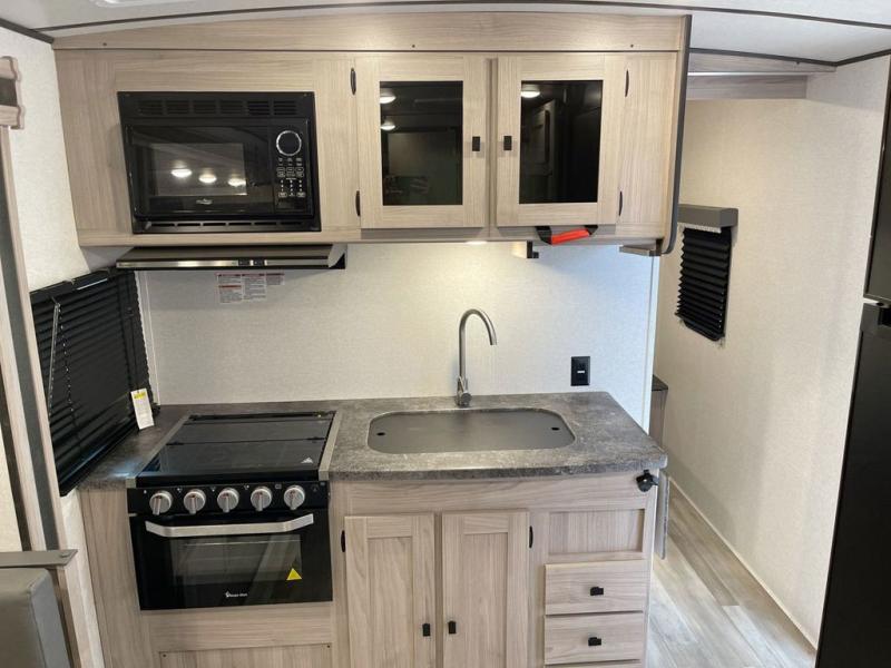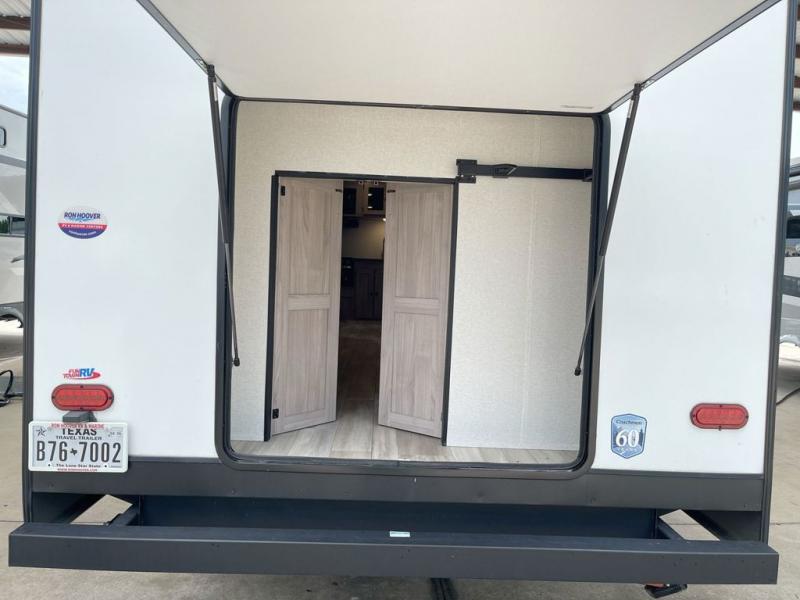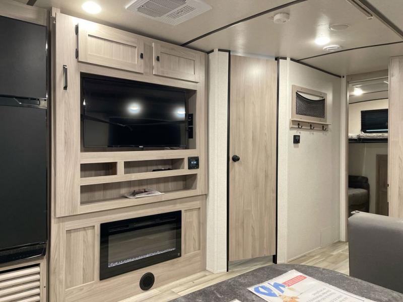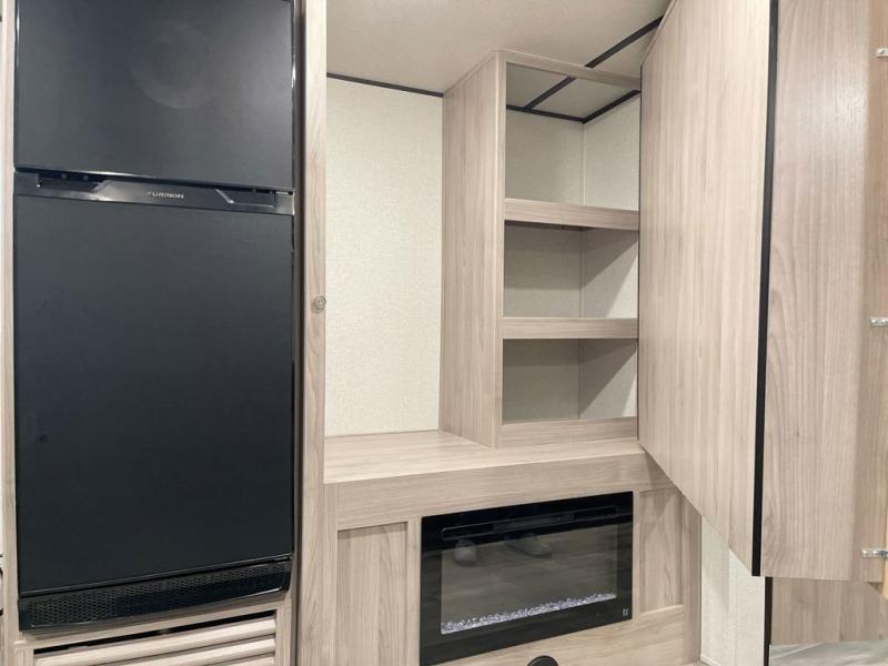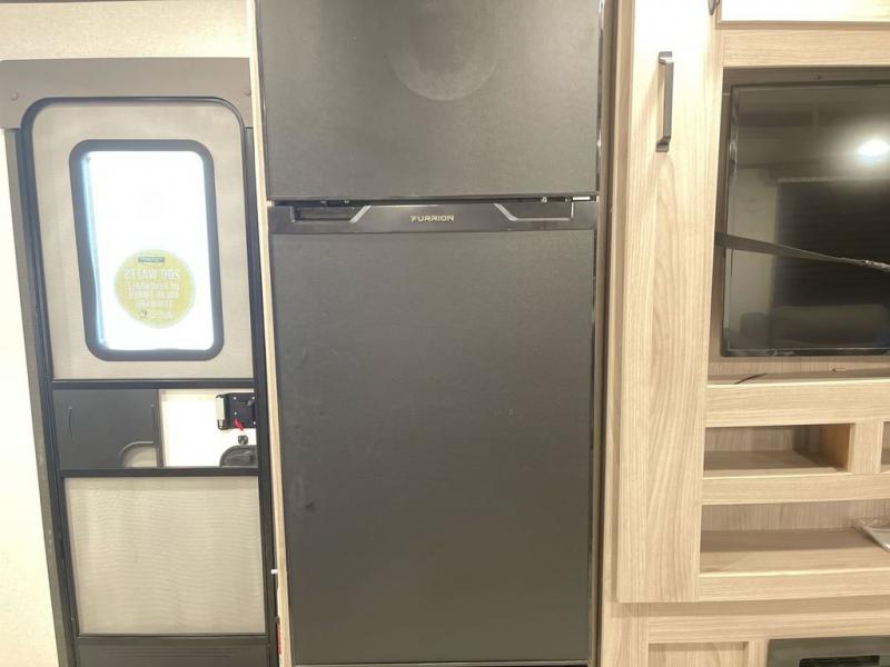 This travel trailer will be perfect to see family and friends in other states or camping for long-periods of time. There is an abundant amount of storage in the living and kitchen area, including behind the entertainment center in the hidden pantry and the second pantry with shelves, plus in the front bedroom under the queen bed with the MAX bed storage system. There is even storage in the rear private bunkhouse cabinet and countertop, plus along the exterior in the pass-through compartment and the Stor-More Cargo in the rear. The side Stor-More cargo door leads you into the bunkhouse to stow items like bikes and totes during travel. You will also love making meals in the kitchen with full amenities including a 10 cu. ft. refrigerator, and outside using the camp kitchen. And having dual entry just makes everything easy especially getting to the full bathroom.