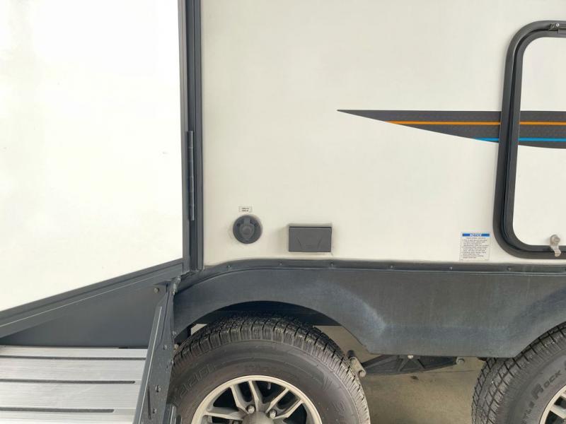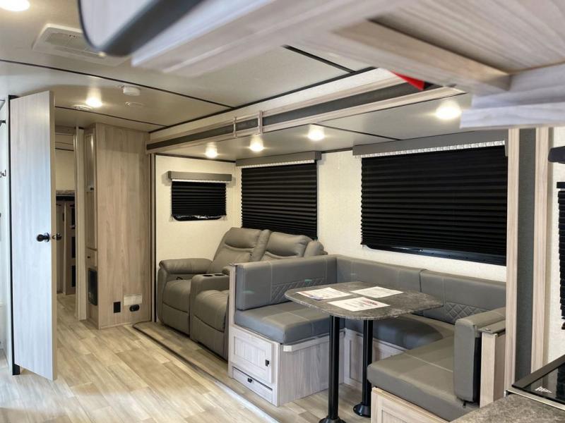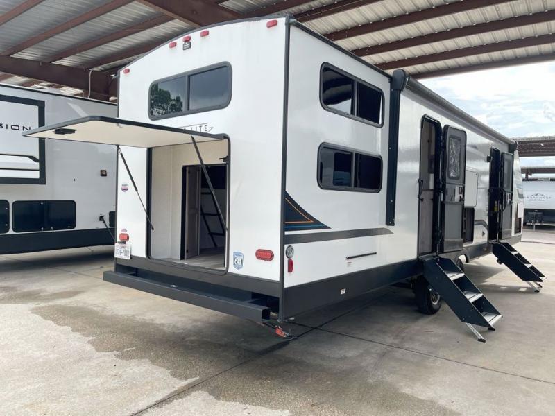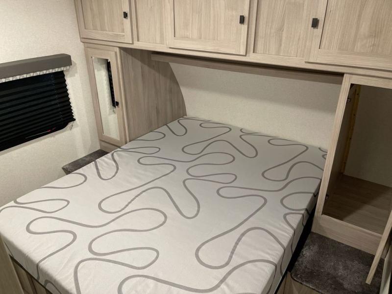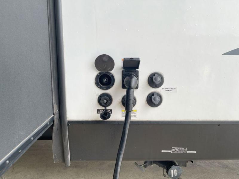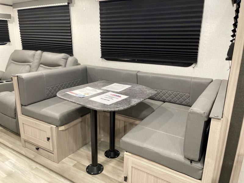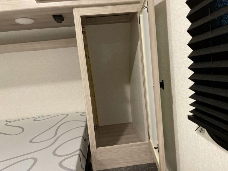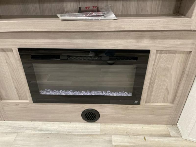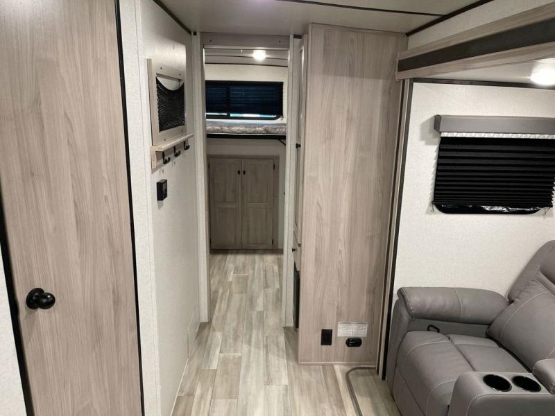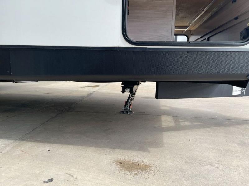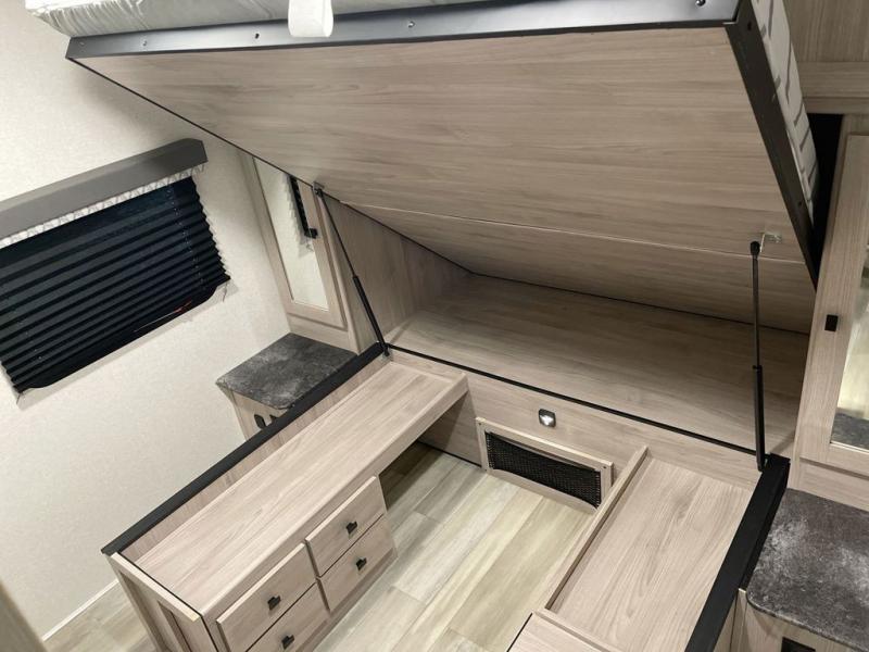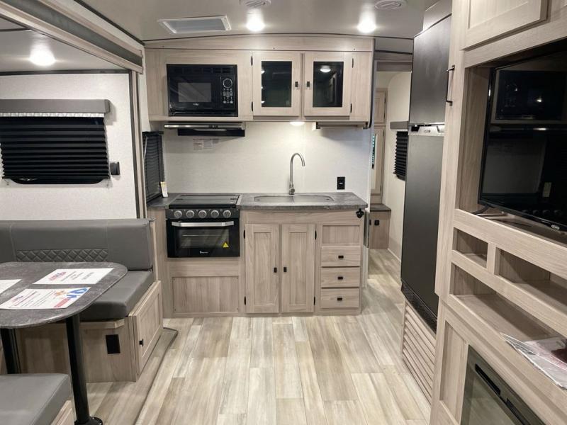 This travel trailer will be perfect to see family and friends in other states or camping for long-periods of time. There is an abundant amount of storage in the living and kitchen area, including behind the entertainment center in the hidden pantry and the second pantry with shelves, plus in the front bedroom under the queen bed with the MAX bed storage system. There is even storage in the rear private bunkhouse cabinet and countertop, plus along the exterior in the pass-through compartment and the Stor-More Cargo in the rear. The side Stor-More cargo door leads you into the bunkhouse to stow items like bikes and totes during travel. You will also love making meals in the kitchen with full amenities including a 10 cu. ft. refrigerator, and outside using the camp kitchen. And having dual entry just makes everything easy especially getting to the full bathroom.