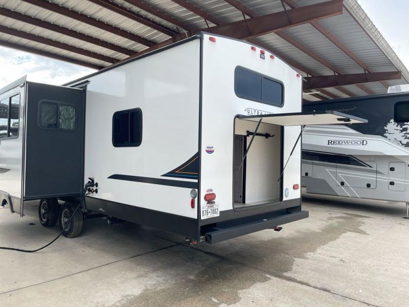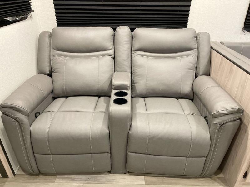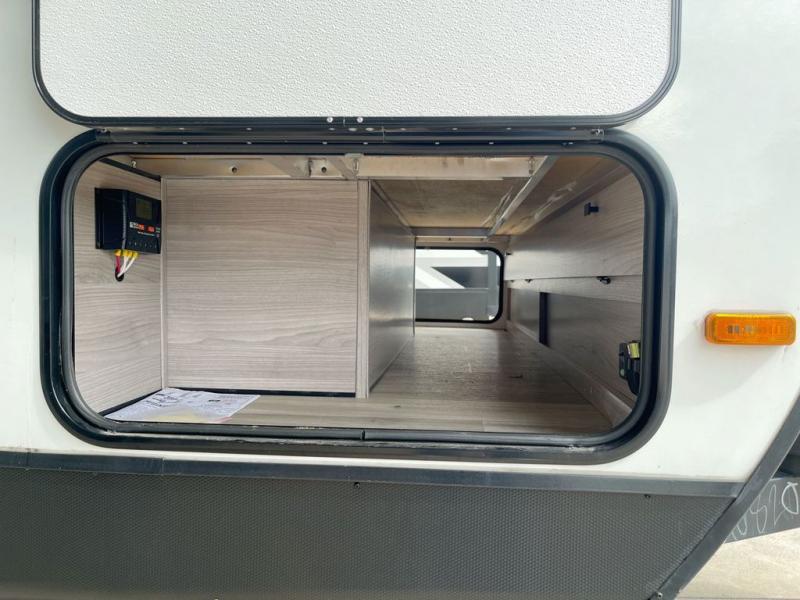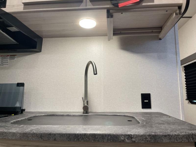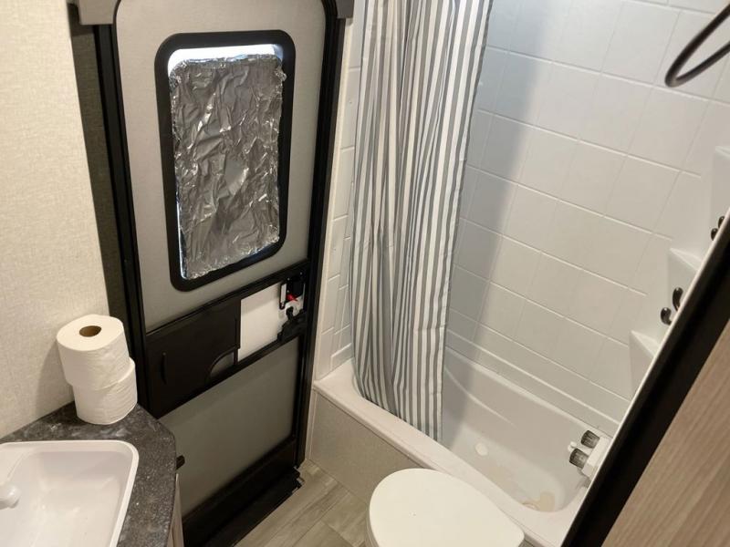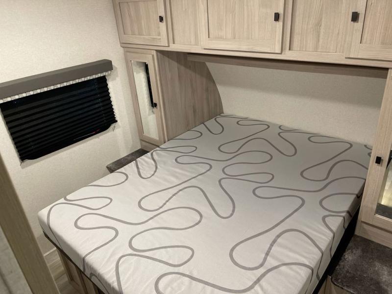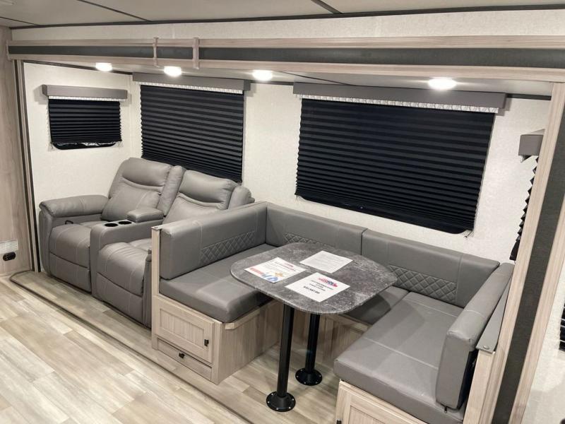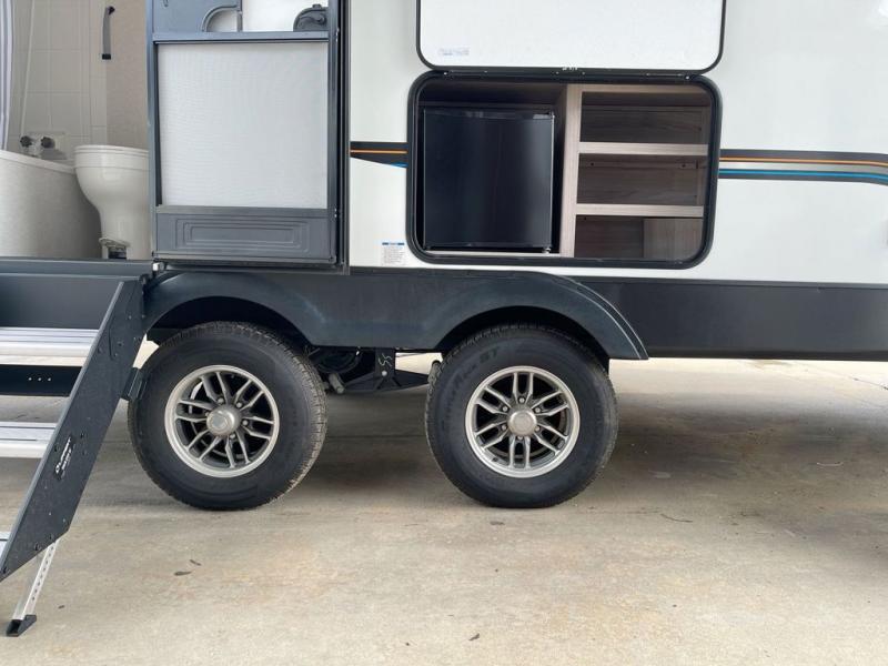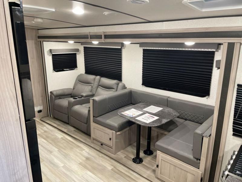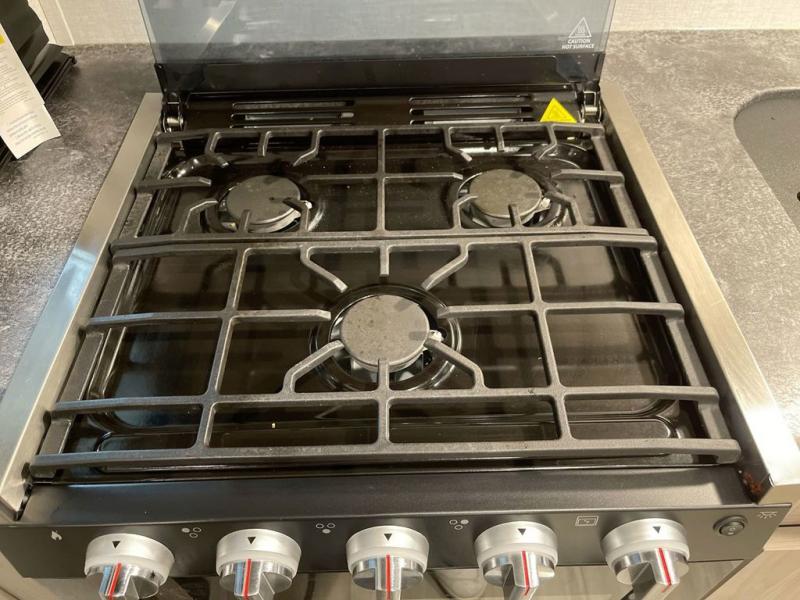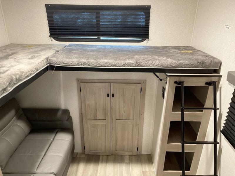 This travel trailer will be perfect to see family and friends in other states or camping for long-periods of time. There is an abundant amount of storage in the living and kitchen area, including behind the entertainment center in the hidden pantry and the second pantry with shelves, plus in the front bedroom under the queen bed with the MAX bed storage system. There is even storage in the rear private bunkhouse cabinet and countertop, plus along the exterior in the pass-through compartment and the Stor-More Cargo in the rear. The side Stor-More cargo door leads you into the bunkhouse to stow items like bikes and totes during travel. You will also love making meals in the kitchen with full amenities including a 10 cu. ft. refrigerator, and outside using the camp kitchen. And having dual entry just makes everything easy especially getting to the full bathroom.