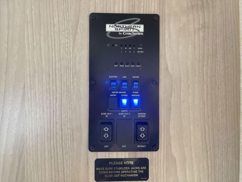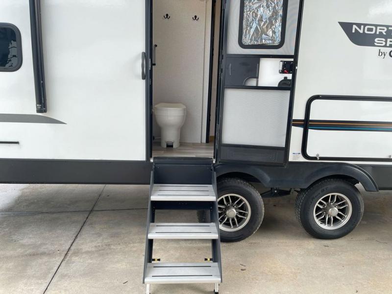 With any Northern Spirit Ultra Lite travel trailer by Coachmen, the "Twice Cool" dual ducted air conditioning system, the motion activated floor lights in the bedroom and bathroom, the lighted USB ports, the digital level, and the motion activated pass-through storage light plus fishing pole storage, will make your camping experience simplified. The heated and enclosed underbelly provides protection on the road and allows you to camp during any season, the 200W solar panel with 30 amp controller provides off-grid camping, and the power tongue jack makes setup easier. Each is built with a 3/4 painted fiberglass front cap with LED strip lights, a laminated, aluminum framed floor, rear wall, and sidewalls, plus 5" trusses with an interior vault. Make your decision today, and camp with everything in its place!