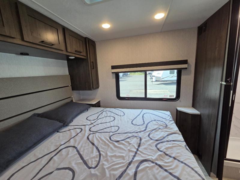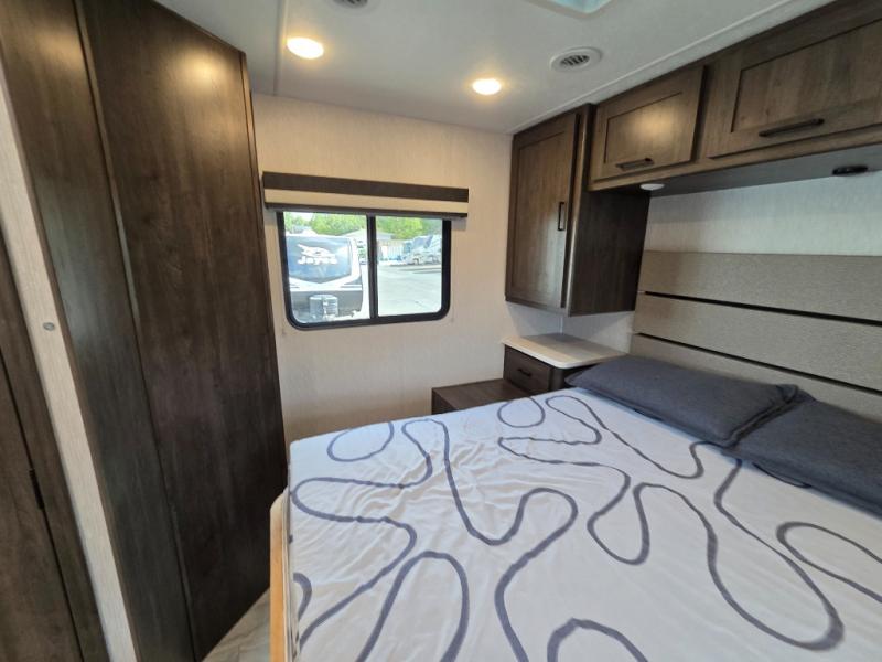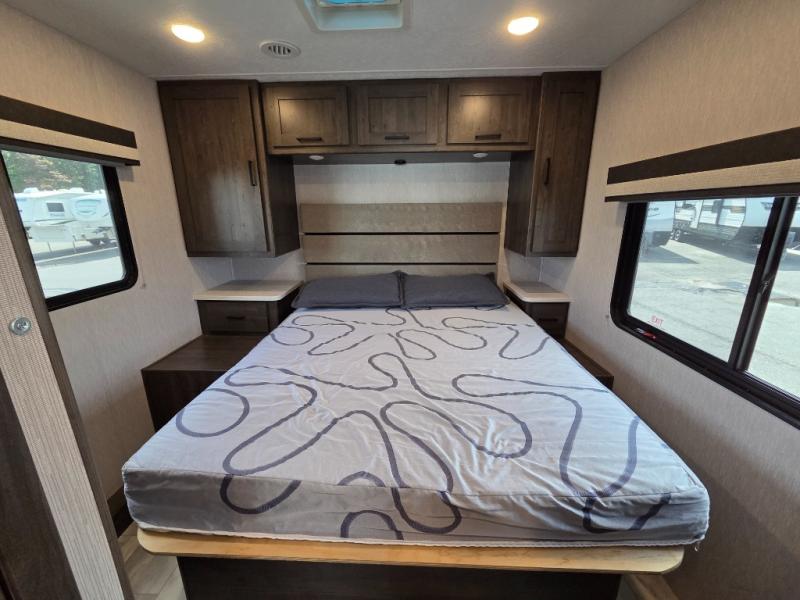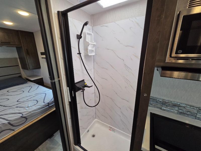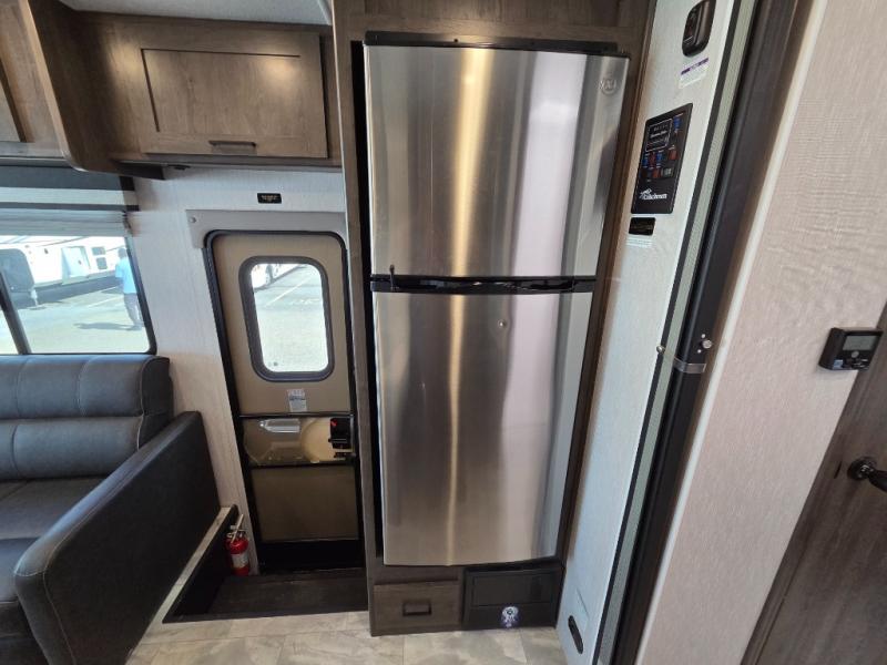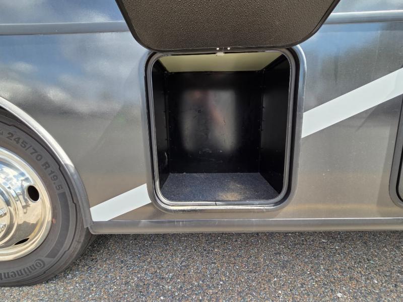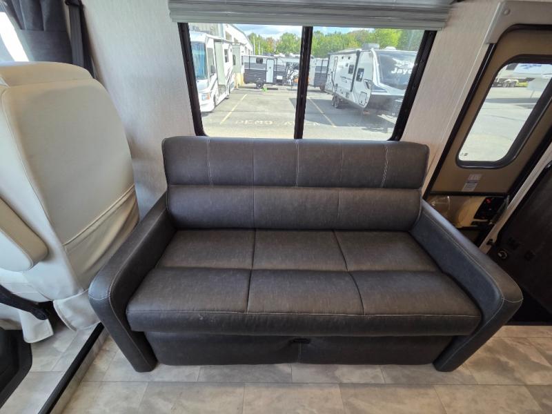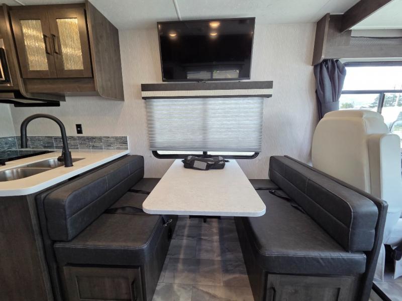 Live your best life on the road with this motorhome! The rear private bedroom has a 60" x 74" queen bed to lay your head on at night with wardrobes on either side of it for your clothes. A separated bathroom makes it easy for one person to freshen up in the 24" x 32" shower while another uses the private toilet and sink. Enjoy home cooked meals while out on the road with the stainless steel three burner cooktop, the 12V stainless steel double door 10 cu. ft. refrigerator, and even the stainless steel microwave oven. Eat your meals, play card games, and even transform the 42" x 70" booth dinette into an extra sleeping space. The 63" sofa has storage below for an extra blanket or board games. If you need to get some work done while you're away then you will appreciate the computer work station with 12V, 110V, and USB outlets in front of the passenger chair!