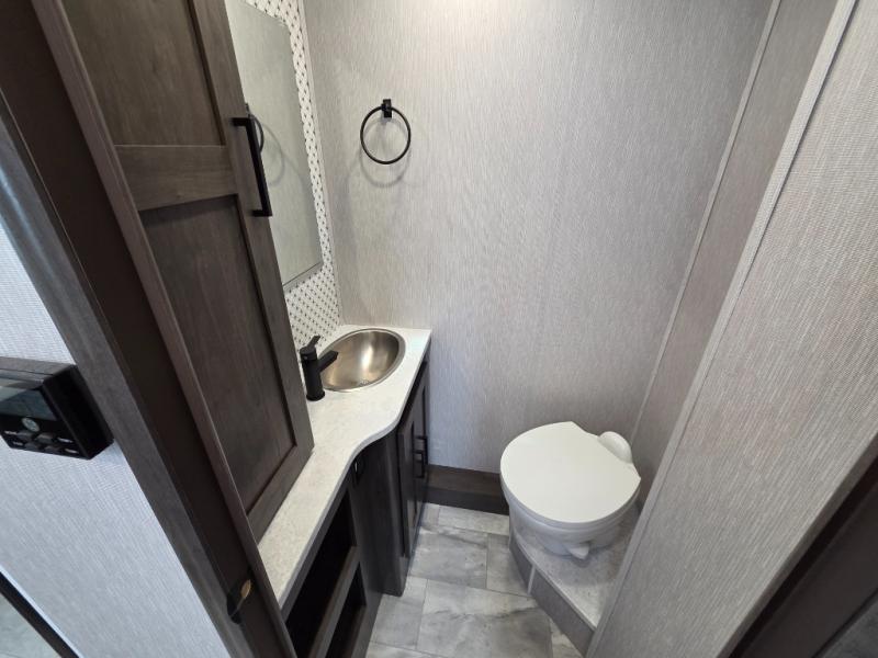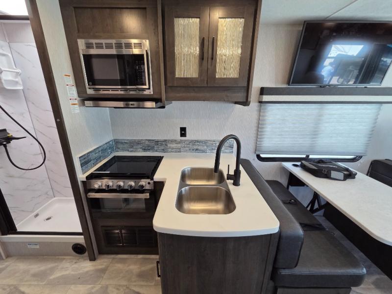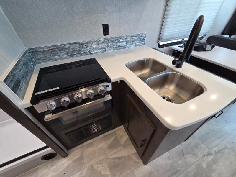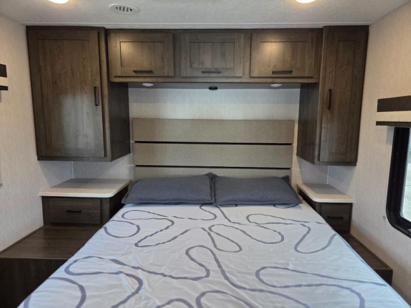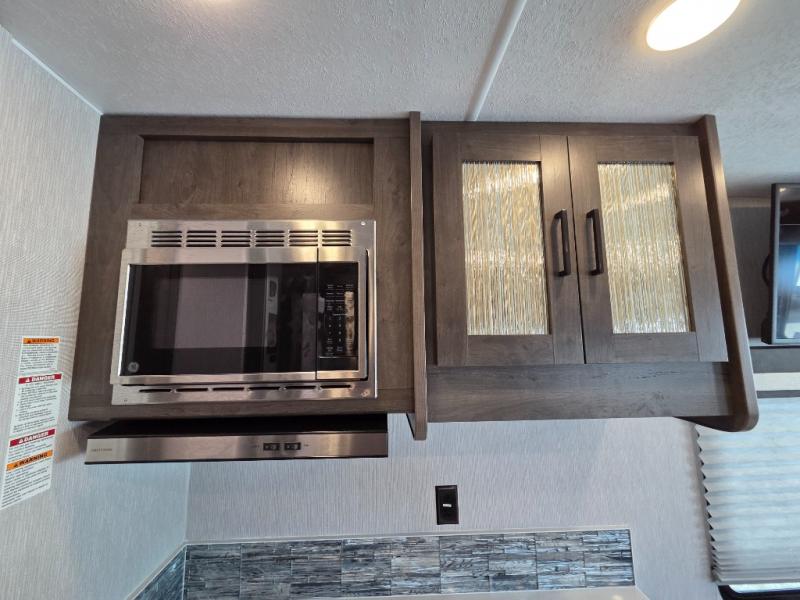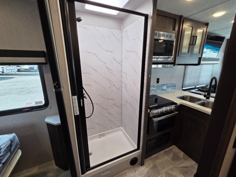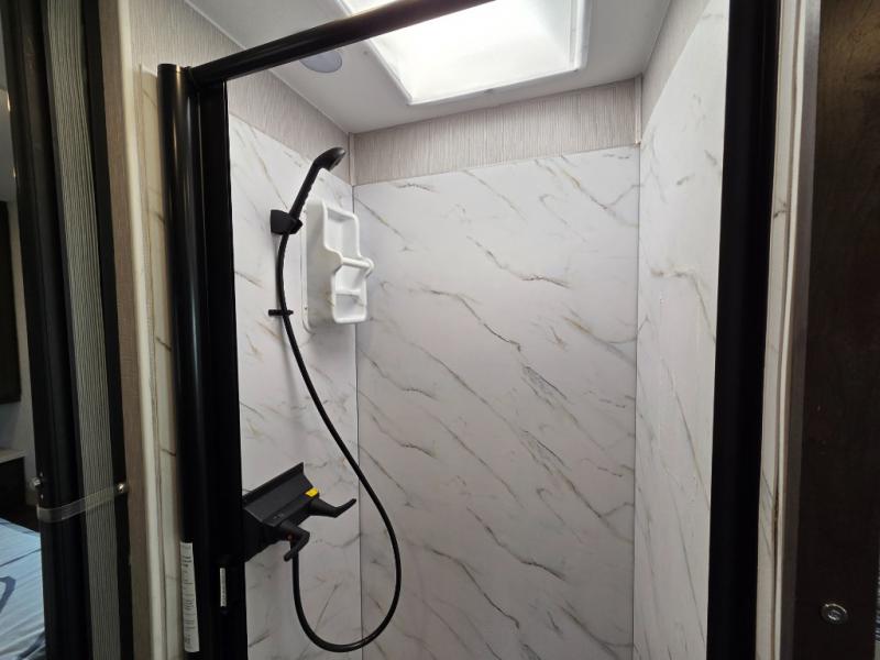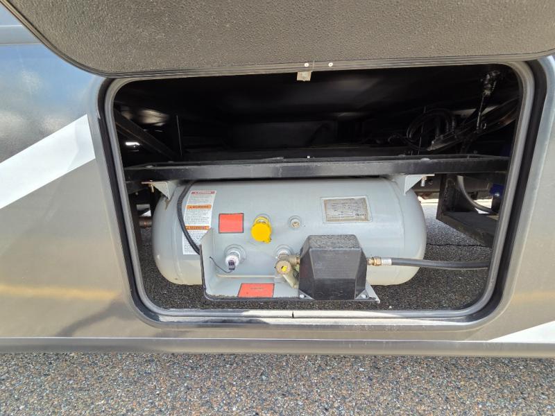 Live your best life on the road with this motorhome! The rear private bedroom has a 60" x 74" queen bed to lay your head on at night with wardrobes on either side of it for your clothes. A separated bathroom makes it easy for one person to freshen up in the 24" x 32" shower while another uses the private toilet and sink. Enjoy home cooked meals while out on the road with the stainless steel three burner cooktop, the 12V stainless steel double door 10 cu. ft. refrigerator, and even the stainless steel microwave oven. Eat your meals, play card games, and even transform the 42" x 70" booth dinette into an extra sleeping space. The 63" sofa has storage below for an extra blanket or board games. If you need to get some work done while you're away then you will appreciate the computer work station with 12V, 110V, and USB outlets in front of the passenger chair!