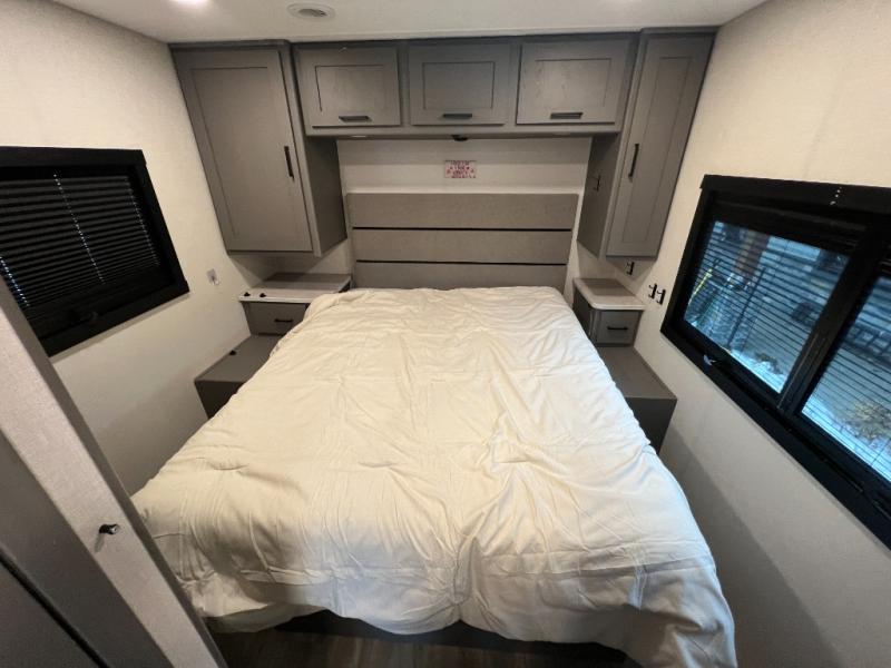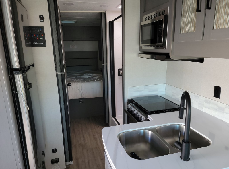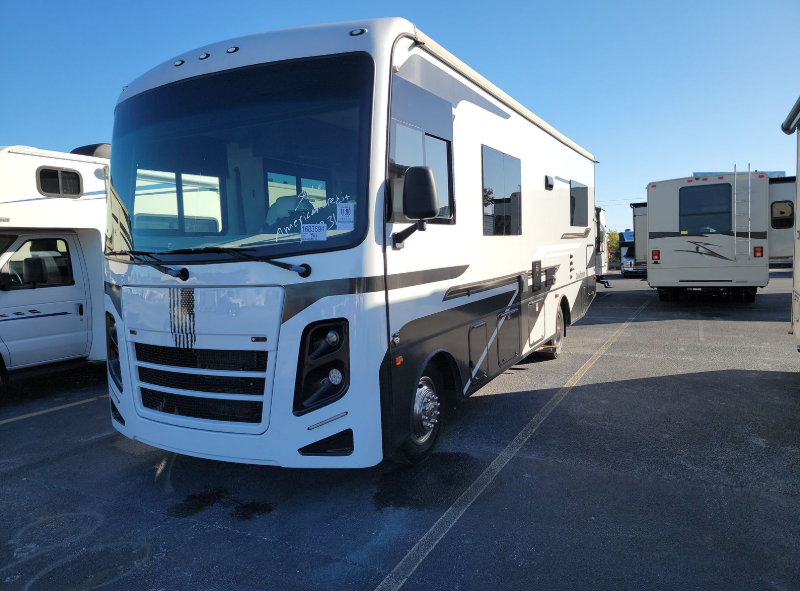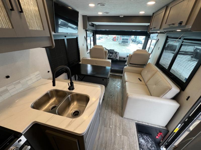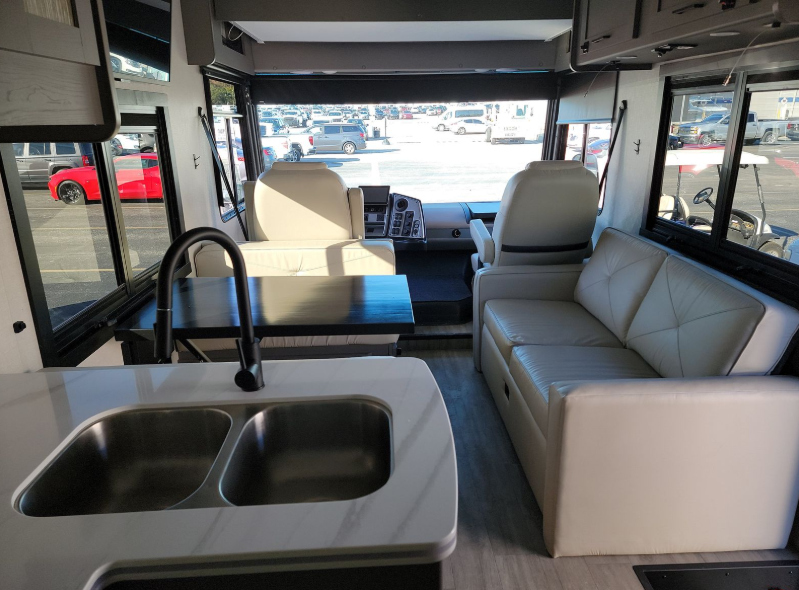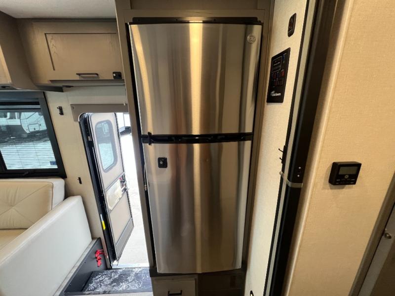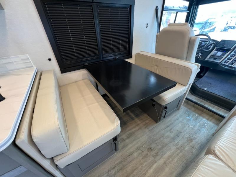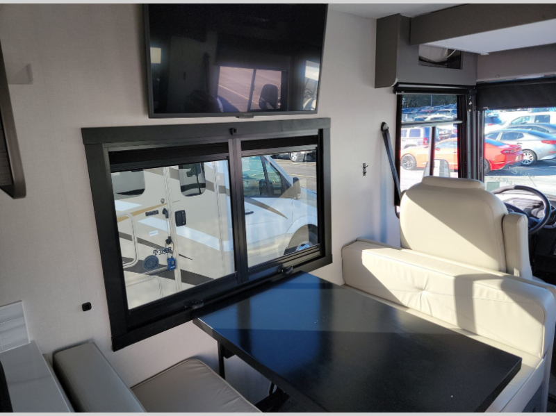 Live your best life on the road with this motorhome! The rear private bedroom has a 60" x 74" queen bed to lay your head on at night with wardrobes on either side of it for your clothes. A separated bathroom makes it easy for one person to freshen up in the 24" x 32" shower while another uses the private toilet and sink. Enjoy home cooked meals while out on the road with the stainless steel three burner cooktop, the 12V stainless steel double door 10 cu. ft. refrigerator, and even the stainless steel microwave oven. Eat your meals, play card games, and even transform the 42" x 70" booth dinette into an extra sleeping space. The 63" sofa has storage below for an extra blanket or board games. If you need to get some work done while you're away then you will appreciate the computer work station with 12V, 110V, and USB outlets in front of the passenger chair!