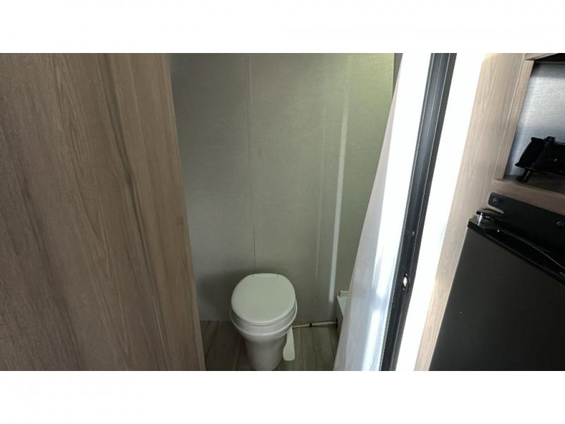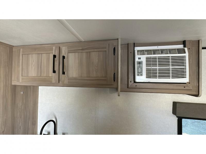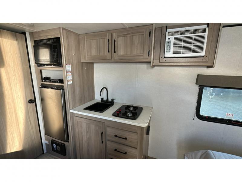 Enjoy camping in this cute Remote trailer features a rear full bath including shower with skylight for more natural lighting, a vanity with sink, and overhead storage. A 54" x 74" bed will be waiting for two of you to provide a comfortable night's rest, and if you have a third camper you can convert the dinette for sleeping for one more, or maybe two small children. Dine inside at the booth dinette and play card games at the table, or enjoy spending time outside under the power awning with LED light. You can even cook burgers and dogs while enjoying nice weather with the help of the outdoor cast iron griddle.