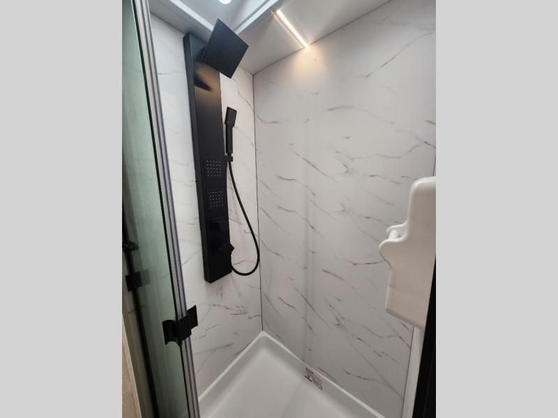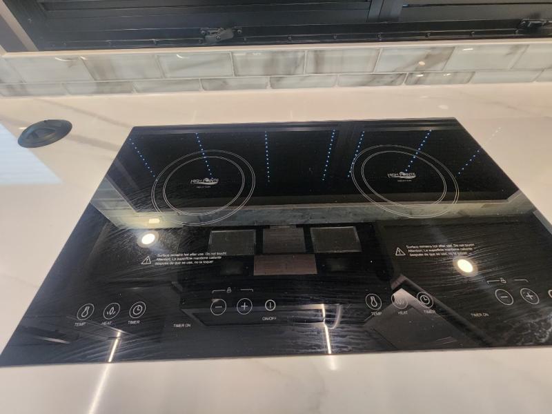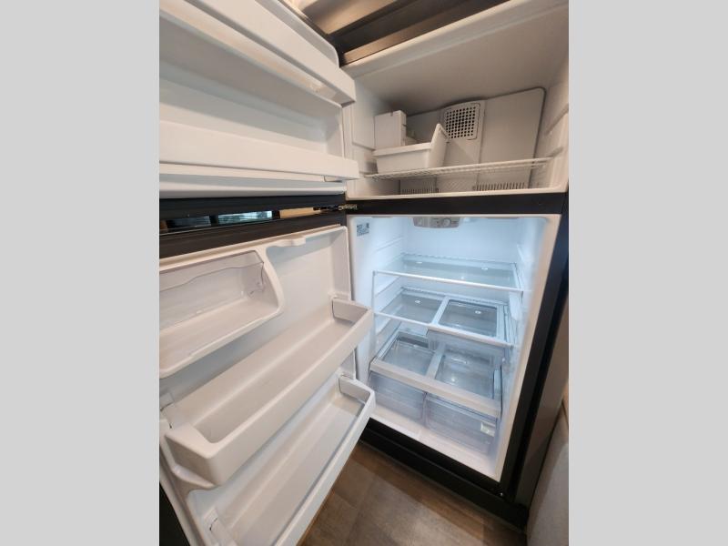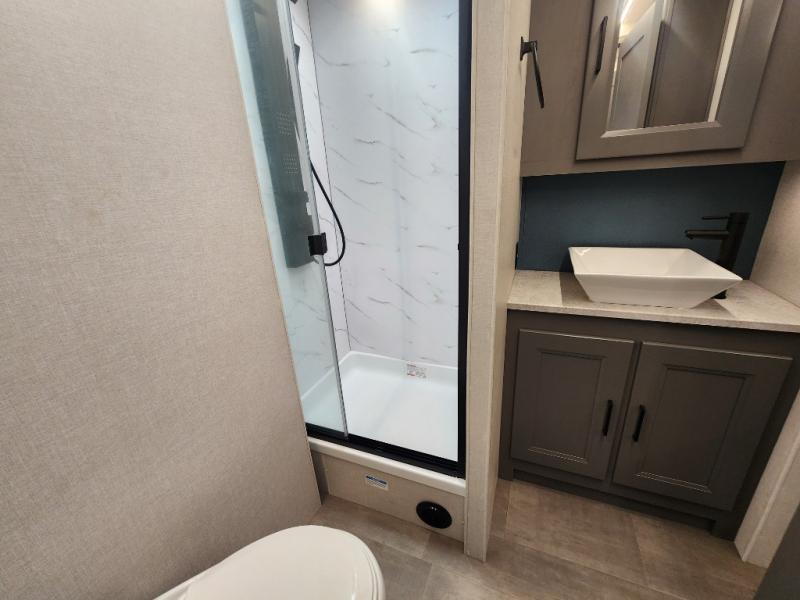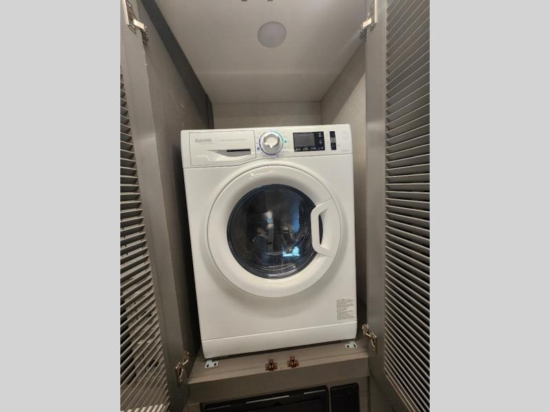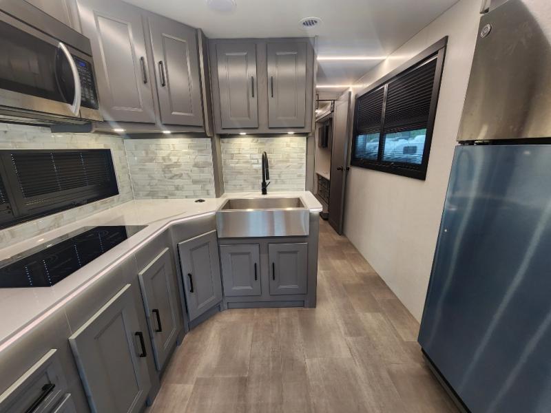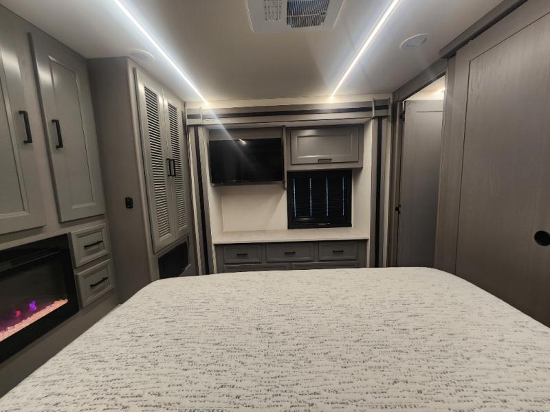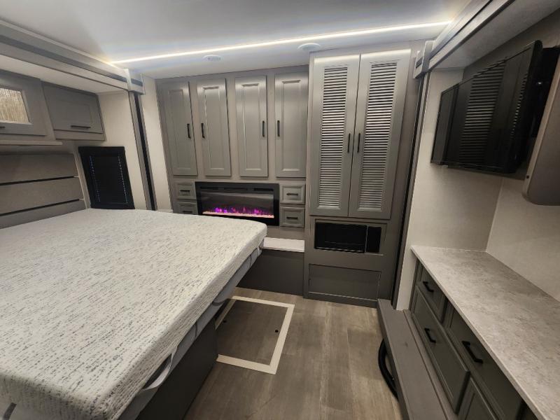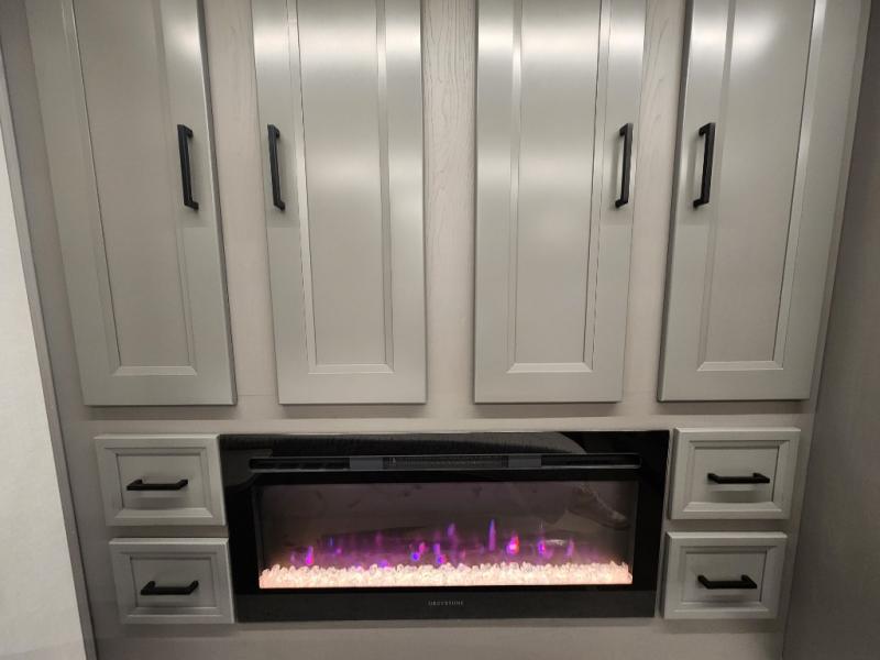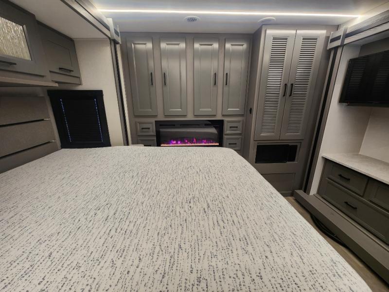 You will fall in love the amount of space you have with this coach! There are dual opposing slides in the rear master bedroom, along with a queen bed, multiple wardrobes, one with washer/dryer prep, plus a bedroom fireplace! Since there is a dual entry bath, you can easily use it at night from the bedroom entrance, and your guests can use the hallway entrance. The fully-equipped kitchen allows you to cook meals each day on the two burner induction cooktop or in the convection microwave oven. Your crew can dine at the free-standing dinette or take their plate outdoors to sit under the 18' power awning. There is also a 68" sofa bed slide inside and a drop-down overhead bunk where guests can sleep!