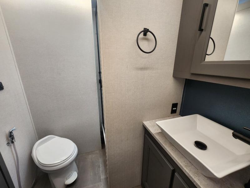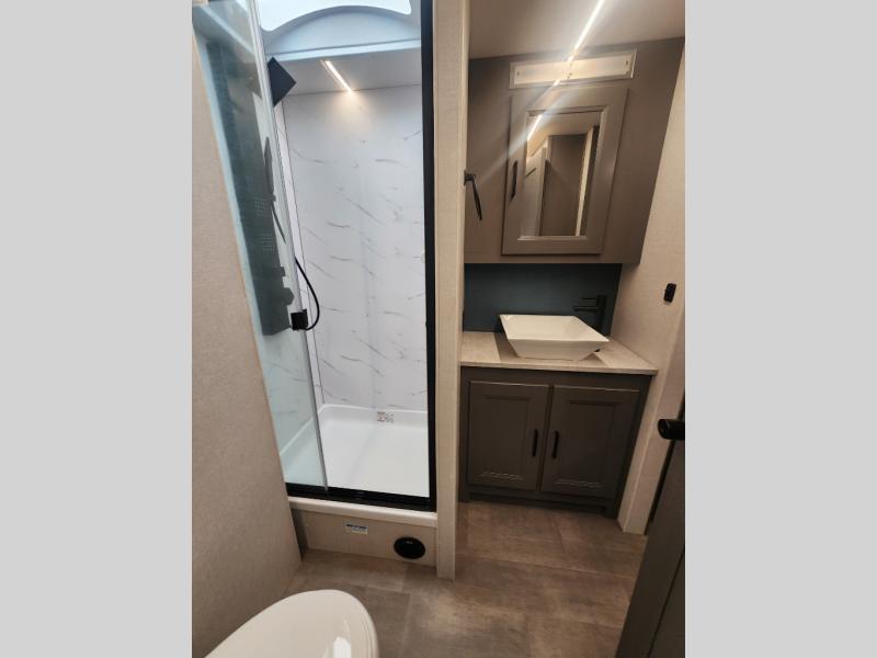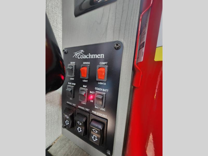The Sportscoach SRS Class A diesel motorhome by Coachmen sits on a straight rail Freightliner chassis with a 340 HP ISB Cummings rear diesel engine that will deliver power to your excursions. Each coach features chassis air suspension and air brakes, an 8,000 lb. towing hitch, and an outside entertainment center with an LED TV to watch the big game outdoors. Some of the electrical, heating, and AC amenities you will appreciate are the 6.0 kW diesel generator, the 100 watt solar panel with a controller, and the two 15,000 BTU A/C units. The galley features convenient pop-up recept with USB ports, stylish kitchen backsplash, and a stainless steel farmhouse style sink that will make clean-up easier than ever. Comfort will come easy with the upgraded mattress in the bedroom, along with a residential style headboard and a king bed. Affordable, powerful, and comfortable; what's not to love about the Sportscoach SRS Class A diesel coach!