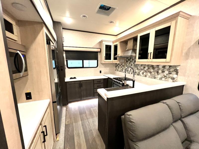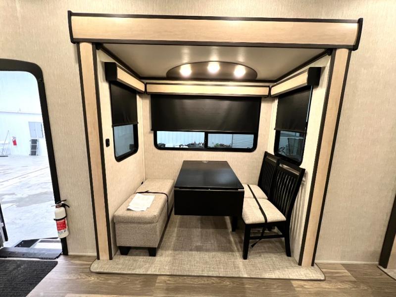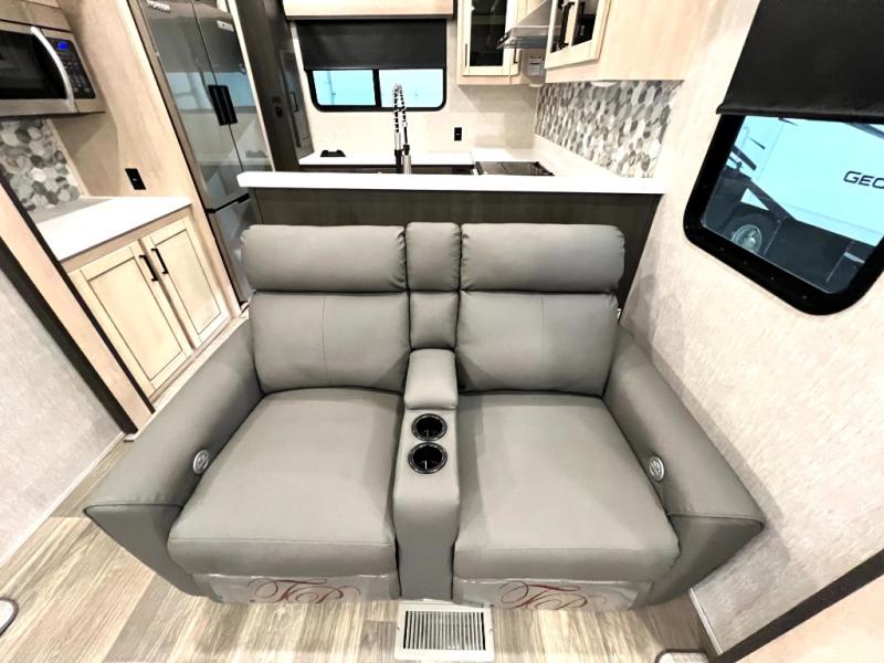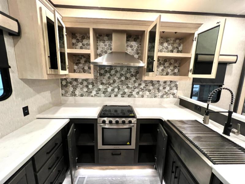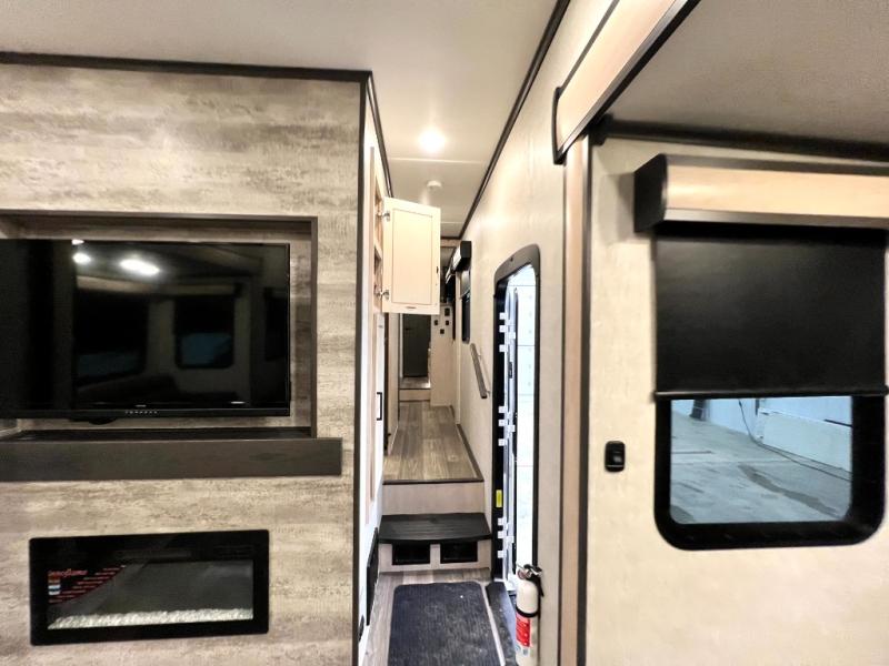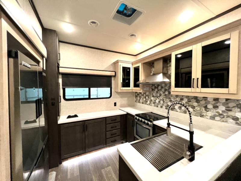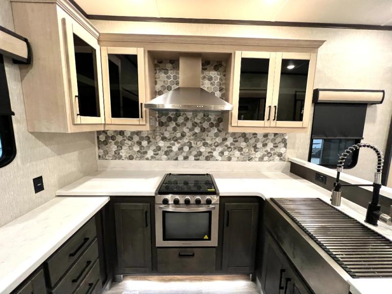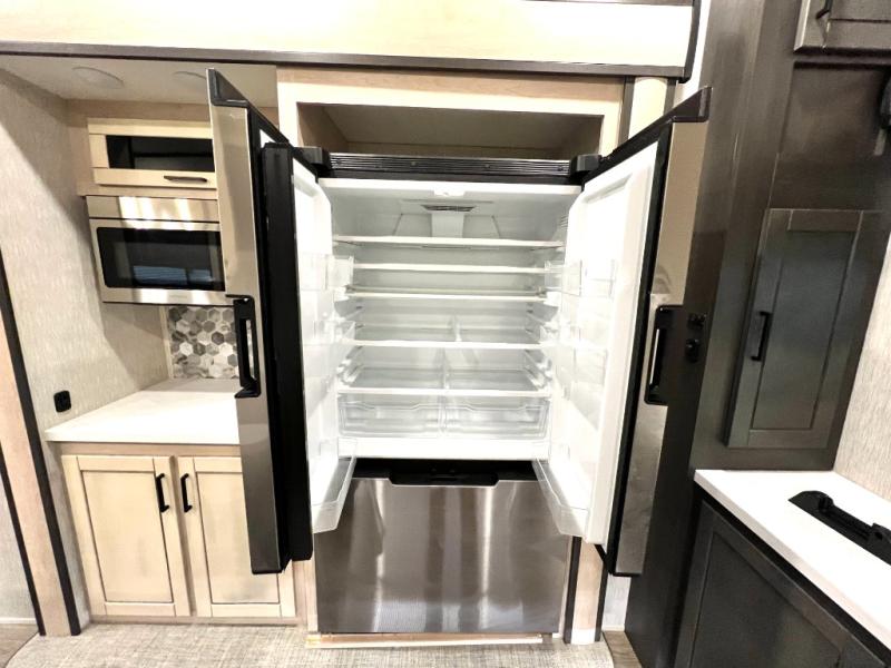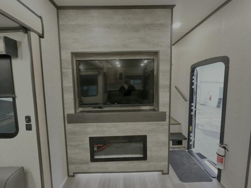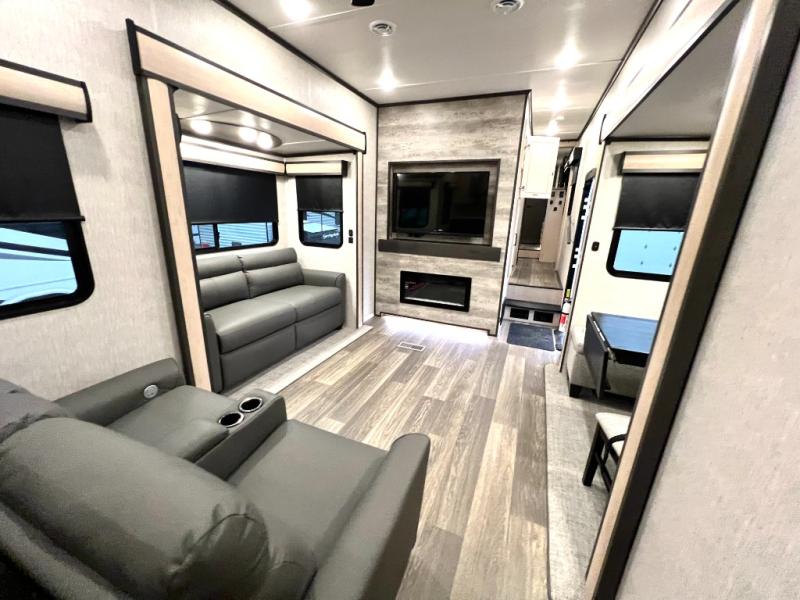 The chef will enjoy cooking in the rear kitchen of this fifth wheel! It features the Furrion kitchen collection, lots of countertop space to prepare their best meals, overhead cabinets to store all the cooking essentials, and even a microwave to pop a bag of popcorn. The living area has a tri-fold sofa slide, power theater seating across from an entertainment center with a fireplace, and a ceiling fan above it all for good air circulation. The dinette table slide creates more interior space and is a comfortable place to eat meals. Freshen up in the dual entry bathroom with a 48" shower with a seat and a dual sink vanity then head directly into the front private bedroom. The bedroom has a king bed slide to lay your head at night, a dresser with a fireplace, and 39" TV for your entertainment. There is even a front closet with a shoe shelf and an area prepped to add an optional washer and dryer!
