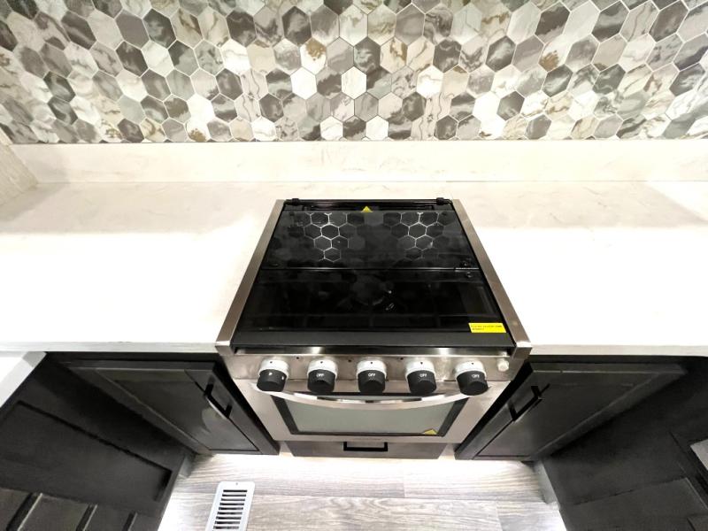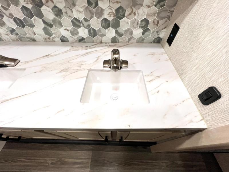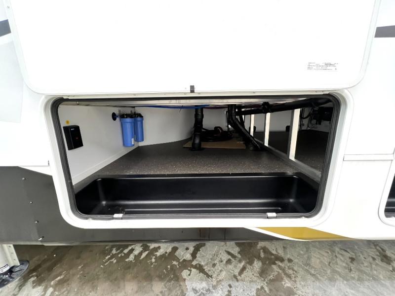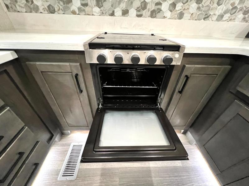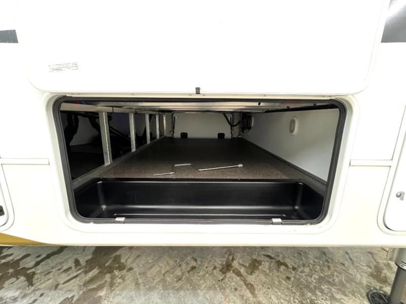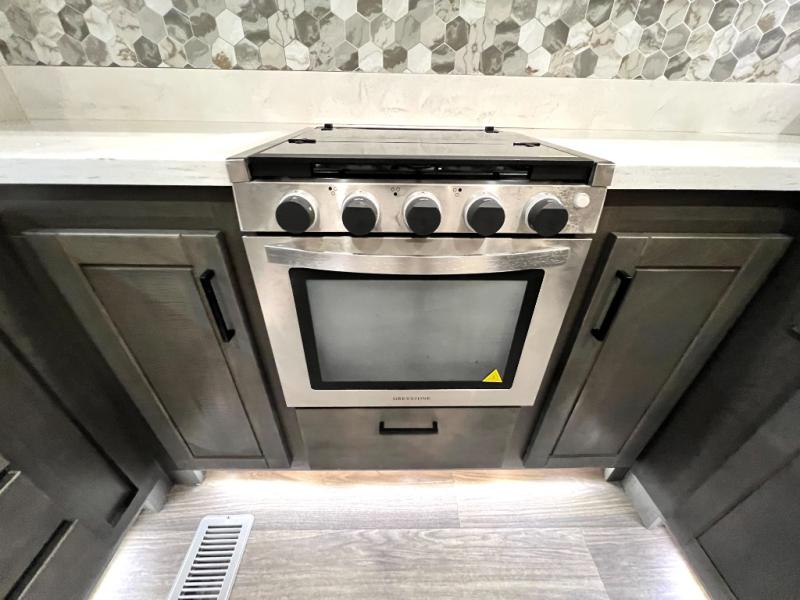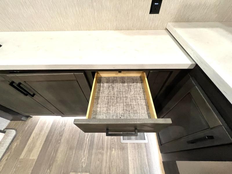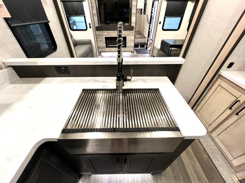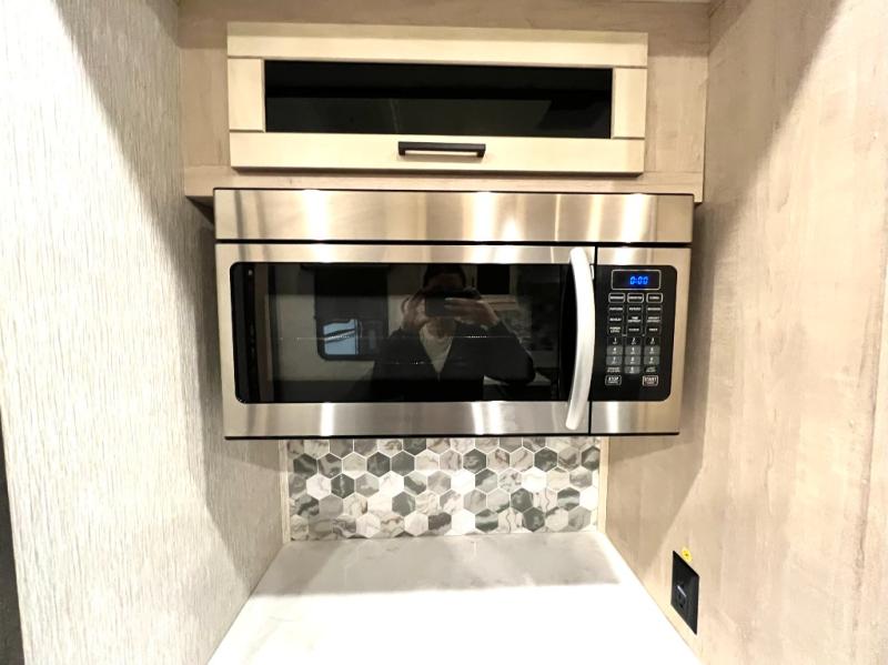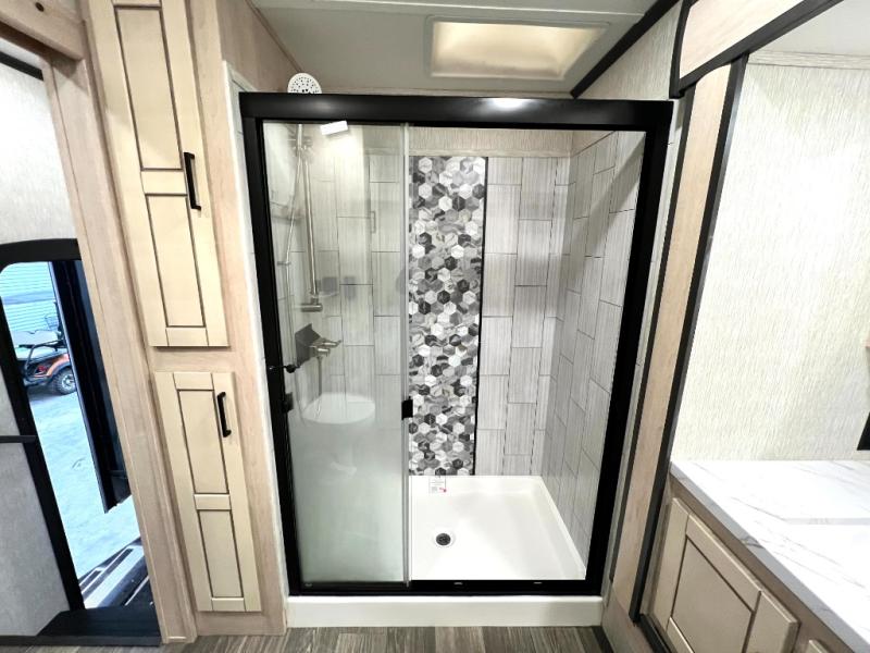 The chef will enjoy cooking in the rear kitchen of this fifth wheel! It features the Furrion kitchen collection, lots of countertop space to prepare their best meals, overhead cabinets to store all the cooking essentials, and even a microwave to pop a bag of popcorn. The living area has a tri-fold sofa slide, power theater seating across from an entertainment center with a fireplace, and a ceiling fan above it all for good air circulation. The dinette table slide creates more interior space and is a comfortable place to eat meals. Freshen up in the dual entry bathroom with a 48" shower with a seat and a dual sink vanity then head directly into the front private bedroom. The bedroom has a king bed slide to lay your head at night, a dresser with a fireplace, and 39" TV for your entertainment. There is even a front closet with a shoe shelf and an area prepped to add an optional washer and dryer!