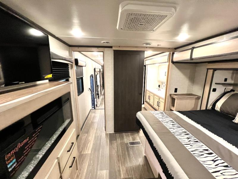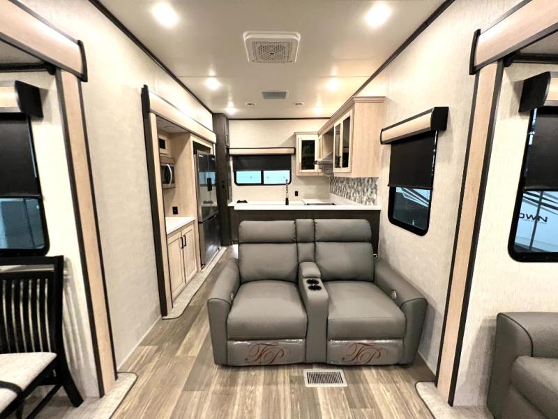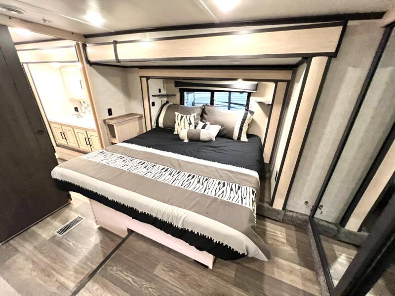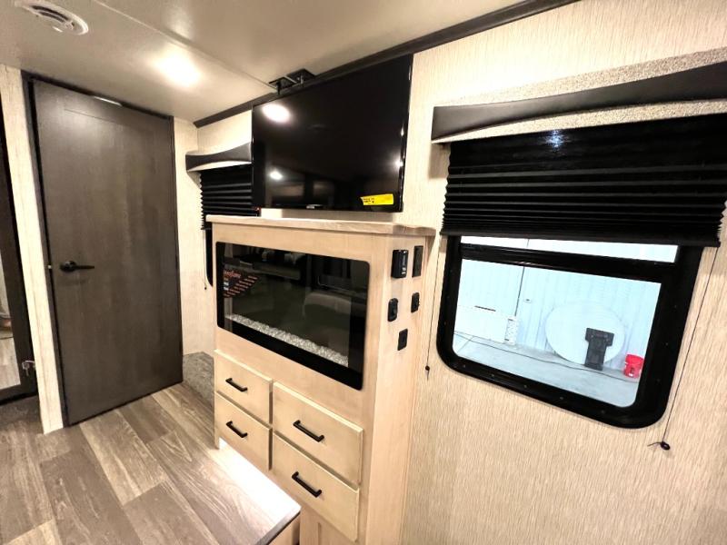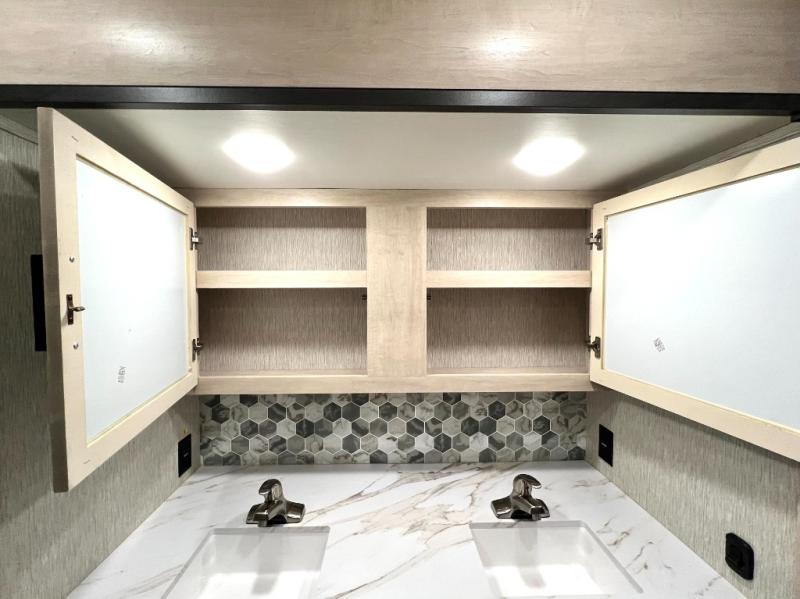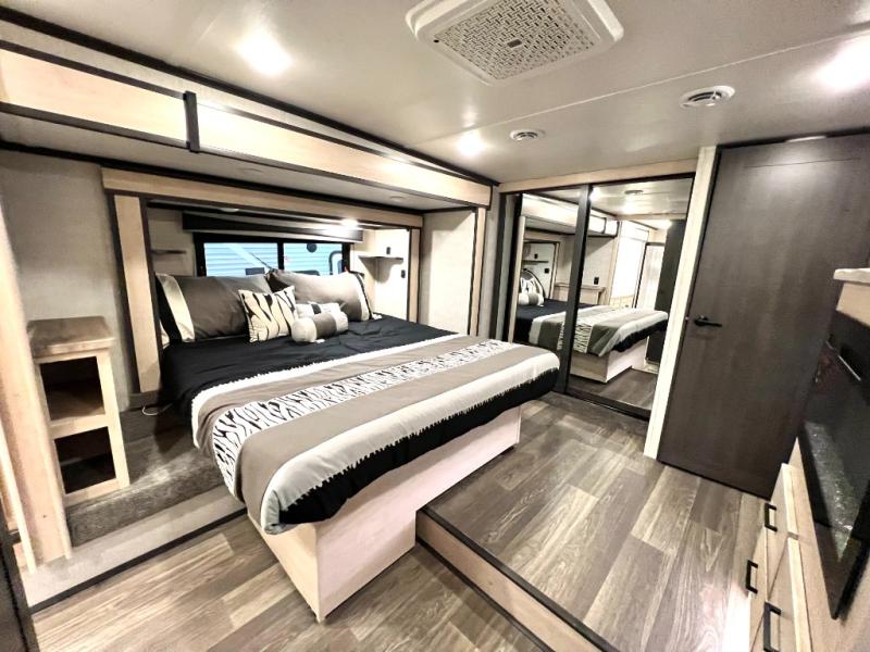 Every element of your home has been considered when creating these CrossRoads RV Cameo fifth wheels! From the oversized pantries, master suites, and full size theater seats with heat and massage to durable construction with the largest I-beam chassis in the industry. They also have the industry's first front windshield, an aerodynamic profile, and a full walk-on roof with an Alpha Ply II roof material. These modern fifth wheels were created with the customer in mind which is why they have convenient features like pass-through heated storage, spacious walk-in closets, an AM/FM/Bluetooth sound bar, a 6-point hydraulic auto level, and a 2" receiving hitch with 4-way plug. The Twice Is Nice package adds even more comforts like dual fireplaces for cozy evenings inside, dual awnings to protect you rain or shine, dual A/C units to keep you cool on those hot summer days, and dual wireless charging stations so your electronics can be at 100%. Come find the right model for you!
