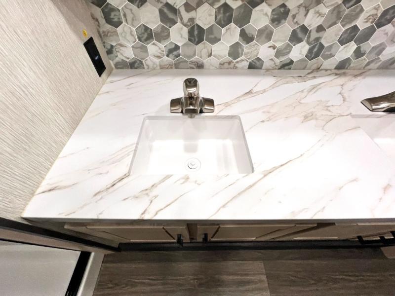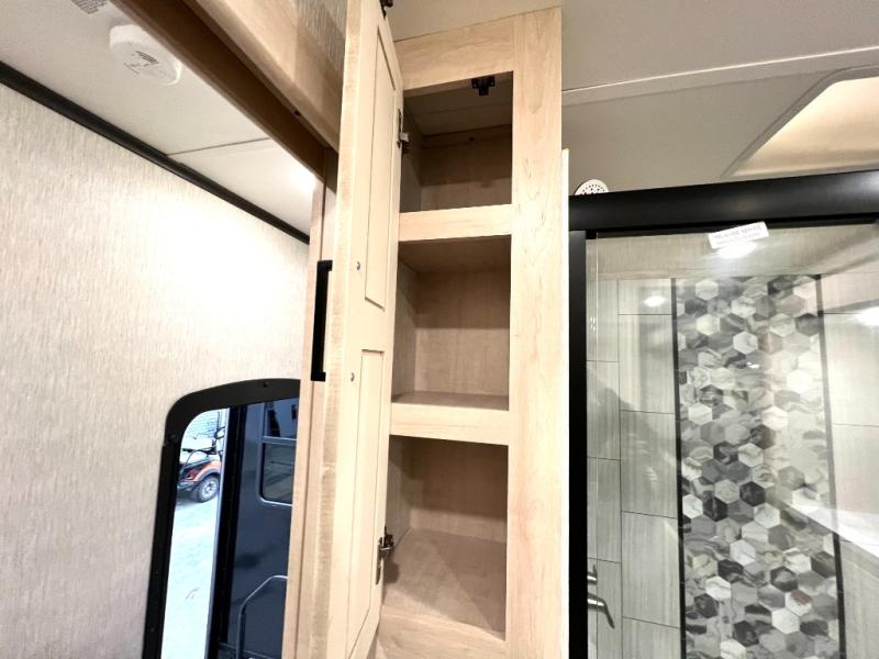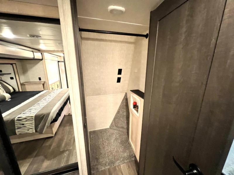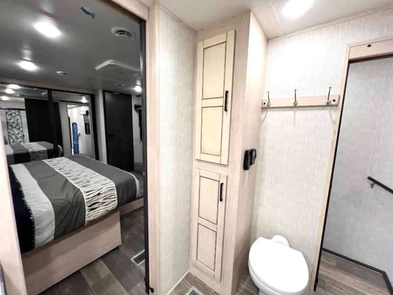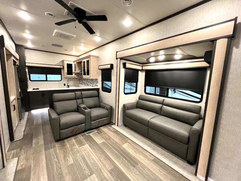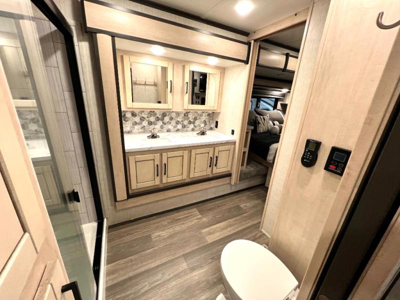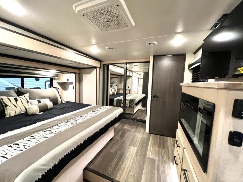 Every element of your home has been considered when creating these CrossRoads RV Cameo fifth wheels! From the oversized pantries, master suites, and full size theater seats with heat and massage to durable construction with the largest I-beam chassis in the industry. They also have the industry's first front windshield, an aerodynamic profile, and a full walk-on roof with an Alpha Ply II roof material. These modern fifth wheels were created with the customer in mind which is why they have convenient features like pass-through heated storage, spacious walk-in closets, an AM/FM/Bluetooth sound bar, a 6-point hydraulic auto level, and a 2" receiving hitch with 4-way plug. The Twice Is Nice package adds even more comforts like dual fireplaces for cozy evenings inside, dual awnings to protect you rain or shine, dual A/C units to keep you cool on those hot summer days, and dual wireless charging stations so your electronics can be at 100%. Come find the right model for you!