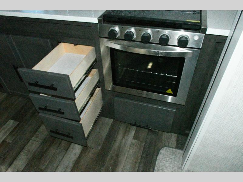 • Rear Kitchen Layout with abundant counterspace and storage for serious campsite cooking