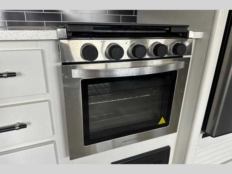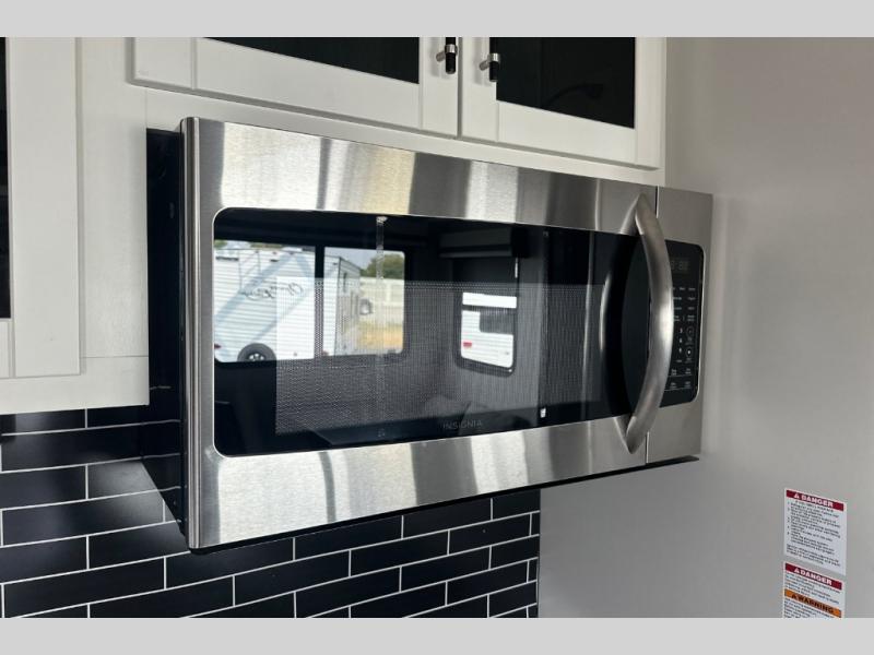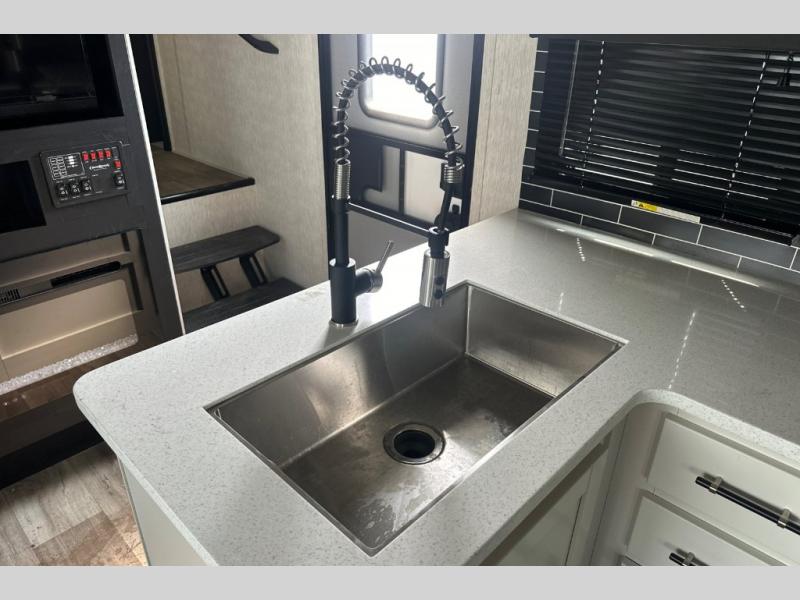 If you've been dreaming of camping with friends and family, take a look at this fifth wheel that can sleep nine people each night. The little ones will spend their time in the private bunkhouse when they're not outside riding their bikes. The half bath includes its own exterior entry door so your guests won't drag dirt through the whole trailer just to use the restroom, and the second entry door conveniently leads into the main living area. Here, you can relax on the booth dinette and tri-fold sofa within the large slide out, and if you're wanting even more comfort, just choose the optional power theatre seats in place of the tri-fold sofa. You will find all the appliances indoors to prepare meals each day, plus there is an exterior kitchen that will be perfect when frying fish or bacon!