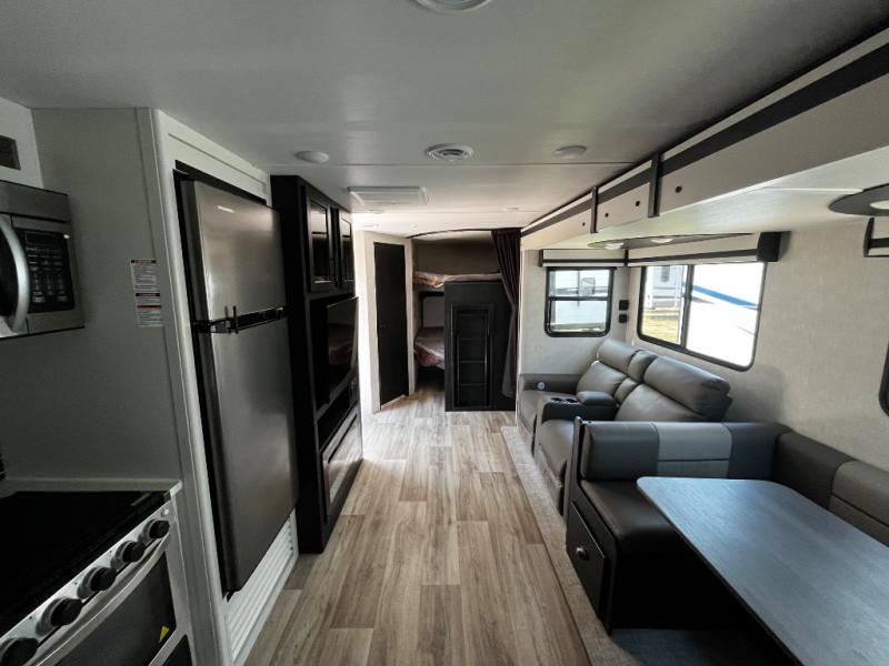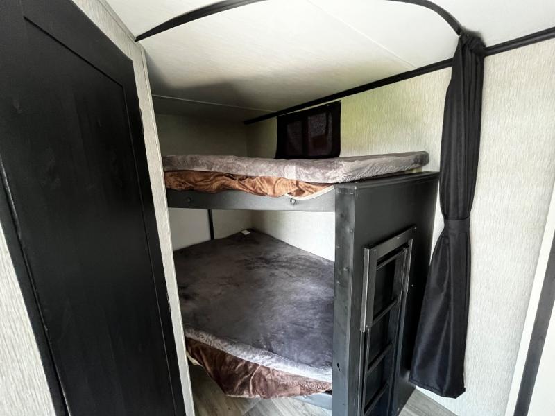 The kids or friends will be begging to go camping every other weekend in this travel trailer that includes double-size bunks. You'll appreciate the door by the bunks and the bottom hinge that will allow you to easily load luggage, coolers, or lawn chairs. Set up the power awning once you arrive at your destination, then prepare lunch on the outside kitchen. You can dine outside on the picnic table, or sit around the U-shaped dinette inside the unit. You will love the front private bedroom that includes a king bed for all-around comfort, plus your own exterior entry door for convenience!