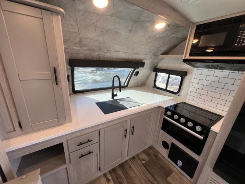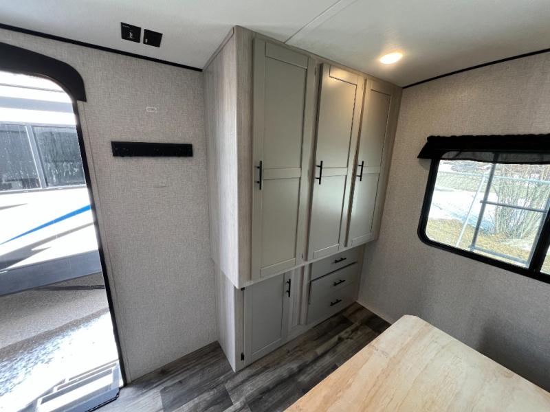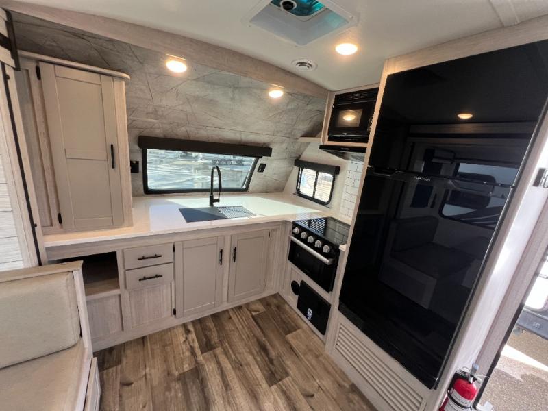 With any Sunset Trail travel trailer by CrossRoads RV, the interior offers a stainless steel farmhouse sink with a cover, solid surface kitchen countertops, and a docking station with 12 Volt, USB Port, and 110 Outlets. Also included is a 13,500 BTU air conditioner plus upgraded insulation with roof and floor reflective foil for added comfort, plus sturdy construction elements like a plywood bed board with strut assist, residential wood window trim, and hardwood cabinet doors. Make your lightweight and comfortable RV decision today!