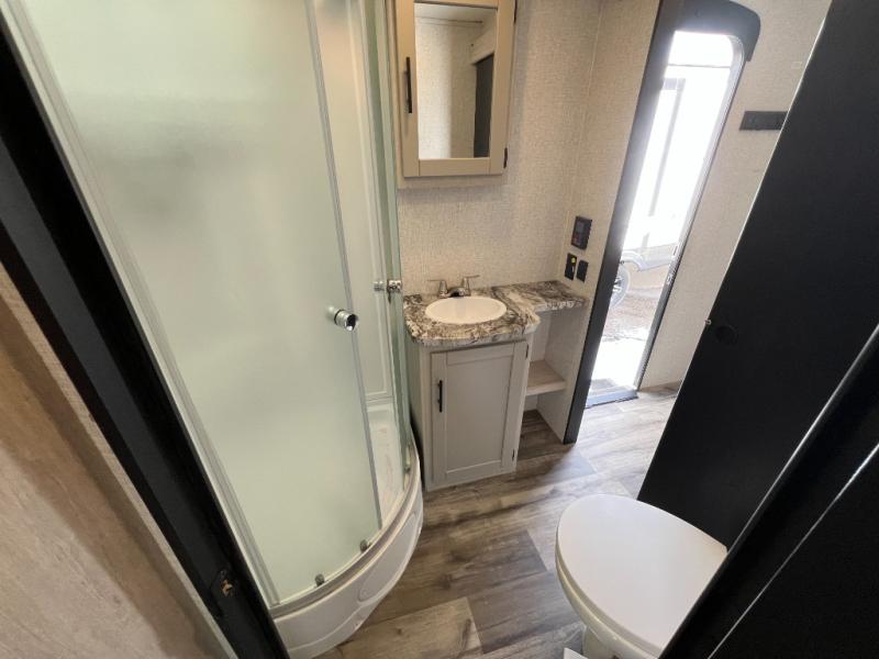 You will love this trailer for many reasons beginning with having dual entry for easy access to the spacious rear bedroom or the main living and kitchen area. The cook will love the front kitchen with lots of counter space, a window to enjoy the view and all the kitchen amenities to make warm meals for the two of you plus anyone that visits. The slide out sofa and booth dinette offer sleeping space for the grandkids on top of relaxation inside when you aren't outside under the electric awning with LED lights. You will have a full bathroom to get cleaned up after a fun day outside, and a rear master bedroom with a king bed slide out, storage and a rear window for more great views!