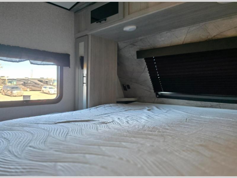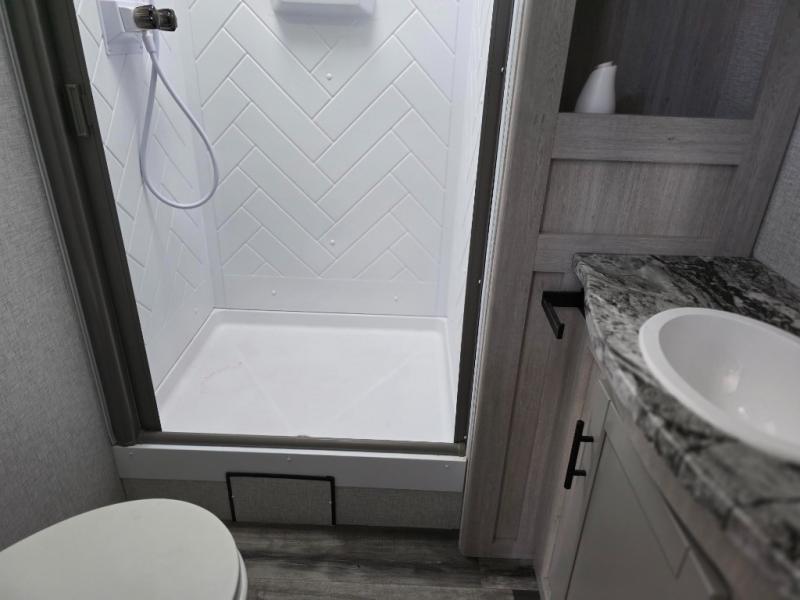 With any Sunset Trail travel trailer by CrossRoads RV, the interior offers a stainless steel farmhouse sink with a cover, solid surface kitchen countertops, and a docking station with 12 Volt, USB Port, and 110 Outlets. Also included is a 13,500 BTU air conditioner plus upgraded insulation with roof and floor reflective foil for added comfort, plus sturdy construction elements like a plywood bed board with strut assist, residential wood window trim, and hardwood cabinet doors. Make your lightweight and comfortable RV decision today!