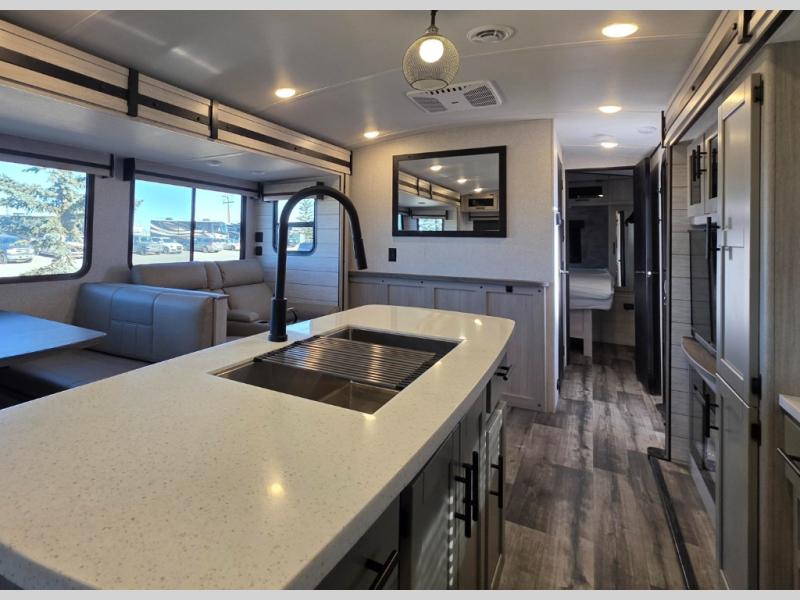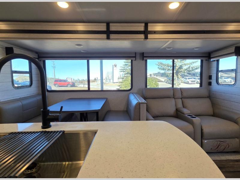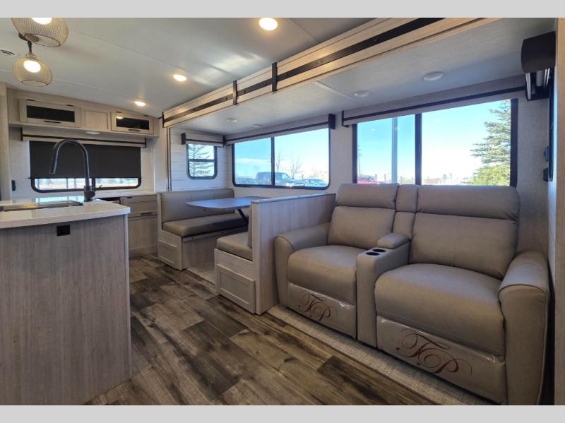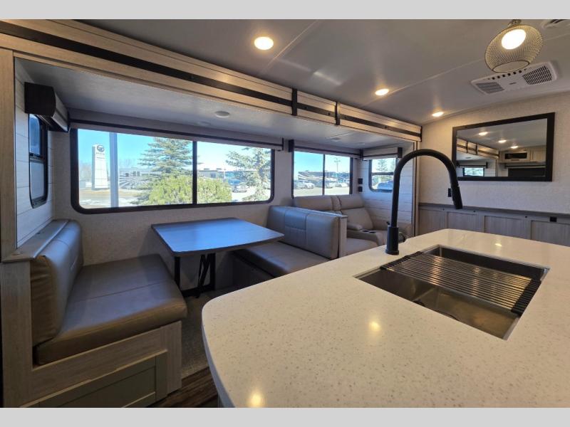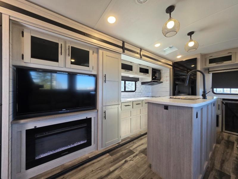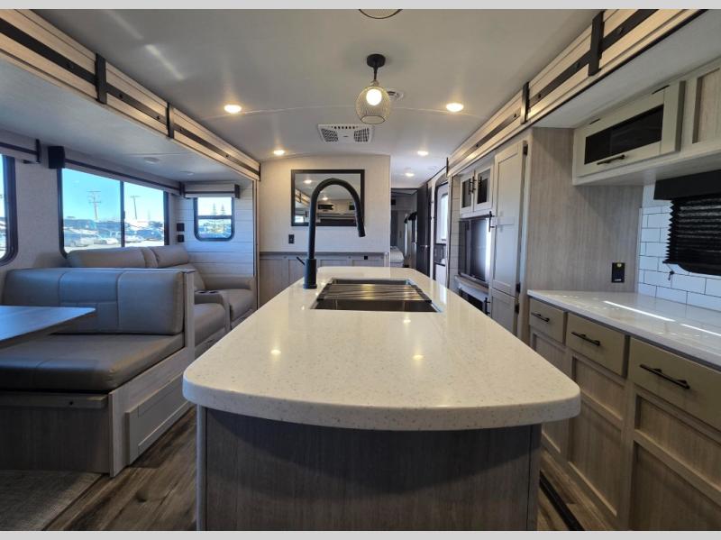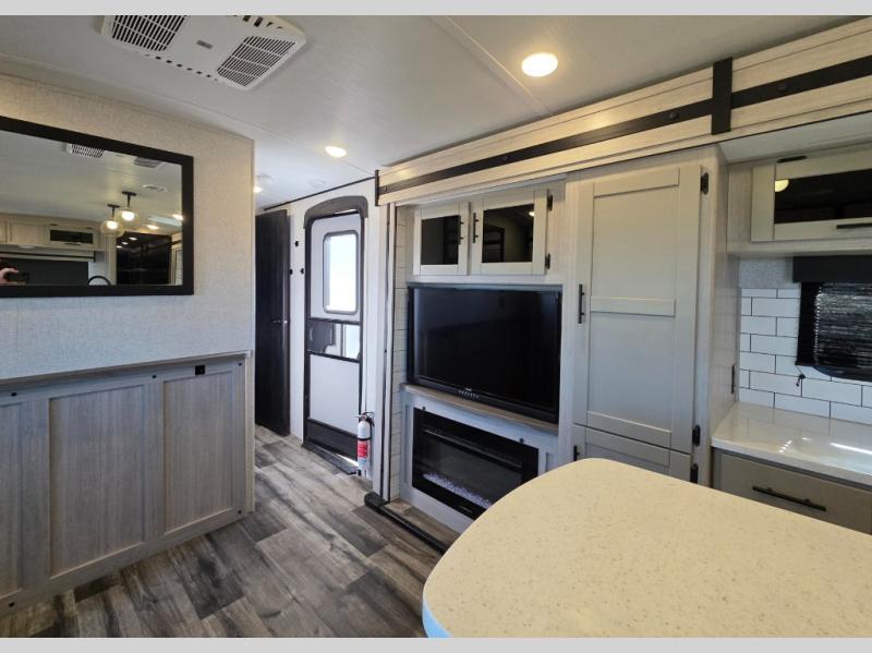 What could be more comfortable than a king bed, dual opposing slides for added space, plus an exterior camp kitchen? You will get all that and more when you choose this spacious travel trailer. The chef of the family will love the kitchen island for added space to cook and clean up, and there is plenty of rear counter space to set out fresh fruits and veggies. The tri-fold sofa sits directly across from the fireplace for a cozy evening indoors, and if you're not needing the extra sleeping space you can choose the optional theater seating in place of the tri-fold sofa. You will truly feel at home in the front private bedroom that includes a king bed, dual wardrobes, plus a third wardrobe in the closet. There is even a pet station that will make camping with your dog easier than ever!