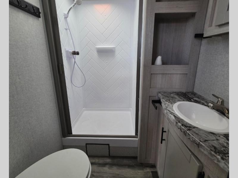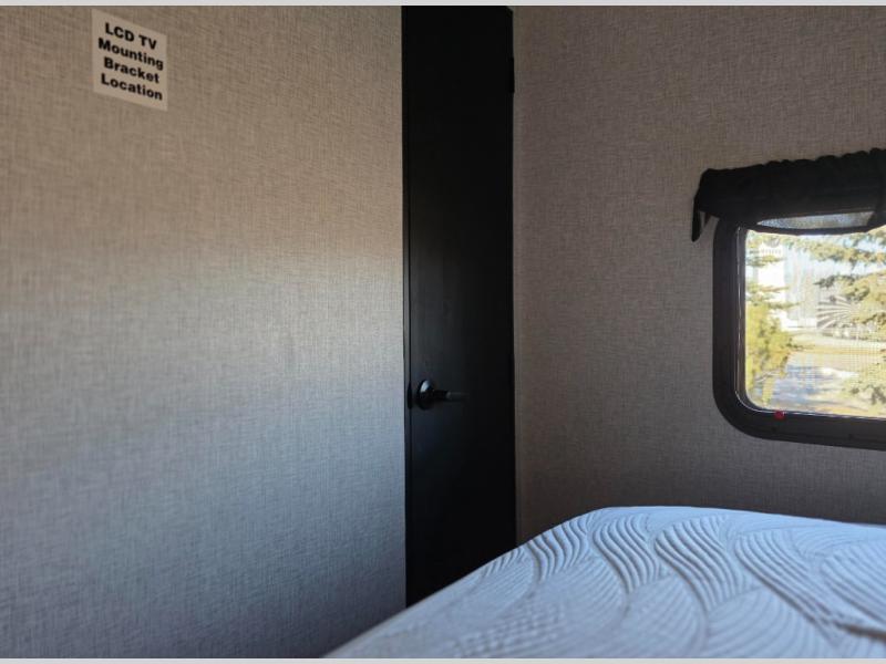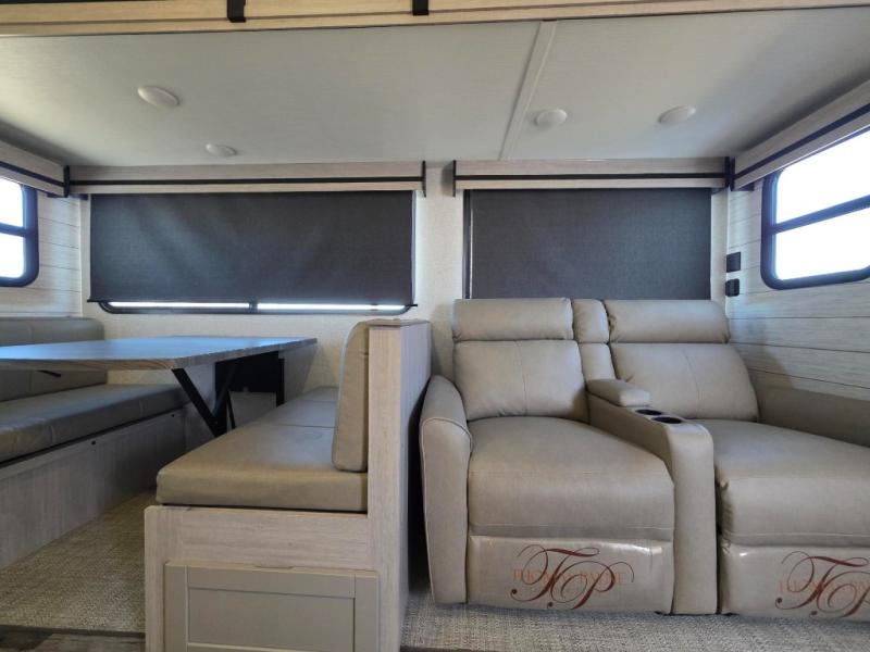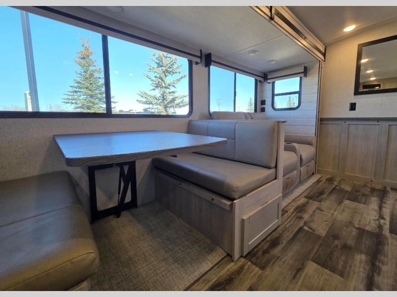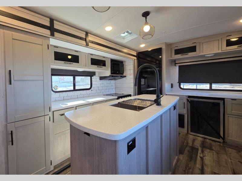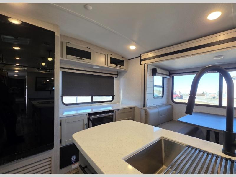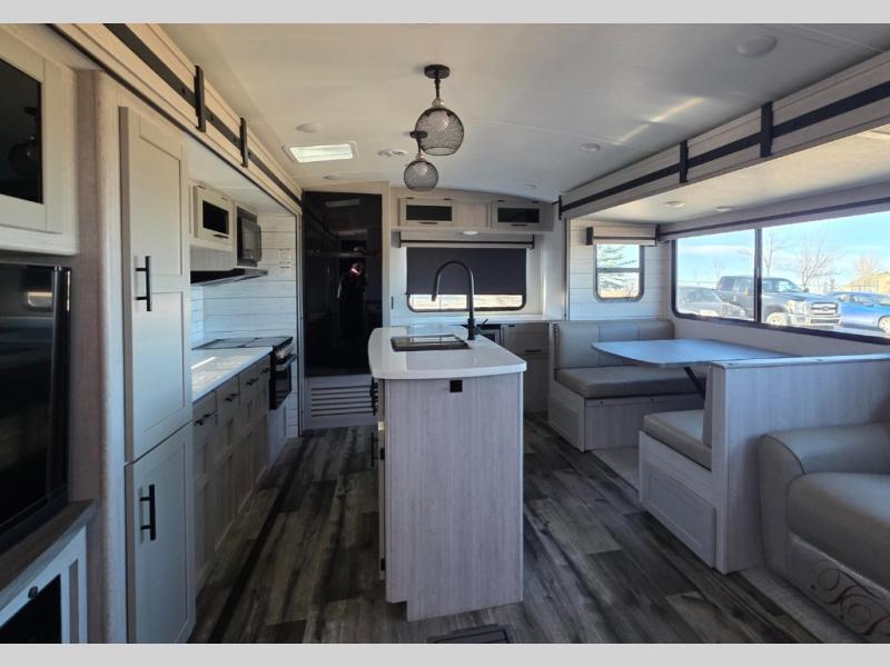 What could be more comfortable than a king bed, dual opposing slides for added space, plus an exterior camp kitchen? You will get all that and more when you choose this spacious travel trailer. The chef of the family will love the kitchen island for added space to cook and clean up, and there is plenty of rear counter space to set out fresh fruits and veggies. The tri-fold sofa sits directly across from the fireplace for a cozy evening indoors, and if you're not needing the extra sleeping space you can choose the optional theater seating in place of the tri-fold sofa. You will truly feel at home in the front private bedroom that includes a king bed, dual wardrobes, plus a third wardrobe in the closet. There is even a pet station that will make camping with your dog easier than ever!