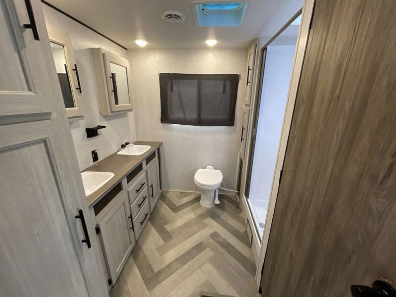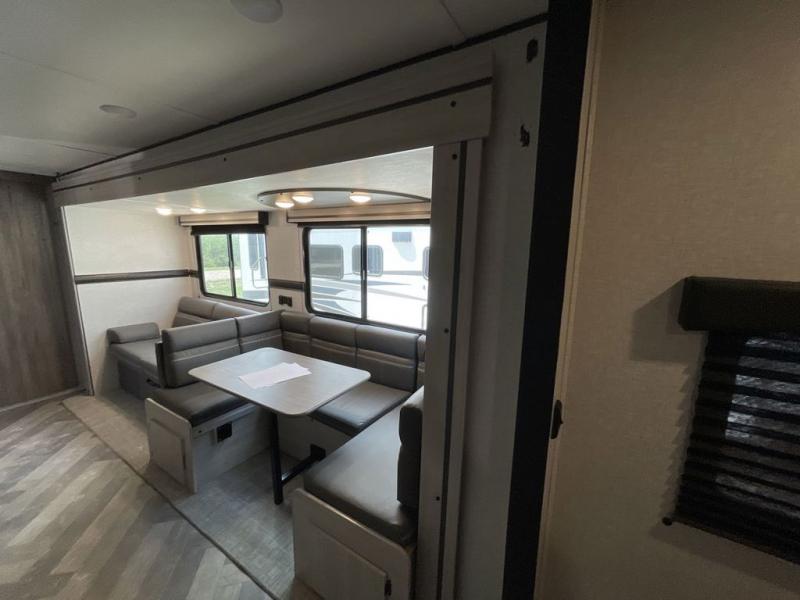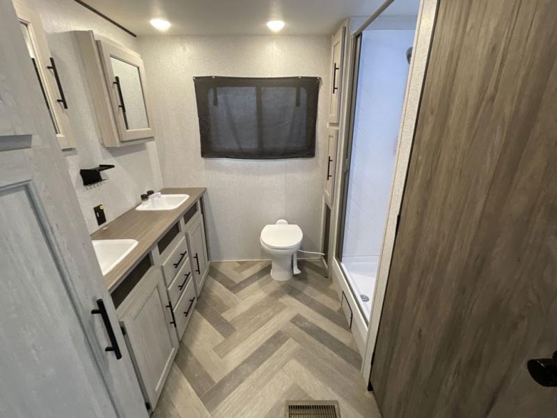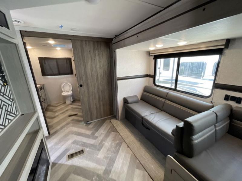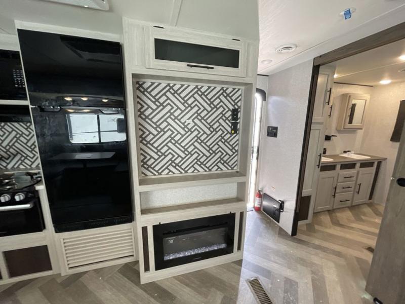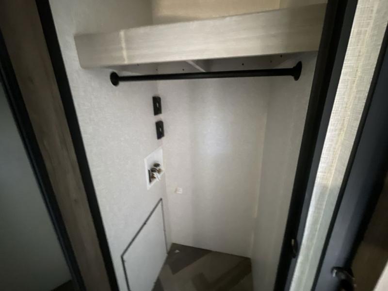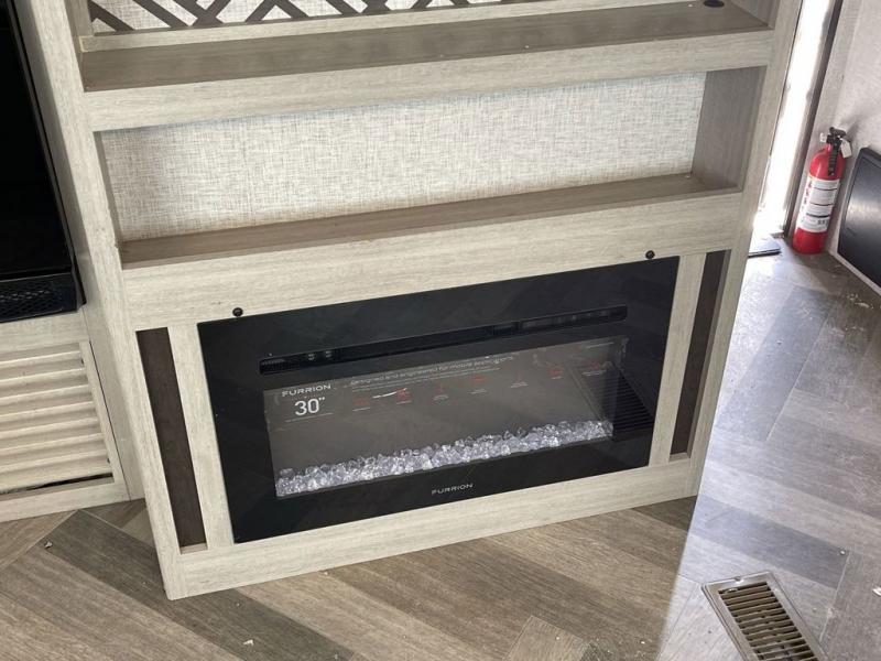 You need this award-winning travel trailer for your next weekend getaway! The full rear bathroom is decked out in features you're going to love like the dual-sink vanity for two to get ready at once, the linen closet next to the 30" x 36" shower and the second linen closet across from the closet that is prepped for the optional washer and dryer to be added. After a fun-filled day outdoors, you can head inside and relax on either the 60" jackknife sofa and enjoy the entertainment center with a fireplace or grab a snack from the 10-cu. ft. refrigerator and play a few card games at the 42" x 80" U-shaped dinette. The front private bedroom features a 60" x 74" RV queen bed with shirt closets on either side of it to keep your clothes looking nice!