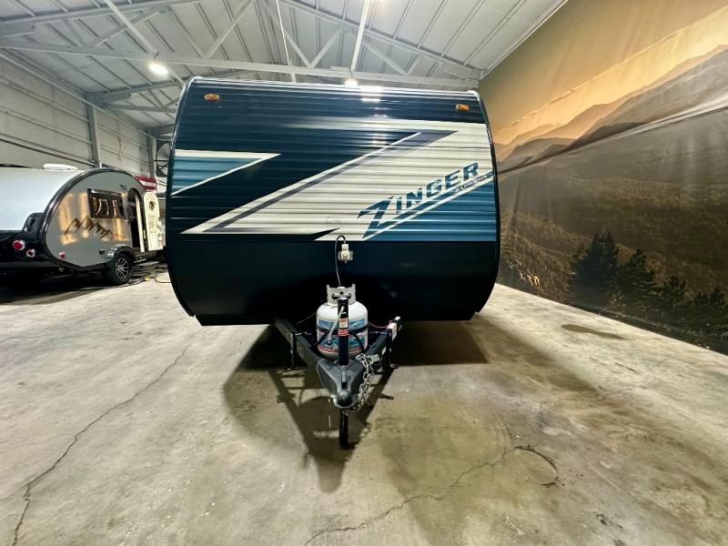 This Zinger Lite travel trailer has everything you need for your next family or friends vacation. With room for five, pack up the kids or some friends for a fun weekend getaway. This unit includes a comfortable RV queen bed with a wardrobe for your clothes. After a day of exploring, kick back on the 60" sofa as you visit with family or enjoy game night at the booth dinette. You will love the rear corner kitchen that includes ample counter space to prepare yummy chocolate chip cookies. This travel trailer has multiple overhead storage compartments and a pantry for your dry goods. You'll feel right at home with a spacious full bath and a medicine cabinet for the first aid kit.