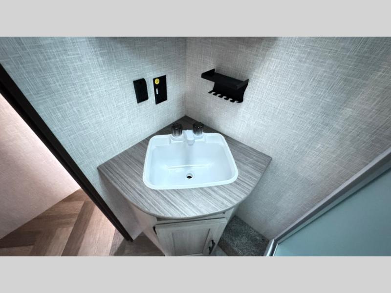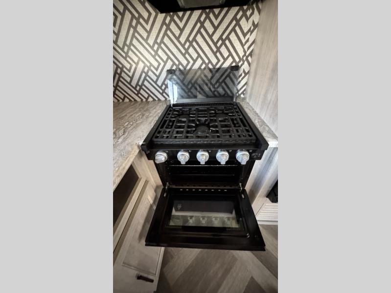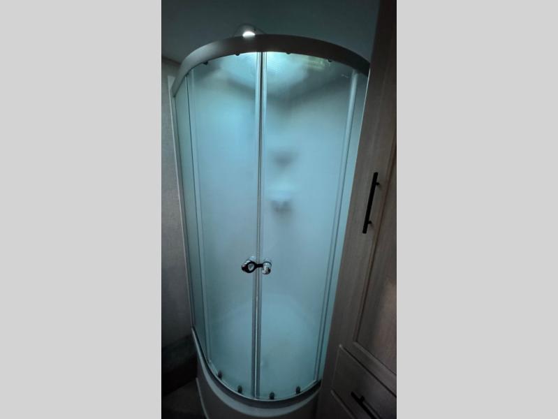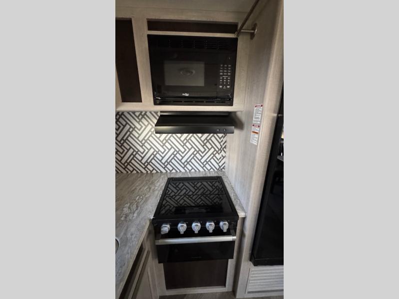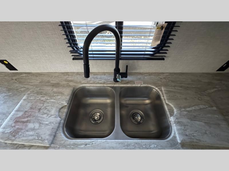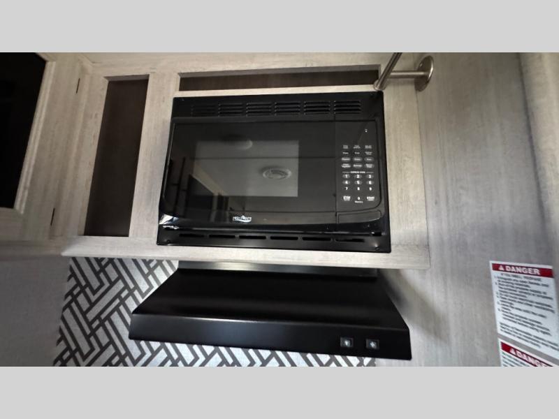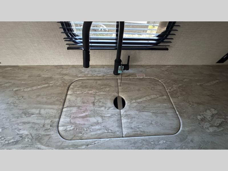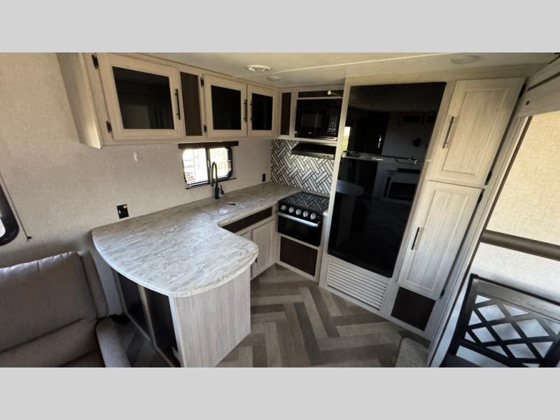 The chef of your group will love cooking in this rear kitchen travel trailer! It not only features a 10-cu. ft. refrigerator, an oven with an LED glass top, and a pressed countertop with a sink cover, but also a stainless steel sink with a stainless steel high-rise faucet and lots of counter space to prep your meals. While the chef is preparing dinner, you can socialize at the U-shaped dinette or 60" jackknife sofa slide while two others sit in the chairs with an end table in between to set a cup of coffee. There is even an outside kitchen, so you can take the fun outdoors while still cooking dinner. The full bathroom has a 34" radius shower with a linen closet next to it for you to grab a towel without dripping water all over the place. Head to the front private bedroom and grab your pajamas from one of the two shirt closets or even from the overhead cabinets above the 60" x 74" RV queen bed!