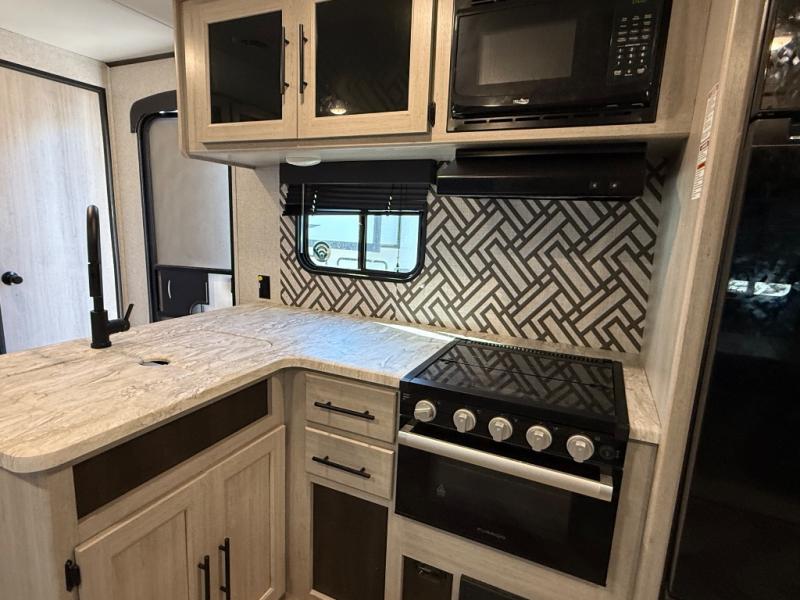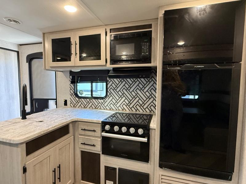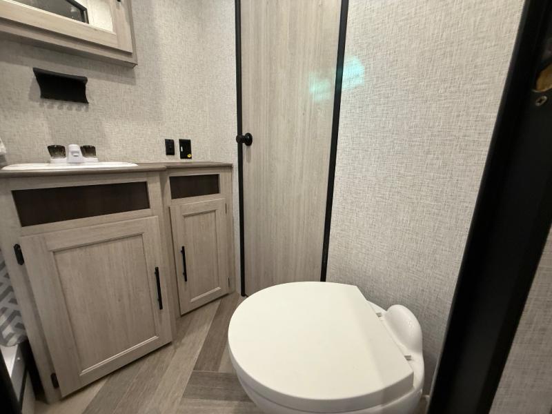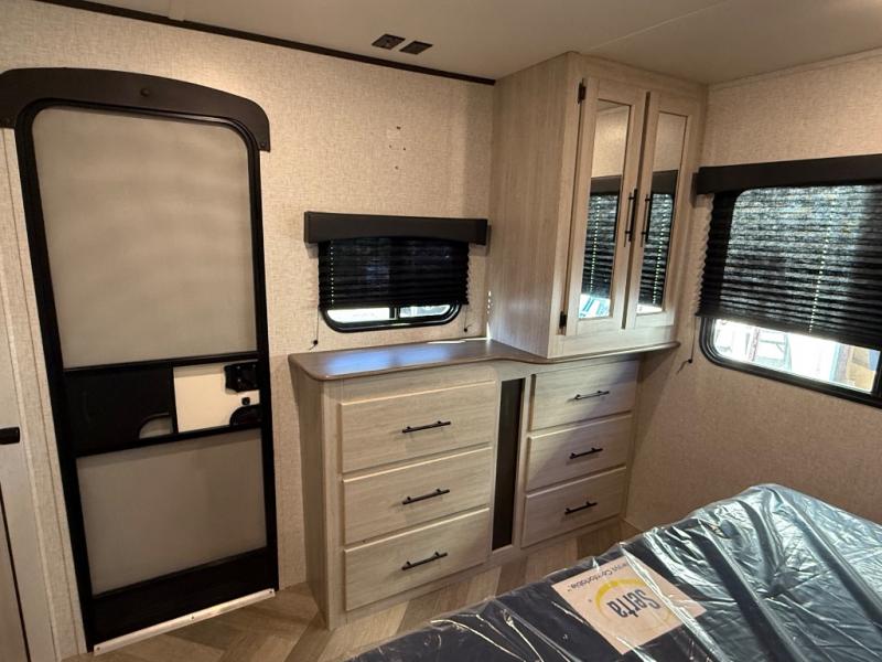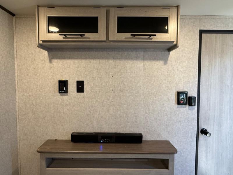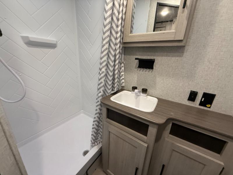 You will feel like royalty camping in this travel trailer! The rear private bedroom features a king bed, a wardrobe next to a dresser to keep your clothes looking nice, a private entrance into the dual-entry bath, and the second entrance/exit to the unit too. You won't believe what the front of this unit has in store for you either - a set of queen-size bunk beds with a wardrobe and a storage area! Just outside the front bedroom is the entertainment center with a fireplace and a 60" jackknife sofa to take an afternoon nap on. The kitchen has everything you will need to whip up a delicious meal, but if you desire some fresh air while you cook then head to the outside kitchen and make dinner there!