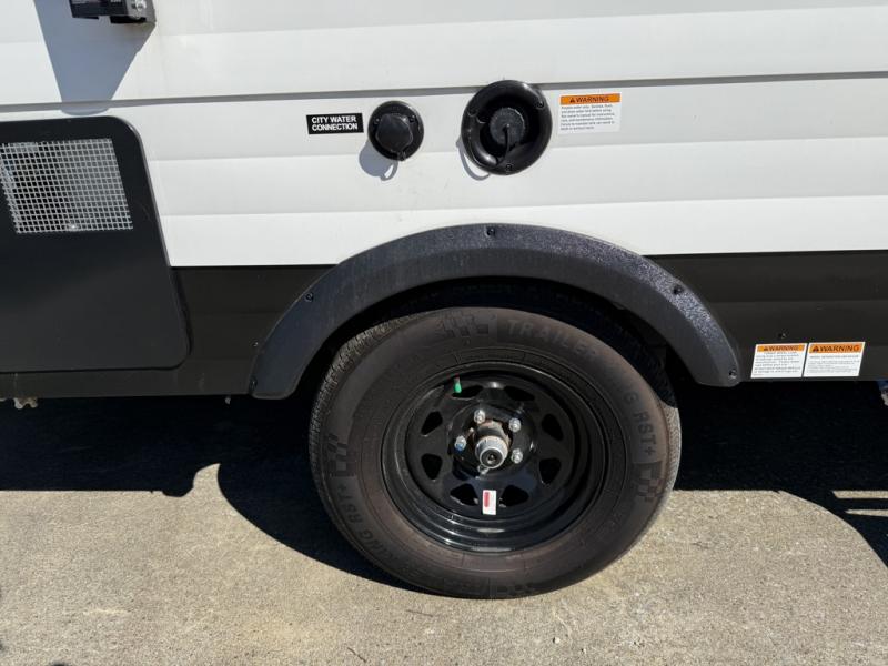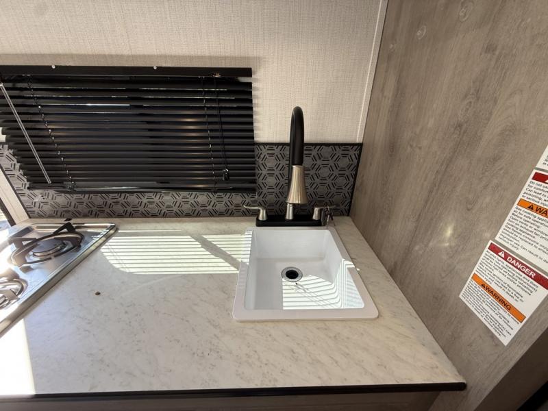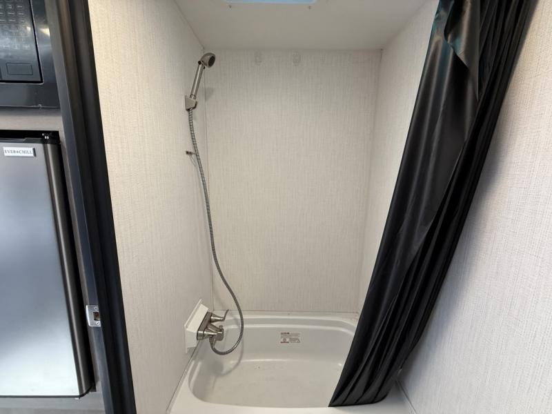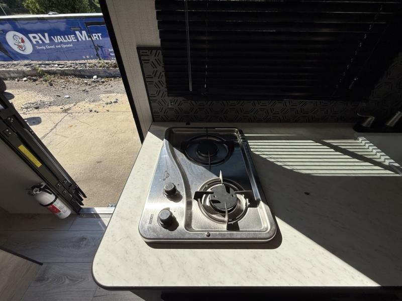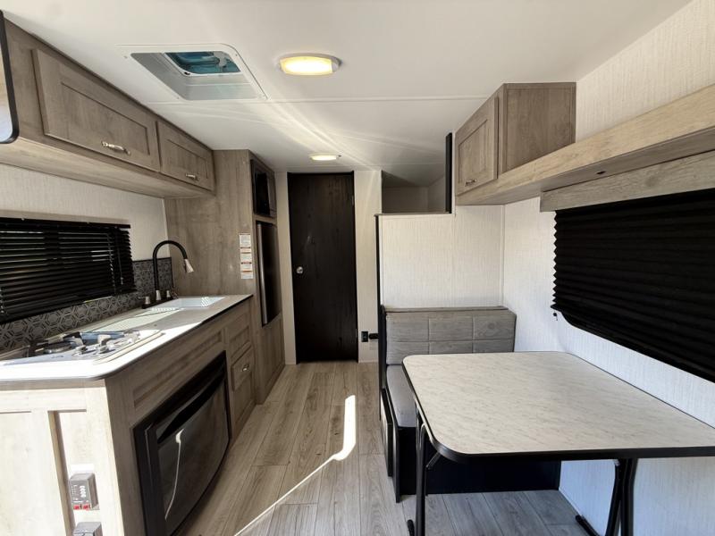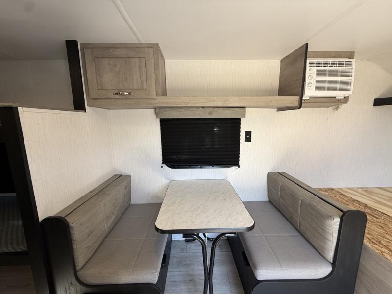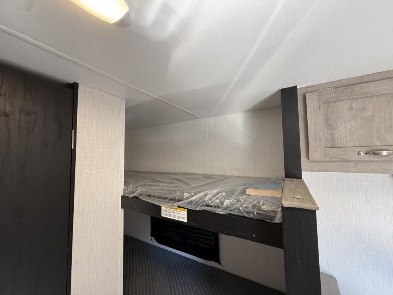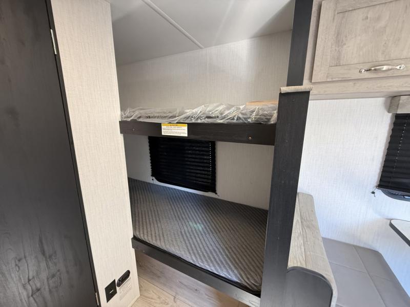 This cozy bunk model has exactly what you need for a fun camping trip to your favorite campgrounds! The rear corner bunks will be a delight for the children, and if there are more than two, you can always fold down the 42" x 76" booth dinette for one or two more depending on size. A queen bed up front will offer comfortable sleeping for two more which means this unit can sleep four to six. The rear corner private shower and toilet will keep you from having to use the campground facilities, and the location next to the bunks is handy for little ones at night. Cooking will also be a breeze with a two burner cooktop, sink, and refrigerator for your perishables so you don't have to rely on cooking over an open fire if you don't want to. Save the fire for the s'mores! You also have a handy awning for outdoor protection, and exterior storage as well.