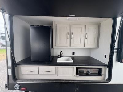 Double slides and double entry doors equal double the fun in this roomy travel trailer. Your kids or added guests will love the rear private bunkhouse that includes one bunk with a folding futon underneath, a bunk above an entertainment center, and a bunk above an exterior kitchen. The full bath is close by and it includes its own exterior entry door for added convenience. Your crew can meet up in the main living area on the tri-fold sofa or at the booth dinette within the large slide out, or you may just want to head outdoors under the 20' power awning with LED lights. The chef can whip up dinner at the exterior kitchen, while the kids grab their scooters from the pass-through storage!