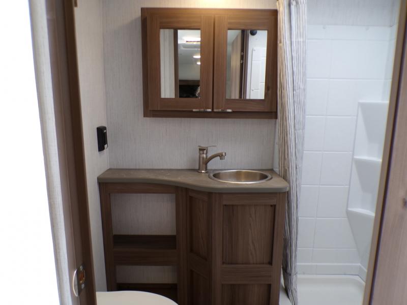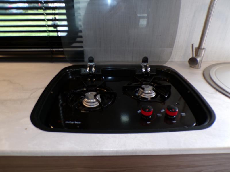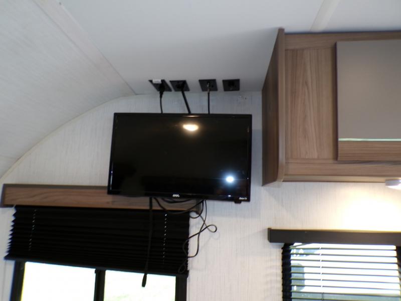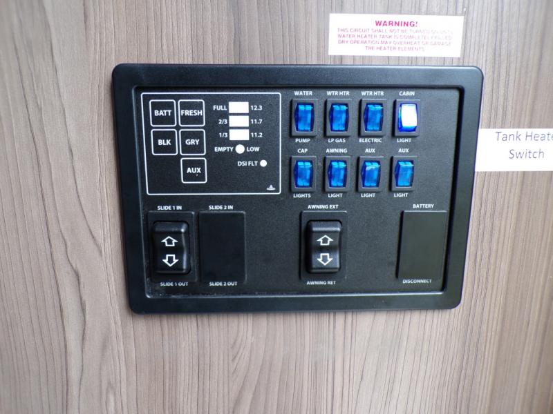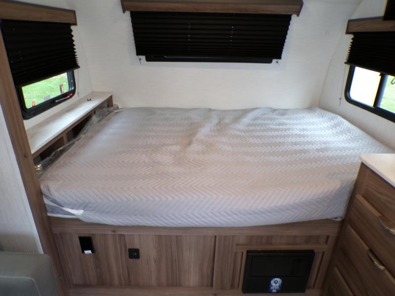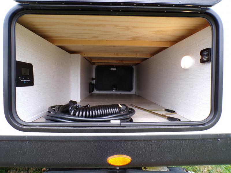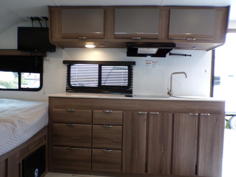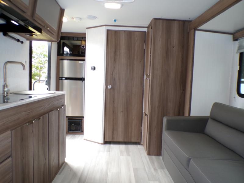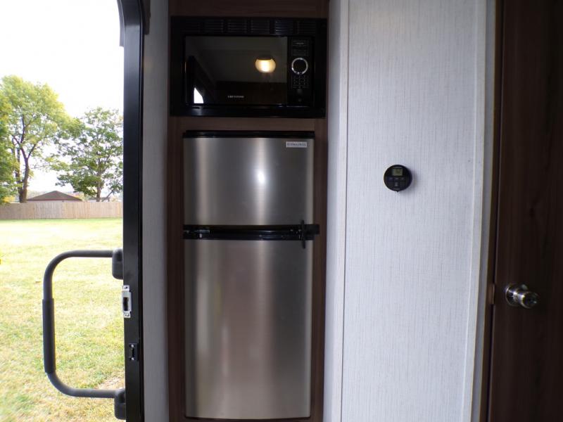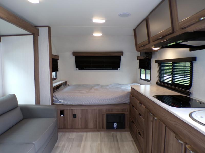 This travel trailer is perfect for a couple who wishes to escape the hustle and bustle of everyday life! Enjoy a good night's rest each night on the front queen bed with drawers below to store your camping essentials. Get squeaky clean each morning in the rear corner bathroom with the neo-angled shower then grab some bacon from the 5 cu. ft. refrigerator and fry it up on the two burner cooktop while you drink a cold glass of orange juice. The sofa slide creates more walking around space, a place for an afternoon nap, and even a sleeping space for an extra guest to tag along. Stay protected by the 12' power awning with LED light and store your outdoor gear in the front exterior full pass-through storage area!