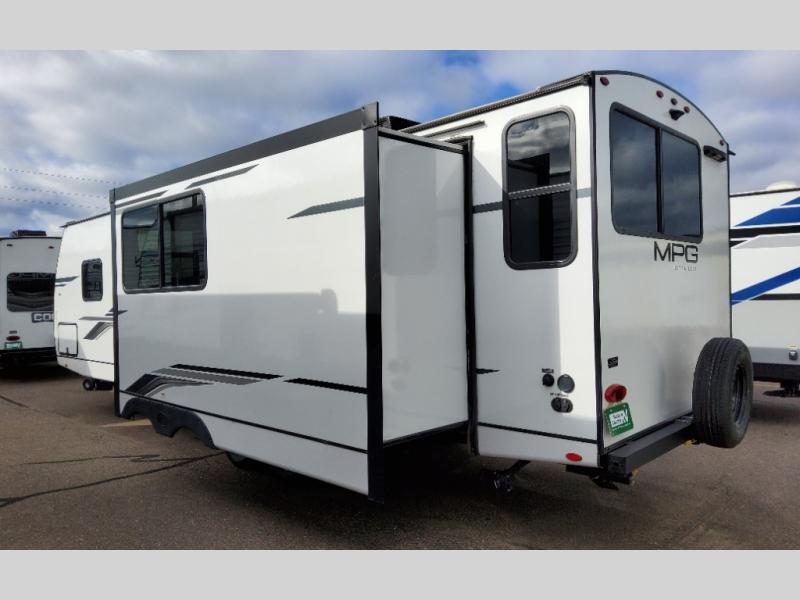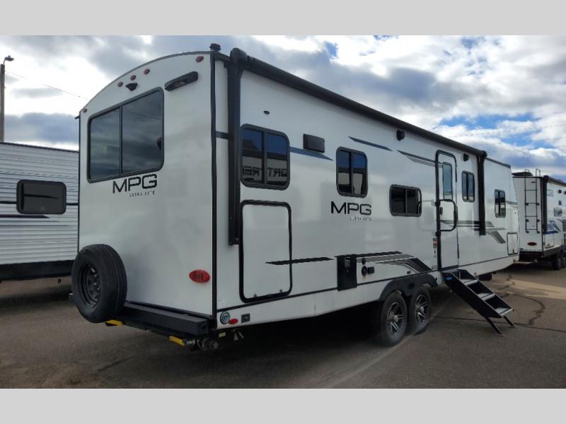 With any MPG travel trailer or toy hauler by Cruiser you will find a 6' 11" barrel roof, Azdel composite laminated walls, and a high gloss fiberglass front cap with LED lighting for a sleek look. There are seamless kitchen countertops and plywood flooring that will be easy to clean, plus residential hardwood cabinets with hidden hinges for a more at-home feel. The slam latch baggage doors with magnetic latches will make loading up easier than ever, plus the pass-through storage includes LED lights you are sure to appreciate. Each model also includes multiple charging stations with 12v and USB ports, a four speaker soundbar system to listen to your playlists, and a dual ducted A/C to keep you cool during those hot summer months!