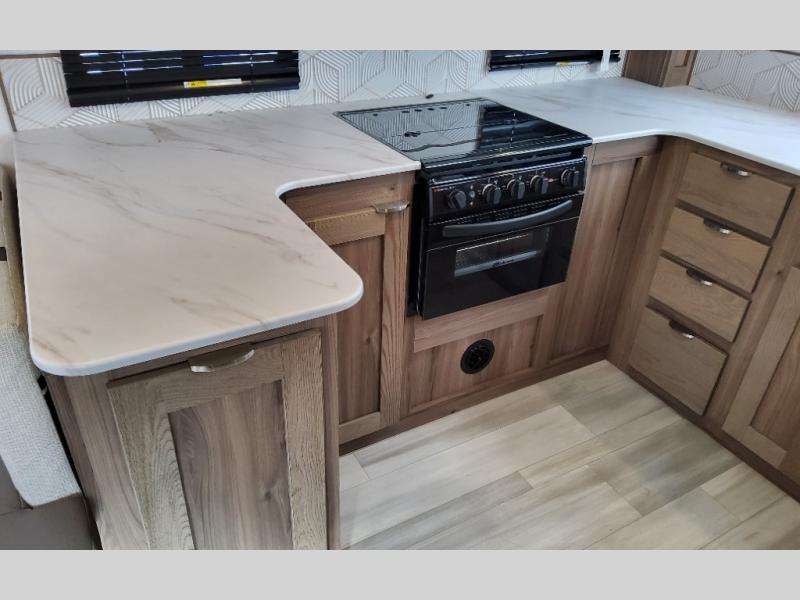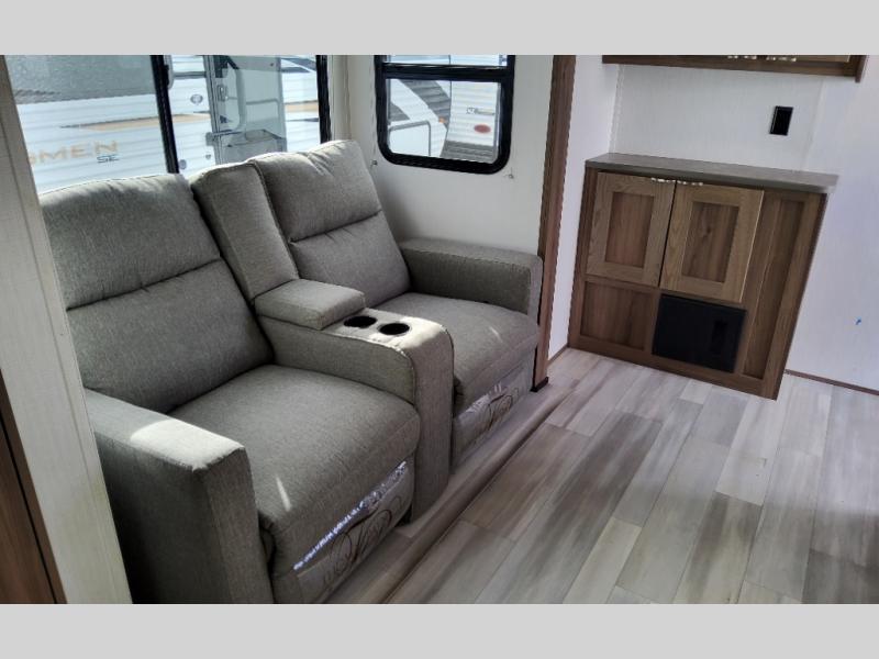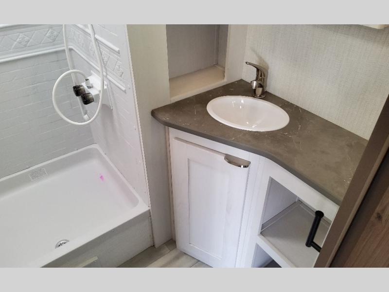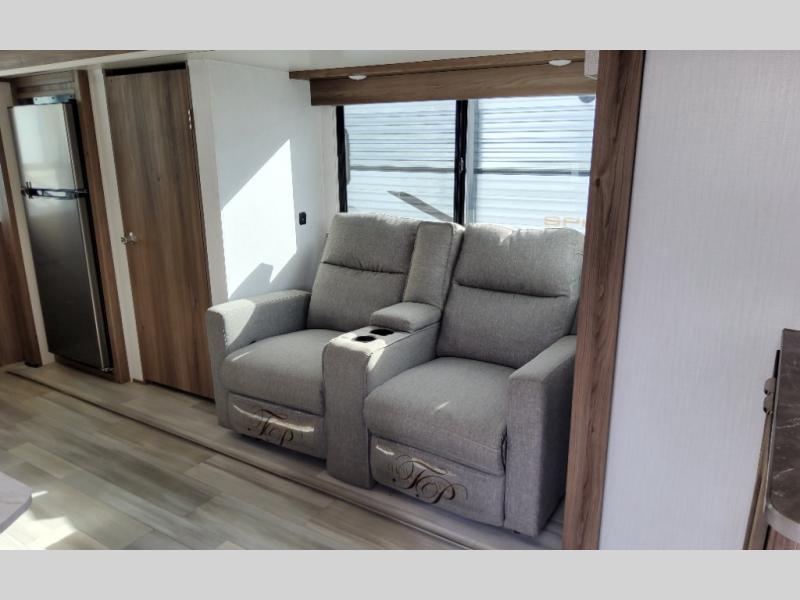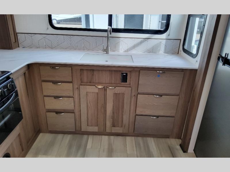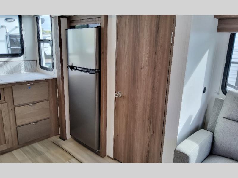Step into this rear kitchen travel trailer for fun in the great outdoors. You will love the amount of counter space you have, plus there is a booth dinette for dining and hanging out. The large slide out opposite provides more floor space, a sofa, a walk-in pantry and refrigerator for your perishables. The front private bedroom will feel just like home with its dual wardrobes, a dresser/wardrobe, plus a sliding king bed for more space to get dressed each morning. And don't forget to relax outside under the 20' awning with LED light, and utilize the outdoor refrigerator and griddle when feeding a crew.