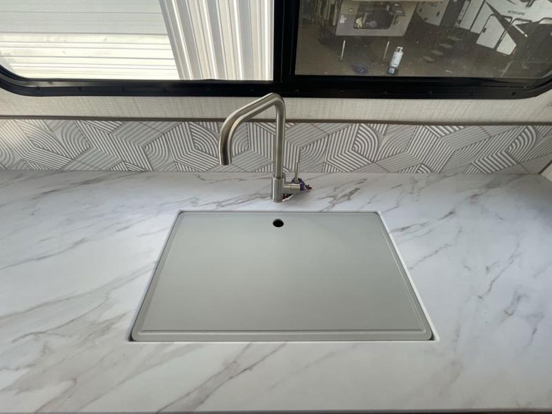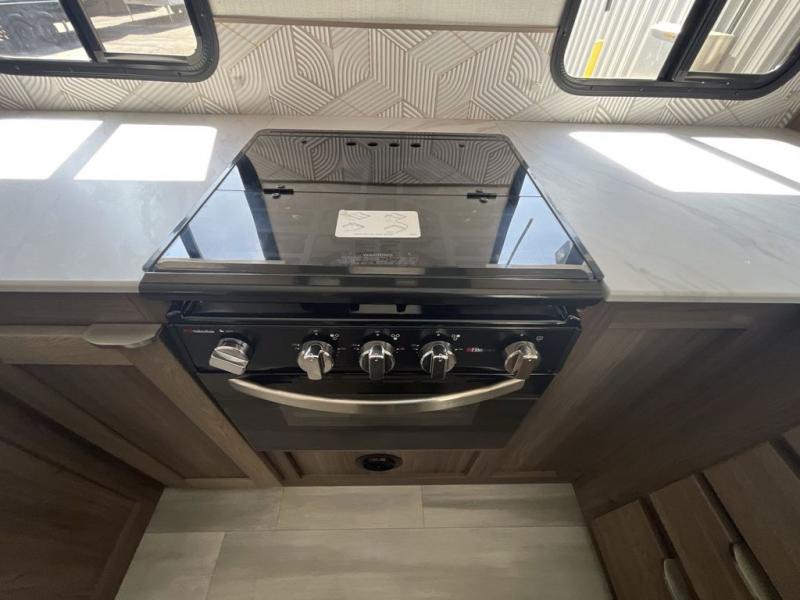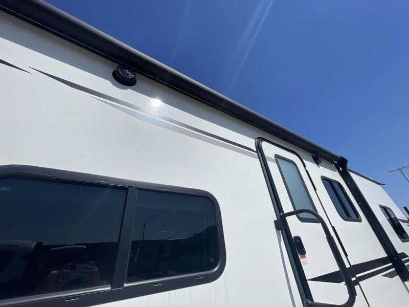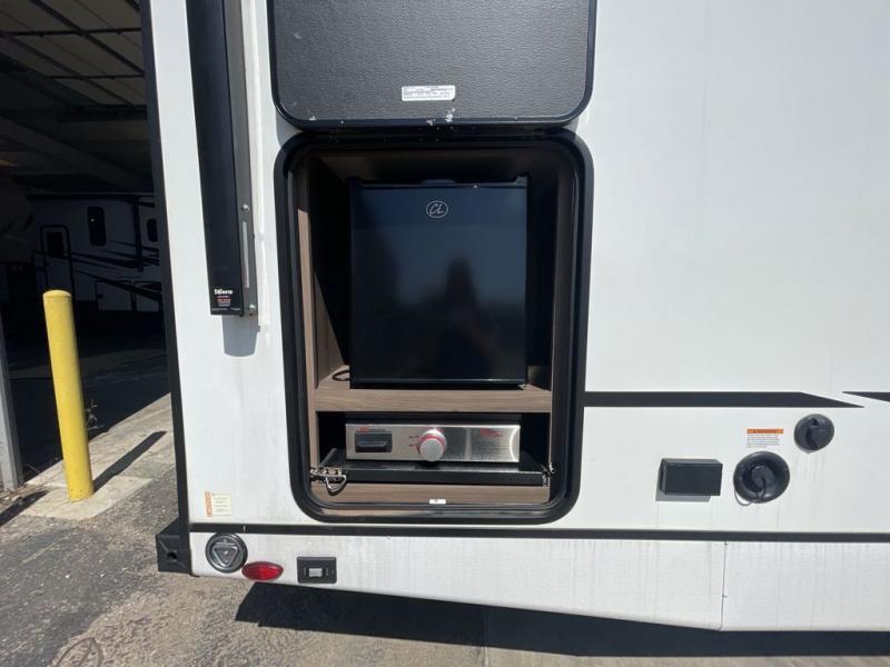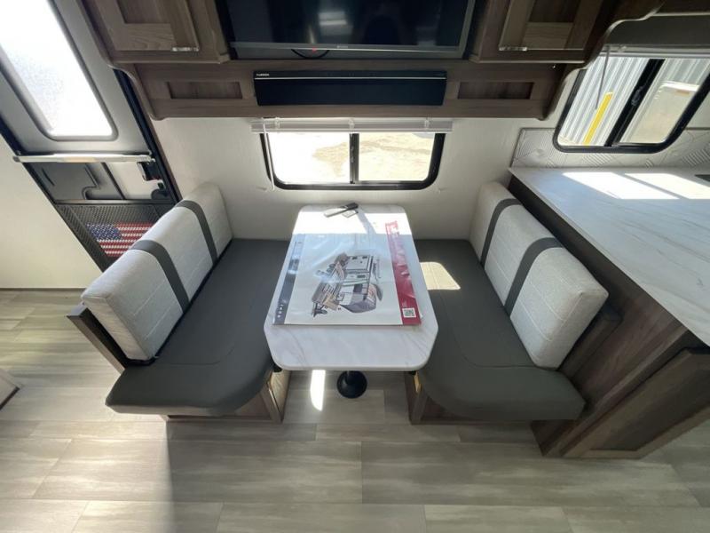 Step into this rear kitchen travel trailer for fun in the great outdoors. You will love the amount of counter space you have, plus there is a booth dinette for dining and hanging out. The large slide out opposite provides more floor space, a sofa, a walk-in pantry and refrigerator for your perishables. The front private bedroom will feel just like home with its dual wardrobes, a dresser/wardrobe, plus a sliding king bed for more space to get dressed each morning. And don't forget to relax outside under the 20' awning with LED light, and utilize the outdoor refrigerator and griddle when feeding a crew.